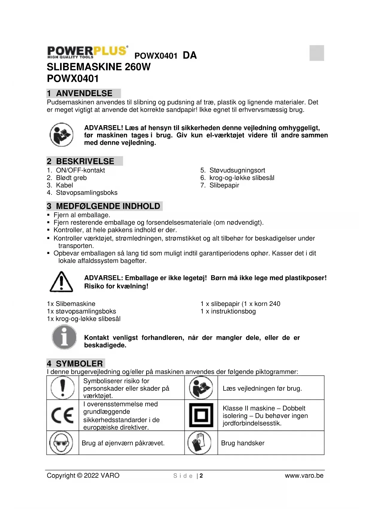 Copyright © 2022 VARO S i d e | 2 www.varo.be SLIBEMASKINE 260W POWX0401 1 ANVENDELSE Pudsemaskinen anvendes til slibning og pudsning af træ, plastik og lignende materialer. Det er meget vigtigt at anvende det korrekte sandpapir! Ikke egnet til erhvervsmæssig brug. ADVARSEL! Læs af hensyn til sikkerheden denne vejledning omhyggeligt, før maskinen tages i brug. Giv kun el-værktøjet videre til andre sammen med denne vejledning. 2 BESKRIVELSE