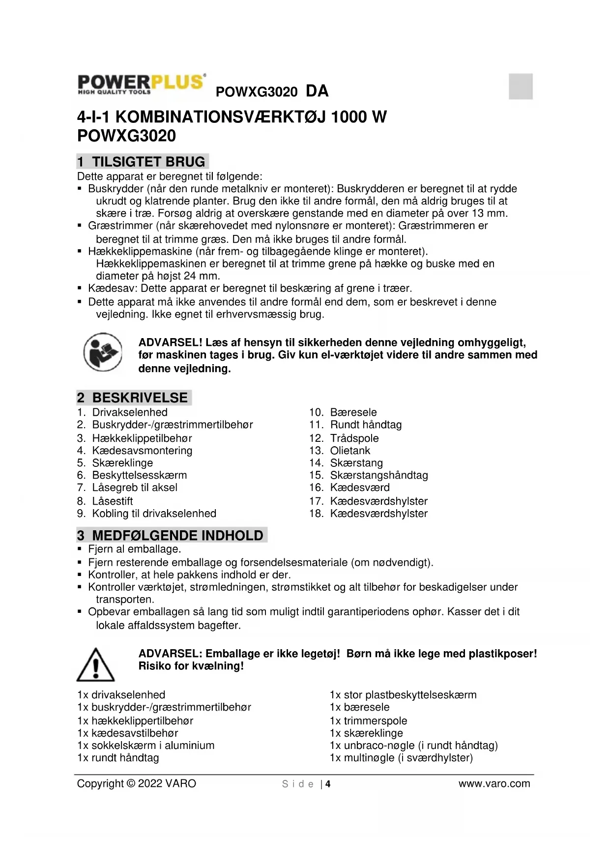 - Opbevar emballagen så lang tid som muligt indtil garantiperiodens ophør. Kasser det i dit lokale affaldssystem bagefter. ADVARSEL: Emballage er ikke legetøj! Børn må ikke lege med plastikposer! Risiko for kvælning! 1x drivakselenhed 1x buskrydder-/græstrimmertilbehør 1x hækkeklippertilbehør 1x kædesavstilbehør 1x sokkelskærm i aluminium 1x rundt håndtag 1x stor plastbeskyttelseskærm 1x bæresele 1x trimmerspole 1x skæreklinge 1x unbraco-nøgle (i rundt håndtag) 1x multinøgle (i sværdhylster)POWXG3020 DA Copyright © 2022 VARO S i d e | 5 www.varo.com 1x skruenøgle 14 mm 1x kæde 8” 1x sværd 8” 1x sværdhylster 1x kædesværdshylster 1x møtrik 14 mm 1x sort skive 1x vejledning Kontakt venligst forhandleren, når der mangler dele, eller de er beskadigede. 4 SYMBOLER I denne brugervejledning og/eller på maskinen anvendes der følgende piktogrammer: