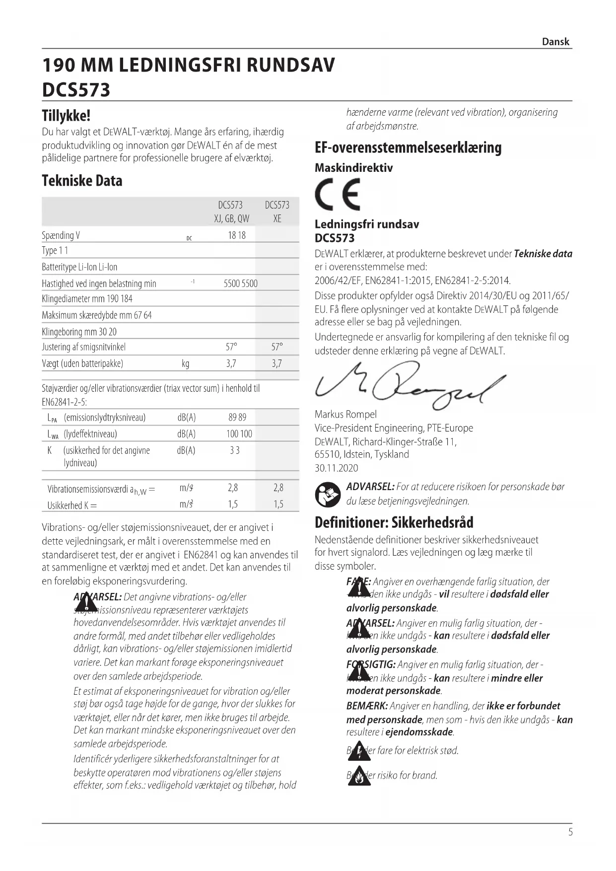 ADVARSEL: For at reducere risikoen for personskade bør du læsebetjeningsvejledningen. Definitioner: Sikkerhedsråd Nedenstående definitioner beskriver sikkerhedsniveauet for hvert signalord. Læs vejledningen og læg mærke til dissesymboler. FARE: Angiver en overhængende farlig situation, der - hvis den ikke undgås - vil resultere i dødsfald eller alvorligpersonskade. ADVARSEL: Angiver en mulig farlig situation, der - hvis den ikke undgås - kan resultere i dødsfald eller alvorligpersonskade. FORSIGTIG: Angiver en mulig farlig situation, der - hvis den ikke undgås - kan resultere i mindre eller moderatpersonskade. BEMÆRK: Angiver en handling, der ikke er forbundet med personskade, men som - hvis den ikke undgås - kan resultere iejendomsskade. Betyder fare for elektriskstød. Betyder risiko forbrand. EF‑overensstemmelseserklæring Maskindirektiv Ledningsfri rundsav DCS573 DeWALT erklærer, at produkterne beskrevet under Tekniske data er i overensstemmelse med: 2006/42/EF, EN62841‑1:2015, EN62841‑2‑5:2014.Disse produkter opfylder også Direktiv 2014/30/EU og 2011/65/EU. Få flere oplysninger ved at kontakte DeWALT på følgende adresse eller se bag påvejledningen.Undertegnede er ansvarlig for kompilering af den tekniske fil og udsteder denne erklæring på vegne afDeWALT.Markus Rompel Vice‑President Engineering, PTE‑Europe DeWALT, Richard‑Klinger‑Straße 11, 65510, Idstein, Tyskland 30.11.2020hænderne varme (relevant ved vibration), organisering afarbejdsmønstre.Vibrations‑ og/eller støjemissionsniveauet, der er angivet i dette vejledningsark, er målt i overensstemmelse med en standardiseret test, der er angivet i EN62841og kan anvendes til at sammenligne et værktøj med et andet. Det kan anvendes til en foreløbigeksponeringsvurdering. ADVARSEL: Det angivne vibrations- og/eller støjemissionsniveau repræsenterer værktøjets hovedanvendelsesområder. Hvis værktøjet anvendes til andre formål, med andet tilbehør eller vedligeholdes dårligt, kan vibrations- og/eller støjemissionen imidlertid variere. Det kan markant forøge eksponeringsniveauet over den samledearbejdsperiode.Et estimat af eksponeringsniveauet for vibration og/eller støj bør også tage højde for de gange, hvor der slukkes for værktøjet, eller når det kører, men ikke bruges til arbejde. Det kan markant mindske eksponeringsniveauet over den samledearbejdsperiode.Identificér yderligere sikkerhedsforanstaltninger for at beskytte operatøren mod vibrationens og/eller støjens effekter, som f.eks.: vedligehold værktøjet og tilbehør, hold DCS573 XJ, GB, QWDCS573 Spænding V 18 18Type 1 1Batteritype Li‑Ion Li‑IonHastighed ved ingen belastning min 5500 5500Klingediameter mm 190 184Maksimum skæredybde mm 67 64Klingeboring mm 30 20Justering af smigsnitvinkel 57° 57° Vægt (uden batteripakke) kg 3,7 3,7 Støjværdier og/eller vibrationsværdier (triax vector sum) i henhold til EN62841‑2‑5: