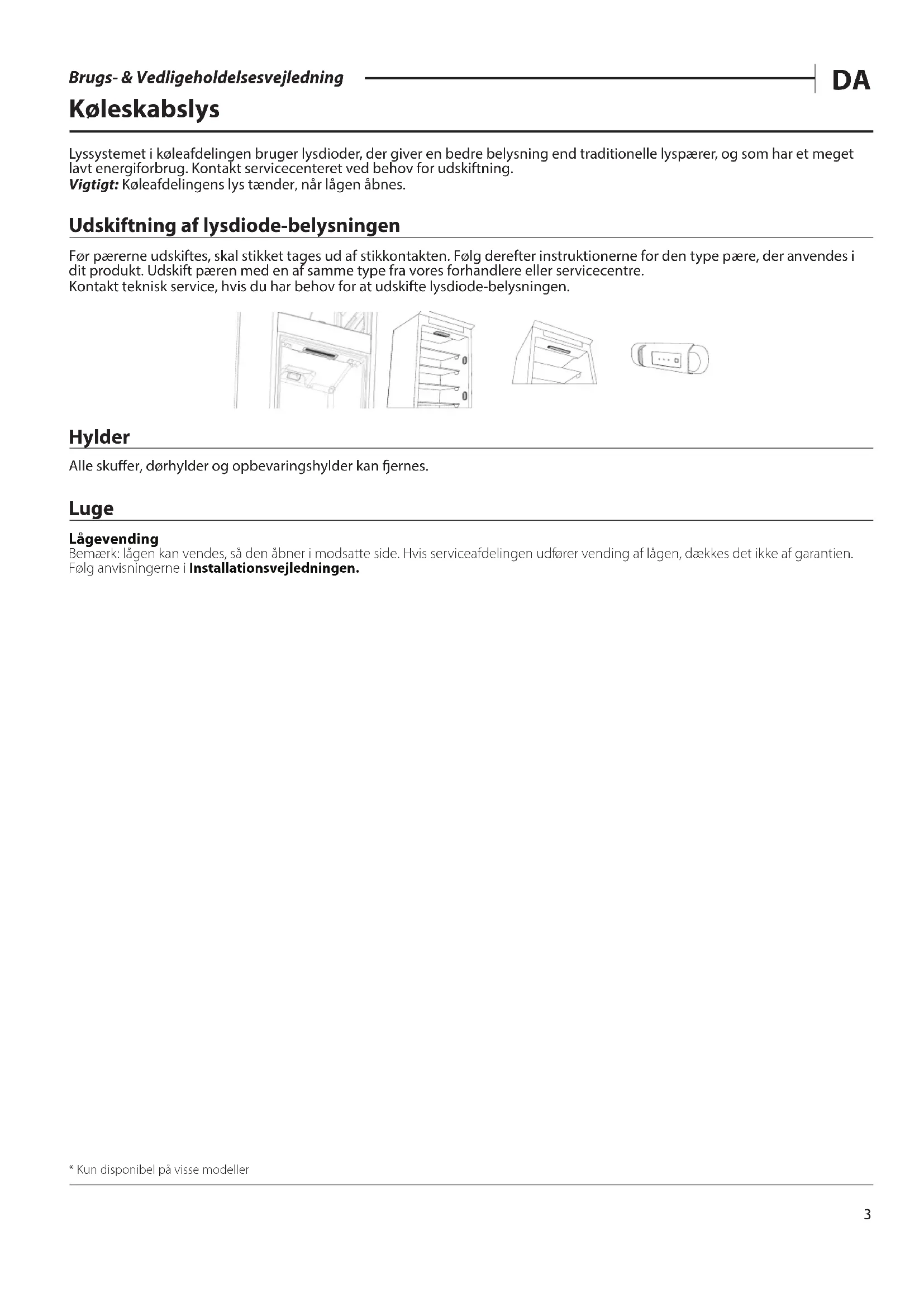 Brugs- & Vedligeholdelsesvejledning Køleskabslys Lyssystemet i køleafdelingen bruger lysdioder, der giver en bedre belysning end traditionelle lyspærer, og som har et meget lavt energiforbrug. Kontakt servicecenteret ved behov for udskiftning. Vigtigt: Køleafdelingens lys tænder, når lågen åbnes. Udskiftning af lysdiode-belysningen Før pærerne udskiftes, skal stikket tages ud af stikkontakten. Følg derefter instruktionerne for den type pære, der anvendes i dit produkt. Udskift pæren med en af samme type fra vores forhandlere eller servicecentre. Kontakt teknisk service, hvis du har behov for at udskifte lysdiode-belysningen. Hylder Alle skuer, dørhylder og opbevaringshylder kan ernes. Luge Lågevending Bemærk: lågen kan vendes, så den åbner i modsatte side. Hvis serviceafdelingen udfører vending af lågen, dækkes det ikke af garantien. Følg anvisningerne i Installationsvejledningen.* Kun disponibel på visse modeller4 Brugs- & Vedligeholdelsesvejledning Brug af apparatet Førstegangsbrug Vent mindst to timer efter installation, før apparatet forbindes til strømforsyningen. Apparatet starter automatisk, når det forbindes til strømforsyningen. De ideelle opbevaringstemperaturer for madvarerne er allerede indstillet på fabrikken. Når du har tændt for apparatet, skal du vente i 4-6 timer for at opnå den korrekte opbevaringstemperatur for et normalt fyldt apparat. Anbring det bakterie- og lugtlteret som vist på dets emballage (hvis lteret ndes). Hvis lydalarmen starter, betyder det, at temperaturalarmen er blevet aktiveret: Tryk på knappen, for at slukke for lydalarmen. Køle- og fødevareopbevaringsafdeling Køleafdelingen er velegnet til opbevaring af friske mad- og drikkevarer. Afrimningen af køleafdelingen er fuldautomatisk. Dannelse af vanddråber på køleafdelingens bagvæg betyder, at den automatiske afrimning er i gang. Afrimningsvandet ledes automatisk via en aøbskanal ud i en beholder, hvor det fordamper. Bemærk: Rumtemperaturen, hvor ofte dørene åbnes og apparatets placering kan påvirke temperaturen i de to afdelinger. Indstil temperaturen i funktion af disse faktorer. Der kan dannes kondens i køleafdelingen, især på glashylderne, hvis luftfugtigheden er meget høj. Hvis dette skulle forekomme, anbefales det at lukke alle beholdere med væske (f.eks. gryder med suppe eller bouillon), pakke madvarer med et højt indhold af væsker ind (f.eks. grøntsager) og tænde for blæseren, hvis der er en. Alle skuer, dørhylder og opbevaringshylder kan ernes. Multiow-luftfordeling Multiowet fremmer en jævn fordeling af den kolde luft i rummet, for en bedre opbevaring af madvarer. Fødevarer kan placeres på enhver hylde i apparatet. Pas på ikke at blokere luftfordelingens åbninger, for herved at sikre dens frie bevægelse. Opbevaring af friske fødevarer og drikkevarer Fødevarer, som afgiver store mængder ætylen gas (æbler, abrikoser, pærer, ferskner, avokadofrugter, gner, blommer, blåbær, meloner, bønner), og dem som er følsomme overfor denne gas, så som frugt, grønsager og salat, bør altid opbevares separat eller indpakket, så deres holdbarhed ikke forkortes; for eksempel, bør tomater ikke opbevares sammen med kiwifrugter eller kål. Opbevar ikke fødevarer for tæt sammen for at tillade tilstrækkelig luftcirkulation. Brug genanvendelige plast-, metal-, aluminiums- og glasbeholdere og lm til at indpakke fødevarerne. Hvis der kun opbevares en lille mængde fødevarer i køleskabet, anbefaler vi at bruge hylderne lige over frugt-/ grønsagsskuen, da dette er det køligste område. Brug altid lukkede beholdere til drikkevarer og fødevarer, der kan afgive eller være behæftet med stærk lugt eller smag eller tildæk dem. Brug askeholderen for at undgå, at asker vælter (tilgængelig på udvalgte modeller).
