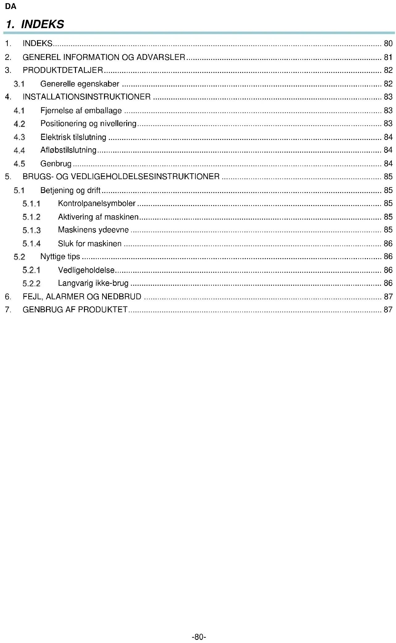 Denne manual er udarbejdet for at hjælpe dig med at forstå betjening, installation og vedligeholdelse af maskinen. Den indeholder alle de nødvendige informationer og advarsler for at sikre, at apparatet installeres og bruges korrekt, sammen med information om de egenskaber og muligheder, der tilbydes, så du kan få det fulde udbytte af din maskine.