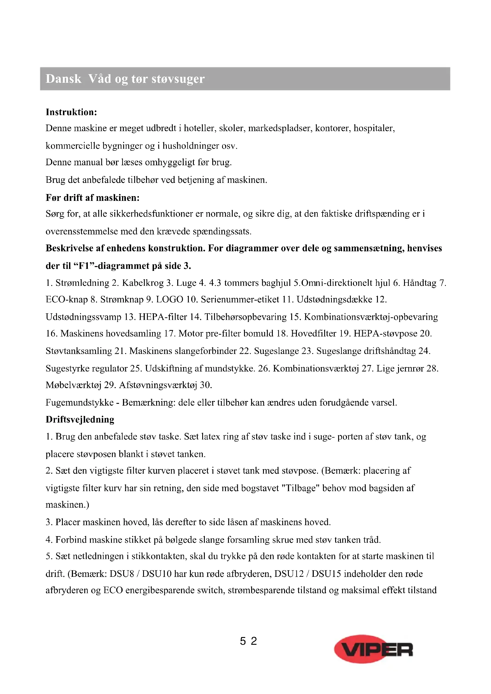 način prenašanja s shranjevanjem dodatkov pa najdete na slikah F5 Diagram omrežnih povezav: DSU8/DSU10 diagram omrežnih povezav najdete na F8. DSU12/DSU15 diagram omrežnih povezav najdete na rdečiF9. Parameter specifikacije izdelka Za specifikacijski parameter glejte "F10".. 51Dansk Våd og tør støvsuger Instruktion: Denne maskine er meget udbredt i hoteller, skoler, markedspladser, kontorer, hospitaler, kommercielle bygninger og i husholdninger osv. Denne manual bør læses omhyggeligt før brug. Brug det anbefalede tilbehør ved betjening af maskinen. Før drift af maskinen: Sørg for, at alle sikkerhedsfunktioner er normale, og sikre dig, at den faktiske driftspænding er i overensstemmelse med den krævede spændingssats. Beskrivelse af enhedens konstruktion. For diagrammer over dele og sammensætning, henvises der til “F1”-diagrammet på side 3.