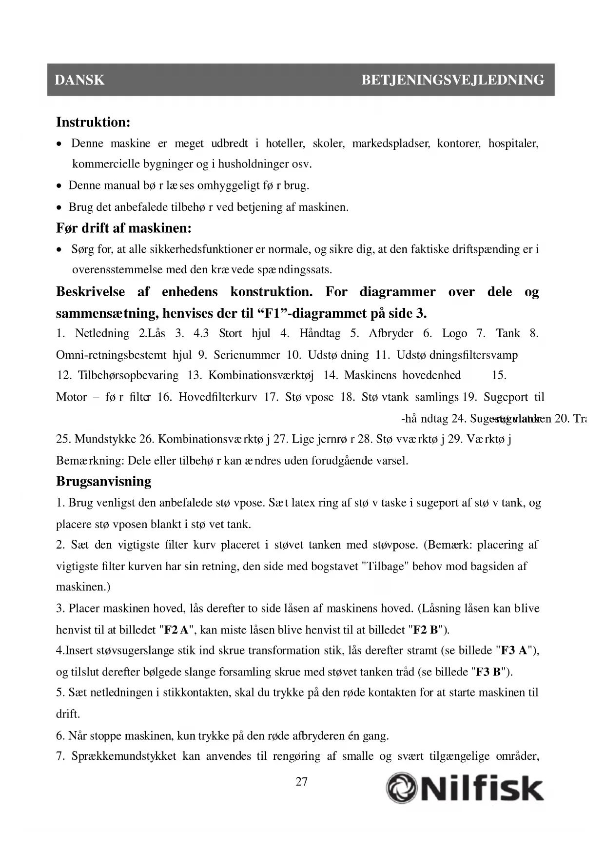 Instruktion: Denne maskine er meget udbredt i hoteller, skoler, markedspladser, kontorer, hospitaler, kommercielle bygninger og i husholdninger osv. Denne manual bør læses omhyggeligt før brug. Brug det anbefalede tilbehør ved betjening af maskinen. Før drift af maskinen: Sørg for, at alle sikkerhedsfunktioner er normale, og sikre dig, at den faktiske driftspænding er i overensstemmelse med den krævede spændingssats. Beskrivelse af enhedens konstruktion. For diagrammer over dele og sammensætning, henvises der til “F1”-diagrammet på side 3.