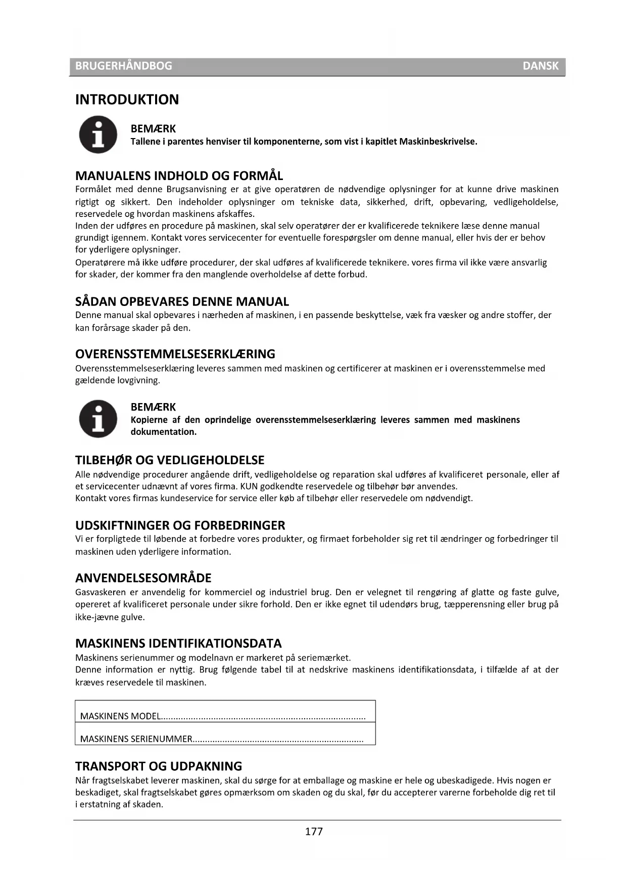Vi er forpligtede til løbende at forbedre vores produkter, og firmaet forbeholder sig ret til ændringer og forbedringer til maskinen uden yderligere information. ANVENDELSESOMRÅDE Gasvaskeren er anvendelig for kommerciel og industriel brug. Den er velegnet til rengøring af glatte og faste gulve, opereret af kvalificeret personale under sikre forhold. Den er ikke egnet til udendørs brug, tæpperensning eller brug på ikke-jævne gulve. MASKINENS IDENTIFIKATIONSDATA Maskinens serienummer og modelnavn er markeret på seriemærket. Denne information er nyttig. Brug følgende tabel til at nedskrive maskinens identifikationsdata, i tilfælde af at der kræves reservedele til maskinen. MASKINENS MODEL.................................................................................. MASKINENS SERIENUMMER.....................................................................