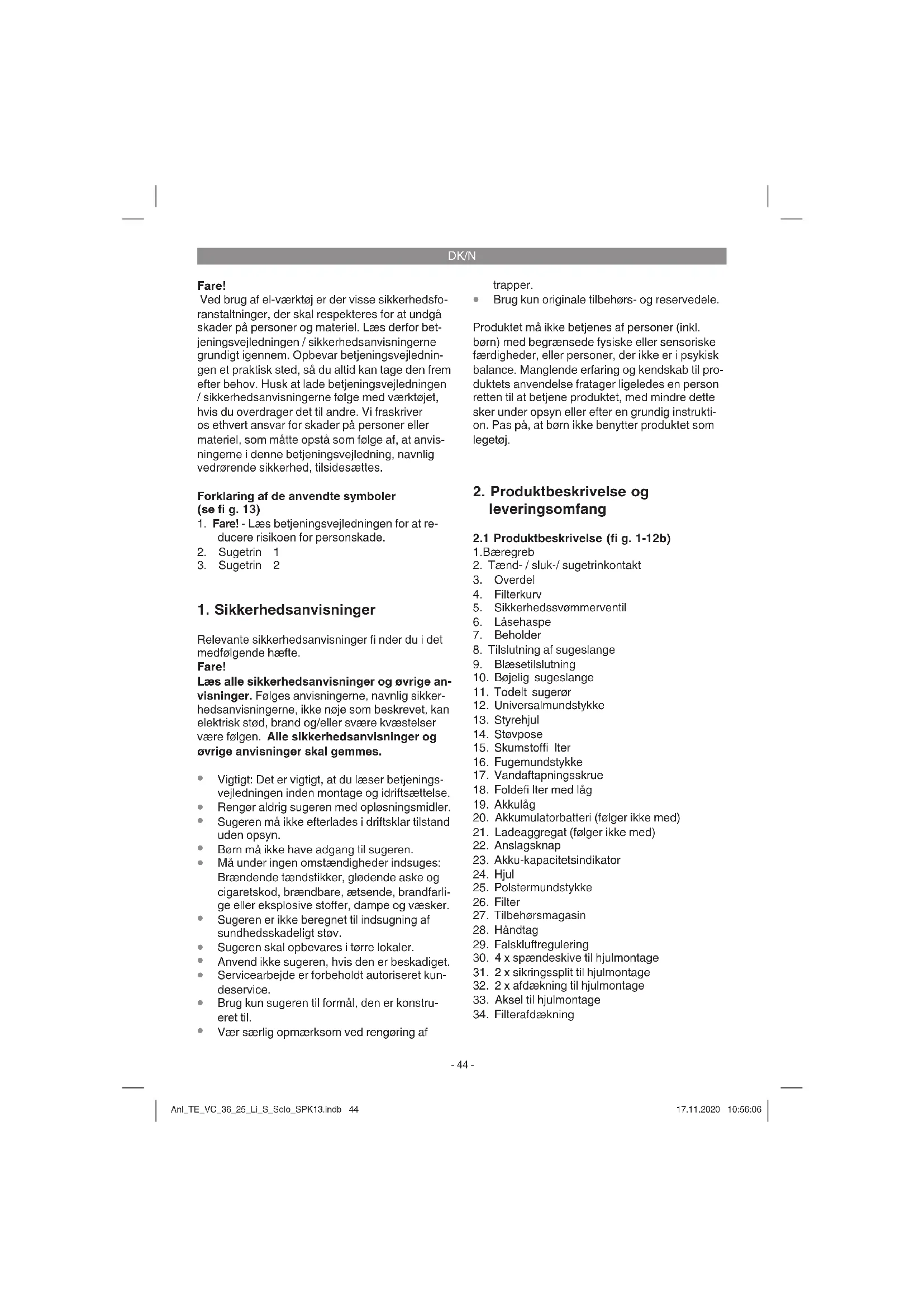 Bemærk! Våd-/tørsugeren må aldrig benyttes uden fi ltre! Vær altid opmærksom på, om fi ltrene sidder or- dentligt fast! Montering af skumstoffi lter (fi g. 6/15) Til vådsugning trækkes det medfølgende skumstoffi lter (15) hen over fi lterkurven (fi g. 3/4). Montering af foldefi lter (fi g. 7) Til tørsugning presses foldefi ltret (18) på fi lterkur- ven (fi g. 3/4). Foldefi ltret egner sig udelukkende til tørsugning! Montering af støvpose (fi g. 9/14) Til opsugning af fi nt, tørt støv anbefales det at Anl_TE_VC_36_25_Li_S_Solo_SPK13.indb 45Anl_TE_VC_36_25_Li_S_Solo_SPK13.indb 45 17.11.2020 10:56:0617.11.2020 10:56:06DK/N