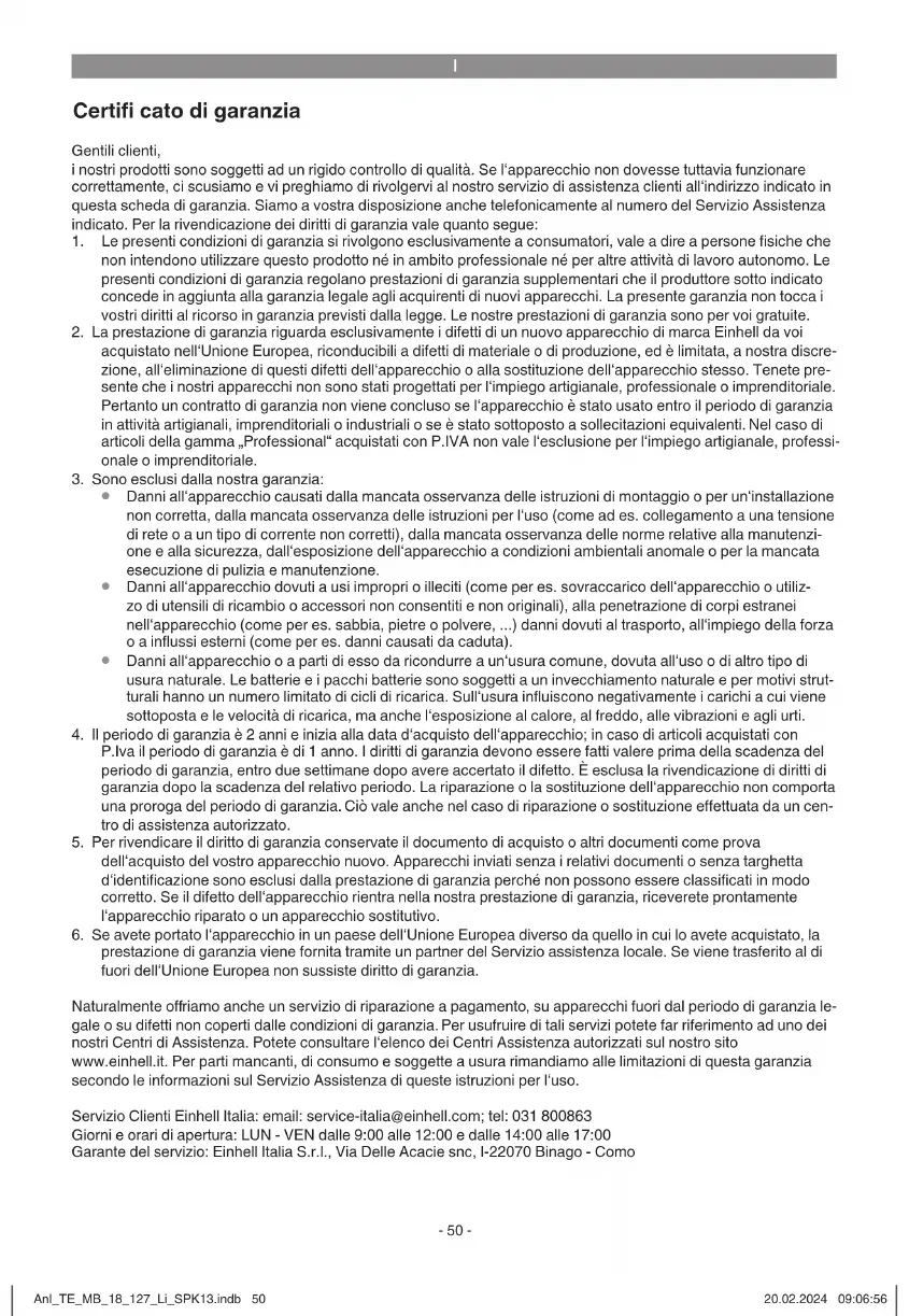 hvor produktet er købt, ydes garanti af en lokal servicepartner. Tages produktet med til et land uden for den Europæiske Union, bortfalder garantikravet. Mod betaling udbedrer vi naturligvis også gerne defekter på produktet, som ikke/ikke længere er omfat- tet af garantien. Du skal blot indsende produktet til vores serviceadresse. Hvad angår slid- og forbrugs- dele samt manglende dele henviser vi til garantiens indskrænkninger i henhold til serviceinformationer- ne i nærværende betjeningsvejledning. Garant/ Service: Einhell Nordic A/S, Rokhøj 26, 8520 Lystrup, Denmark Anl_TE_MB_18_127_Li_SPK13.indb 60Anl_TE_MB_18_127_Li_SPK13.indb 60 20.02.2024 09:06:5920.02.2024 09:06:59S