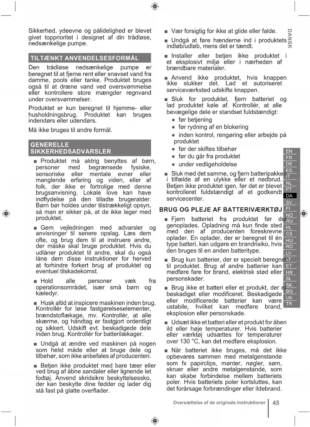 Den trådløse nedsænkelige pumpe er beregnet til at fjerne rent eller snavset vand fra damme, pools eller tanke. Produktet bruges også til at dræne vand ved oversvømmelse eller kontrollere store mængder regnvand under oversvømmelser. Produktet er kun beregnet til hjemme- eller husholdningsbrug. Produktet kan bruges indendørs eller udendørs. Må ikke bruges til andre formål. GENERELLE SIKKERHEDSADVARSLER ■ Produktet må aldrig benyttes af børn, personer med begrænsede fysiske, sensoriske eller mentale evner eller manglende erfaring og viden, eller af folk, der ikke er fortrolige med denne brugsanvisning. Lokale love kan have indflydelse på den tilladte brugeralder. Børn bør holdes under tilstrækkeligt opsyn, så man er sikker på, at de ikke leger med produktet. ■ Gem vejledningen med advarsler og anvisninger til senere opslag. Læs dem ofte, og brug dem til at instruere andre, der måske skal bruge produktet. Hvis du udlåner produktet til andre, skal du også låne dem disse instruktioner for herved at forhindre forkert brug af produktet og eventuel tilskadekomst. ■ Hold alle personer væk fra operationsområdet, især små børn og kæledyr. ■ Husk altid at inspicere maskinen inden brug. Kontrollér for løse fastgørelseselementer, brændstoflækage, mv. Kontrollér, at alle skærme, og håndtag er fastgjort ordentligt og sikkert. Udskift evt. beskadigede dele inden brug. Kontrollér for batterilækager. ■ Undgå at ændre ved maskinen på nogen som helst måde eller at bruge dele og tilbehør, som ikke anbefales af producenten. ■ Betjen ikke produktet med bare tæer eller ved brug af åbne sandaler eller lignende let fodtøj. Anvend skridsikre beskyttelsessko, der kan beskytte dine fødder og lader dig stå fast på glatte overflader. ■ Vær forsigtig for ikke at glide eller falde. ■ Undgå at føre hænderne ind i produktets indløb/udløb, mens det er tændt. ■ Installer eller betjen ikke produktet i et eksplosivt miljø eller i nærheden af brændbare materialer. ■ Anvend ikke produktet, hvis knappen ikke slukker det. Lad et autoriseret serviceværksted udskifte knappen. ■ Sluk for produktet, fjern batteriet og lad produktet køle af. Kontrollér, at alle bevægelige dele er standset fuldstændigt: ● før betjening ● før rydning af en blokering ● inden kontrol, rengøring eller arbejde på produktet ● før der skiftes tilbehør ● før du går fra produktet ● under vedligeholdelse ■ Sluk med det samme, og fjern batteripakken i tilfælde af en ulykke eller et nedbrud. Betjen ikke produktet igen, før det er blevet kontrolleret fuldstændigt af et godkendt servicecenter. BRUG OG PLEJE AF BATTERIVÆRKTØJ ■ Fjern batteriet fra produktet før det genoplades. Opladning må kun finde sted med den af producenten foreskrevne oplader. En oplader, der er beregnet til én type batteri, kan udgøre en brandrisiko, hvis den bruges til en anden batteritype. ■ Brug kun batterier, der er specielt beregnet til produktet. Brug af andre batterier kan medføre fare for brand, elektrisk stød eller personskader. ■ Brug ikke et batteri eller et produkt, der er beskadiget eller modificeret. Beskadigede eller modificerede batterier kan være ustabile, hvilket kan medføre brand, eksplosion eller personskade. ■ Udsæt ikke et batteri eller et produkt for åben ild eller høje temperaturer. Hvis batterier eller værktøj udsættes for temperaturer over 130 °C, kan det medføre eksplosion. ■ Når batteriet ikke bruges, må det ikke opbevares sammen med metalgenstande som fx papirclips, mønter, nøgler, søm, skruer eller andre metalgenstande, som kan skabe forbindelse mellem batteriets poler. Hvis batteriets poler kortsluttes, kan det forårsage forbrændinger eller ildebrand.46 Oversættelse af de originale instruktioner ■ Væske kan sprøjte ud fra batteriet ved misbrug af produktet. Undgå kontakt. Ved kontakt med batterivæsken skylles der med vand. Hvis der kommer væske i øjnene, kontaktes læge straks. Udsprøjtet batterivæske kan forårsage irritation eller forbrændinger. ■ Fjern udtjente batterier fra produktet og bortskaf dem på sikker vis. SIKKERHEDSADVARSLER FOR