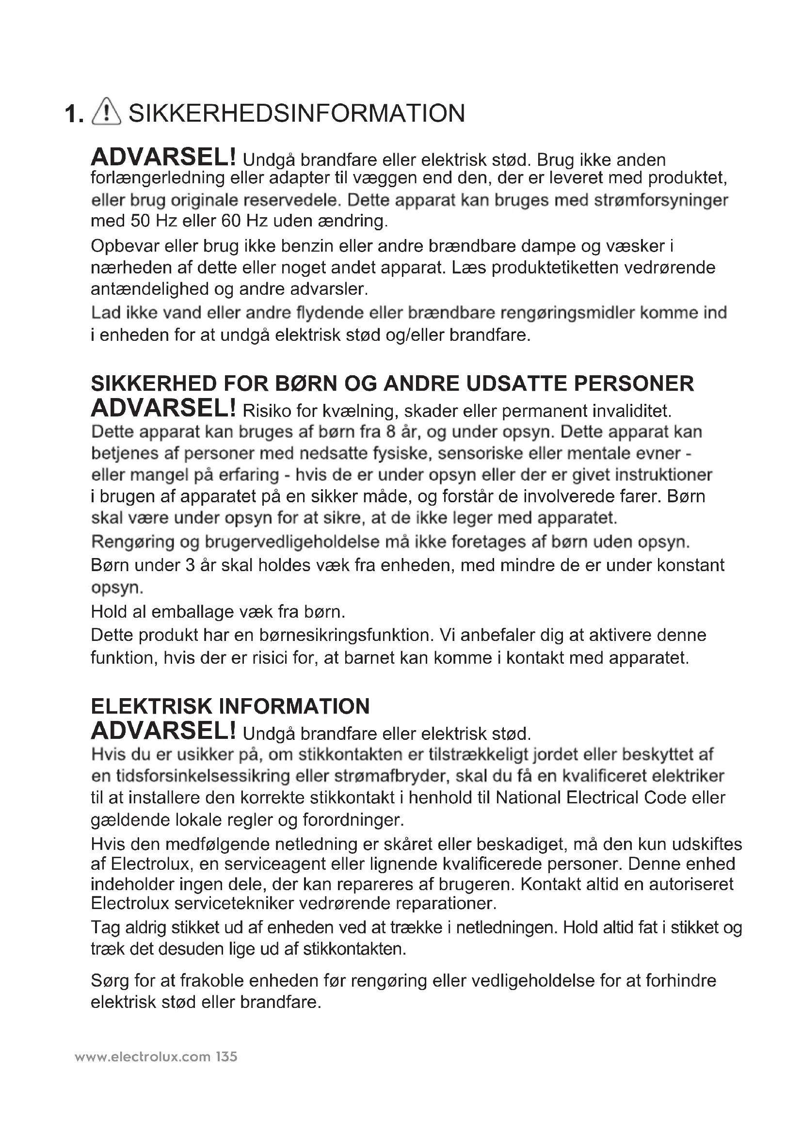 SIKKERHEDSINFORMATION ADVARSEL! Undgå brandfare eller elektrisk stød. Brug ikke anden forlængerledning eller adapter til væggen end den, der er leveret med produktet, med 50 Hz eller 60 Hz uden ændring. Opbevar eller brug ikke benzin eller andre brændbare dampe og væsker i nærheden af dette eller noget andet apparat. Læs produktetiketten vedrørende antændelighed og andre advarsler. i enheden for at undgå elektrisk stød og/eller brandfare. SIKKERHED FOR BØRN OG ANDRE UDSATTE PERSONER ADVARSEL! Risiko for kvælning, skader eller permanent invaliditet. i brugen af apparatet på en sikker måde, og forstår de involverede farer. Børn Børn under 3 år skal holdes væk fra enheden, med mindre de er under konstant Hold al emballage væk fra børn. Dette produkt har en børnesikringsfunktion. Vi anbefaler dig at aktivere denne funktion, hvis der er risici for, at barnet kan komme i kontakt med apparatet. ELEKTRISK INFORMATION ADVARSEL! Undgå brandfare eller elektrisk stød. til at installere den korrekte stikkontakt i henhold til National Electrical Code eller gældende lokale regler og forordninger. Sørg for at frakoble enheden før rengøring eller vedligeholdelse for at forhindre elektrisk stød eller brandfare. Hvis den medfølgende netledning er skåret eller beskadiget, må den kun udskiftes af Electrolux, en serviceagent eller lignende kvalificerede personer. Denne enhed indeholder ingen dele, der kan repareres af brugeren. Kontakt altid en autoriseret Electrolux servicetekniker vedrørende reparationer. Tag aldrig stikket ud af enheden ved at trække i netledningen. Hold altid fat i stikket og træk det desuden lige ud af stikkontakten.www.electrolux.com136 SIKKERHEDSFORANSTALTNINGER FORSIGTIG! Undgå alvorlig ulykke eller dødsfald. I tilfælde af en funktionsfejl (gnister, brændende lugt osv.), skal du straks stoppe driften, tage netledningen ud og tilkalde en autoriseret servicetekniker fra Electrolux. Må ikke betjenes med våde hænder. FORSIGTIG! Undgå skader eller skader på enheden eller ejendom. Ret ikke luftstrømmen mod pejse eller andre varmerelaterede kilder. Dette kan forårsage opblussen. Undlad at klatre på eller placere genstande på enheden. Hæng ikke objekter på enheden. Anbring ikke beholdere med væske på enheden. Sluk for enheden ved strømkilden, når den ikke skal bruges i en længere periode. Du må ikke blokere eller tildække indsugningsristen eller luftudgangen. Apparatet må kun bruges med tilbehør, der leveres af producenten eller dennes serviceagenter.