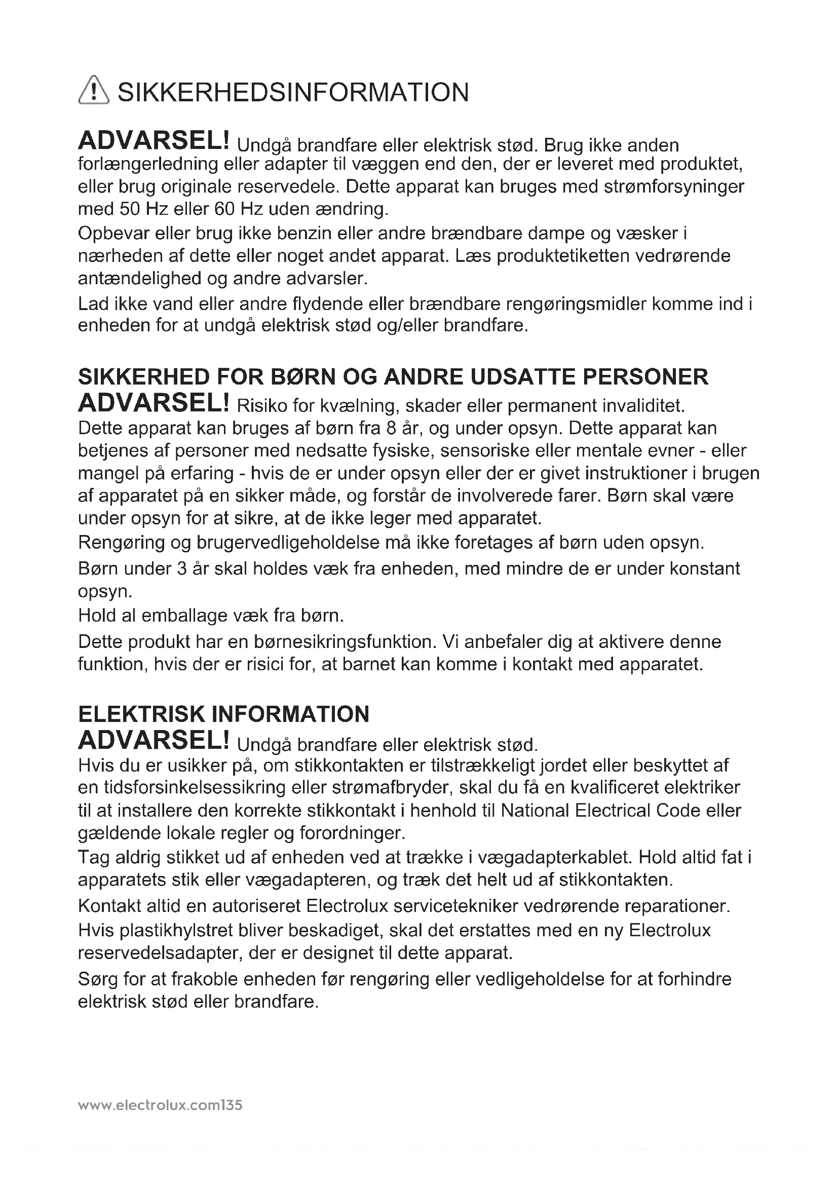 8 Filterikonet lyser, selv om jeg nylig har byttet ltrene. Etter å ha byttet lter, hold MODUS-knappen inne i 3 sekunder og lterindikasjonen tilbakestilles. Det er viktig å slå AV apparatet før bytte av lteret, for å tilbakestille apparatet. 9 Jeg kan ikke koble luftrenseren til appen. Hvis du ikke kan integrere apparatet og koble til Electrolux-appen etter et par forsøk, kontakt et autorisert Electrolux servicesenter for hjelp. WiFi-brikken i apparatet fungerer kun ved 2,4 GHz. Sjekk at hjemme-WiFi fungerer med denne båndbredden. 10 Jeg har et annet problem som ikke er oppført her ELLER ingen av trinnene ovenfor har hjulpet med å løse problemet. Du kan søke etter ere feilsøkinger og FAQ-guider på nettsiden ELLER Electrolux-appen under produktinformasjonssidene, eller kontakt autorisert Electrolux servicesenter for hjelp. Takk! Ha apparatets PNC og serienummer tilgjengelig når du kontakter Electrolux service. Denne informasjonen nnes på merkelappen som er plassert på undersiden av enheten.www.electrolux.com 135 SIKKERHEDSINFORMATION ADVARSEL! Undgå brandfare eller elektrisk stød. Brug ikke anden forlængerledning eller adapter til væggen end den, der er leveret med produktet, eller brug originale reservedele. Dette apparat kan bruges med strømforsyninger med 50 Hz eller 60 Hz uden ændring. Opbevar eller brug ikke benzin eller andre brændbare dampe og væsker i nærheden af dette eller noget andet apparat. Læs produktetiketten vedrørende antændelighed og andre advarsler. Lad ikke vand eller andre ydende eller brændbare rengøringsmidler komme ind i enheden for at undgå elektrisk stød og/eller brandfare. SIKKERHED FOR BØRN OG ANDRE UDSATTE PERSONER ADVARSEL! Risiko for kvælning, skader eller permanent invaliditet. Dette apparat kan bruges af børn fra 8 år, og under opsyn. Dette apparat kan betjenes af personer med nedsatte fysiske, sensoriske eller mentale evner - eller mangel på erfaring - hvis de er under opsyn eller der er givet instruktioner i brugen af apparatet på en sikker måde, og forstår de involverede farer. Børn skal være under opsyn for at sikre, at de ikke leger med apparatet. Rengøring og brugervedligeholdelse må ikke foretages af børn uden opsyn. Børn under 3 år skal holdes væk fra enheden, med mindre de er under konstant opsyn. Hold al emballage væk fra børn. Dette produkt har en børnesikringsfunktion. Vi anbefaler dig at aktivere denne funktion, hvis der er risici for, at barnet kan komme i kontakt med apparatet. ELEKTRISK INFORMATION ADVARSEL! Undgå brandfare eller elektrisk stød. Hvis du er usikker på, om stikkontakten er tilstrækkeligt jordet eller beskyttet af en tidsforsinkelsessikring eller strømafbryder, skal du få en kvaliceret elektriker til at installere den korrekte stikkontakt i henhold til National Electrical Code eller gældende lokale regler og forordninger. Tag aldrig stikket ud af enheden ved at trække i vægadapterkablet. Hold altid fat i apparatets stik eller vægadapteren, og træk det helt ud af stikkontakten. Kontakt altid en autoriseret Electrolux servicetekniker vedrørende reparationer. Hvis plastikhylstret bliver beskadiget, skal det erstattes med en ny Electrolux reservedelsadapter, der er designet til dette apparat. Sørg for at frakoble enheden før rengøring eller vedligeholdelse for at forhindre elektrisk stød eller brandfare.www.electrolux.com136 SIKKERHEDSFORANSTALTNINGER FORSIGTIG! Undgå alvorlig ulykke eller dødsfald. Indsæt eller anbring ikke ngre eller objekter i enhedens luftudtag. I tilfælde af en funktionsfejl (gnister, brændende lugt osv.), skal du straks stoppe driften, tage netledningen ud og tilkalde en autoriseret servicetekniker fra Electrolux. Må ikke betjenes med våde hænder. FORSIGTIG! Undgå skader eller skader på enheden eller ejendom. Ret ikke luftstrømmen mod pejse eller andre varmerelaterede kilder. Dette kan forårsage opblussen. Undlad at klatre på eller placere genstande på enheden. Hæng ikke objekter på enheden. Anbring ikke beholdere med væske på enheden. Sluk for enheden ved strømkilden, når den ikke skal bruges i en længere periode. Betjen luftrenseren med isat luftlter. Du må ikke blokere eller tildække indsugningsristen eller luftudgangen. Sørg for, at eventuelt elektrisk/elektronisk udstyr bender sig 30 cm fra luftrenseren. Apparatet må kun bruges med tilbehør, der leveres af producenten eller dennes serviceagenter. BORTSKAFFELSE Dette symbol på produktet eller på emballagen angiver, at produktet ikke må behandles som husholdningsaald. For at genbruge dit produkt skal du aevere det ved et ocielt indsamlingssted, eller til et Electrolux servicecenter, der kan fjerne og genbruge de elektroniske dele på en sikker og professionel måde. Overhold dit lands regler for indsamling af elektroniske produkter. Dette produkt er udviklet med tanke på miljøet. Alle plastdele er mærket til genbrug.