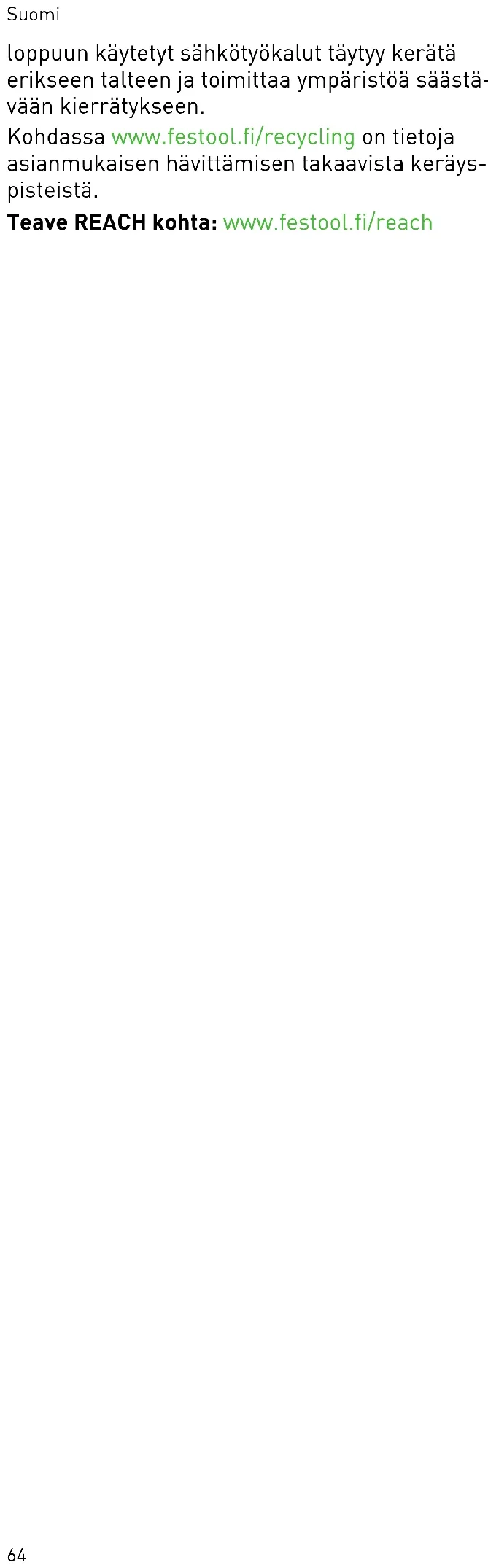 - Maskinen er udstyret med specialkul, der kob ler automatisk fra. Når disse er slidt, foretages en automatisk strømafbrydelse, og maskinen standses. Følg følgende anvisninger: ► Beskadigede beskyttelsesanordninger og dele skal repareres eller udskiftes fagligt korrekt af et autoriseret specialværksted, medmindre andet er angivet i brugsanvis ningen. ► Hold altid køleluftåbningerne i huset frie og rene for at sikre luftcirkulationen. 10 Tilbehør Anvend udelukkende originale indsatsværktø jer og tilbehørsdele fra Festool. Anvendelsen af ringere indsatsværktøjer og tilbehørsdele fra andre producenter kan medføre større fare for personskader og betydelig ubalance, så arbej dets kvalitet forringes, og elværktøjet slides mere. Bestillingsnumrene til tilbehør og maskiner fin der du på www.festool.dk. 11 Miljø Maskinen må ikke bortskaffes med al mindeligt husholdningsaffald! Udstyr, tilbehør og emballage skal bortskaffes miljømæssigt korrekt på en kommunal gen brugsstation. Gældende nationale forskrifter skal overholdes. Ifølge Rådets direktiv om affald af elektrisk og elektronisk udstyr og gennemførelse i national Dansk 70ret skal gammelt el-værktøj indsamles separat og afleveres til miljøvenlig genvinding. Information om korrekt bortskaffelse på gen brugsstationer findes på www.festool.dk/ recycling . Informationer om REACH: www.festool.dk/ reach Dansk 71Innholdsfortegnelse 1 Symboler p. 72
