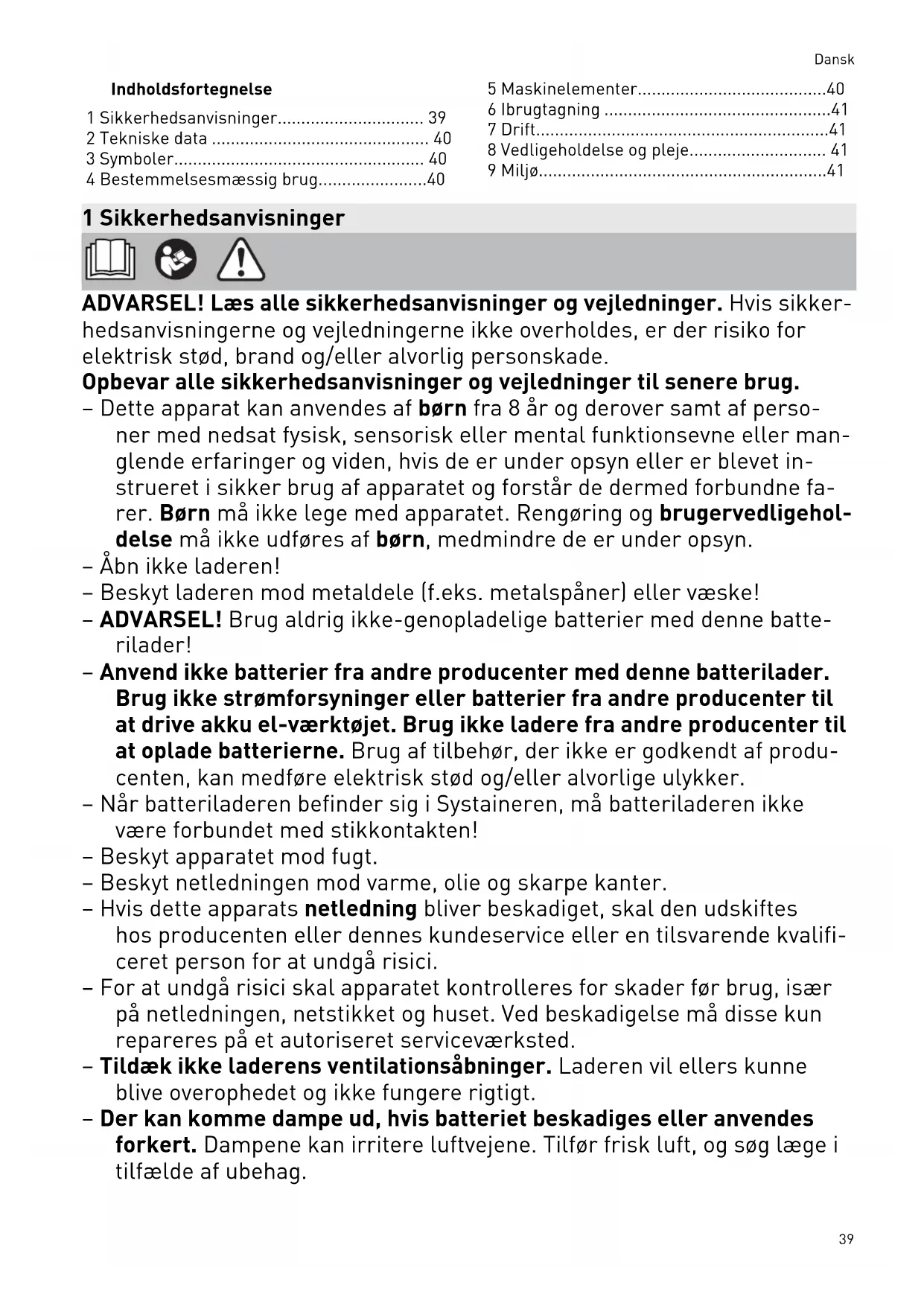 7 Drift..............................................................41 8 Vedligeholdelse og pleje............................. 41 9 Miljø.............................................................41 1 Sikkerhedsanvisninger ADVARSEL! Læs alle sikkerhedsanvisninger og vejledninger. Hvis sikker hedsanvisningerne og vejledningerne ikke overholdes, er der risiko for elektrisk stød, brand og/eller alvorlig personskade. Opbevar alle sikkerhedsanvisninger og vejledninger til senere brug. – Dette apparat kan anvendes af børn fra 8 år og derover samt af perso ner med nedsat fysisk, sensorisk eller mental funktionsevne eller man glende erfaringer og viden, hvis de er under opsyn eller er blevet in strueret i sikker brug af apparatet og forstår de dermed forbundne fa rer. Børn må ikke lege med apparatet. Rengøring og brugervedligehol delse må ikke udføres af børn, medmindre de er under opsyn. – Åbn ikke laderen! – Beskyt laderen mod metaldele (f.eks. metalspåner) eller væske! – ADVARSEL! Brug aldrig ikke-genopladelige batterier med denne batte rilader! – Anvend ikke batterier fra andre producenter med denne batterilader. Brug ikke strømforsyninger eller batterier fra andre producenter til at drive akku el-værktøjet. Brug ikke ladere fra andre producenter til at oplade batterierne. Brug af tilbehør, der ikke er godkendt af produ centen, kan medføre elektrisk stød og/eller alvorlige ulykker. – Når batteriladeren befinder sig i Systaineren, må batteriladeren ikke være forbundet med stikkontakten! – Beskyt apparatet mod fugt. – Beskyt netledningen mod varme, olie og skarpe kanter. – Hvis dette apparats netledning bliver beskadiget, skal den udskiftes hos producenten eller dennes kundeservice eller en tilsvarende kvalifi ceret person for at undgå risici. – For at undgå risici skal apparatet kontrolleres for skader før brug, især på netledningen, netstikket og huset. Ved beskadigelse må disse kun repareres på et autoriseret serviceværksted. – Tildæk ikke laderens ventilationsåbninger. Laderen vil ellers kunne blive overophedet og ikke fungere rigtigt. – Der kan komme dampe ud, hvis batteriet beskadiges eller anvendes forkert. Dampene kan irritere luftvejene. Tilfør frisk luft, og søg læge i tilfælde af ubehag. Dansk 392 Tekniske data Batterilader SCA 16 TCL 6 TCL 6 DUO Netspænding (indgang) 220 - 240 V~ 220 - 240 V~ 220 - 240 V~ Netfrekvens 50 - 60 Hz 50 - 60 Hz 50 - 60 Hz Ladespænding (udgang) 10,8 - 18 V 10,8 - 18 V Output1: 10,8 - 18 V Output2: 10,8 - 18 V Ladestrøm maks. 16 A maks. 6 A Output1: maks. 6 A Output2: maks. 6 A Opladningstider for BP- og BPC-batterier, ca. 4,2 Ah 76 min 76 min 76 min 3,0 Ah* / 3,1 Ah* 33 min 33 min 33 min 4,0 Ah* 32 min 32 min 32 min 5,0 Ah* / 5,2 Ah* 33 min 45 min 45 min 6,2 Ah* 32 min 53 min 53 min Tilladt ladetemperatur område for batteriet -5 °C til +55 °C Temperaturovervågning med NTC-modstand 3 Symboler Advarsel om generel fare Advarsel om elektrisk stød Brugsanvisning, læs sikkerhedsanvis ningerne! Læs sikkerhedsanvisningerne i brugs anvisningen! Kun egnet til indendørs brug