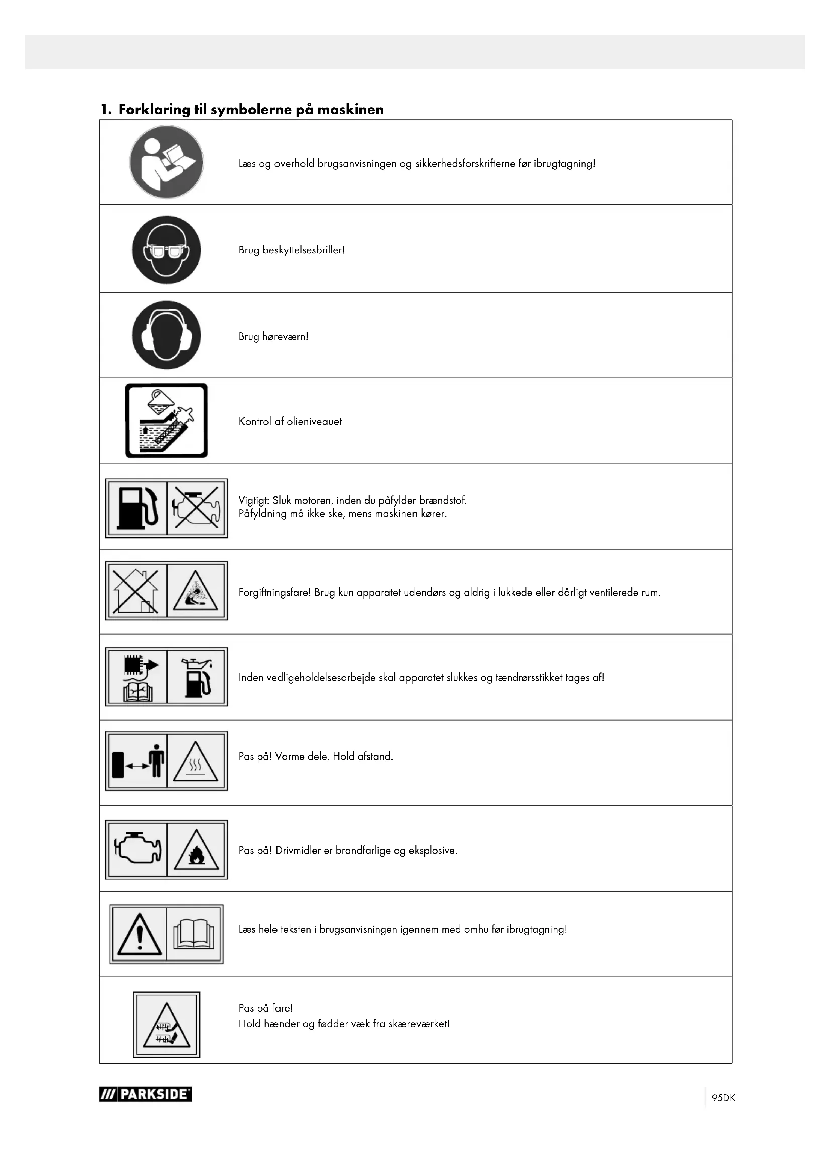 Læs og overhold brugsanvisningen og sikkerhedsforskrifterne før ibrugtagning! Brug beskyttelsesbriller! Brug høreværn! Kontrol af olieniveauet Vigtigt: Sluk motoren, inden du påfylder brændstof. Påfyldning må ikke ske, mens maskinen kører. Forgiftningsfare! Brug kun apparatet udendørs og aldrig i lukkede eller dårligt ventilerede rum. Inden vedligeholdelsesarbejde skal apparatet slukkes og tændrørsstikket tages af! Pas på! Varme dele. Hold afstand. Pas på! Drivmidler er brandfarlige og eksplosive. Læs hele teksten i brugsanvisningen igennem med omhu før ibrugtagning! Pas på fare! Hold hænder og fødder væk fra skæreværket!96 DK Pas på! Fare for personskade pga. udslyngede genstande! Maskinens garanterede lydeffektniveau Produktet opfylder gældende EU-direktiver. STOP MOTOR Produktet stopper, så snart sikkerhedsafbryderbøjlen slippes. I denne brugsanvisning er de steder, der vedrører sikkerheden, forsynet med dette symbol. Opsamlingskurv volumen Vægt i kg Arbejdsbredde Tankindhold Motorolie FARE! Signalord til angivelse af en overhængende farlig situation, som, hvis den ikke undgås, vil medføre død eller alvorlig personskade.97DK ADVARSEL! Signalord til angivelse af en potentielt farlig situation, som, hvis den ikke undgås, kan medføre død eller alvorlig personskade. FORSIGTIG! Signalord til angivelse af en potentielt farlig situation, som, hvis den ikke undgås, kan medføre mindre eller moderat personskade. BEMÆRK Signalord til angivelse af en potentielt farlig situation, som, hvis den ikke undgås, kan medføre materielle skader på produktet eller ejendom/besiddelse.98 DK