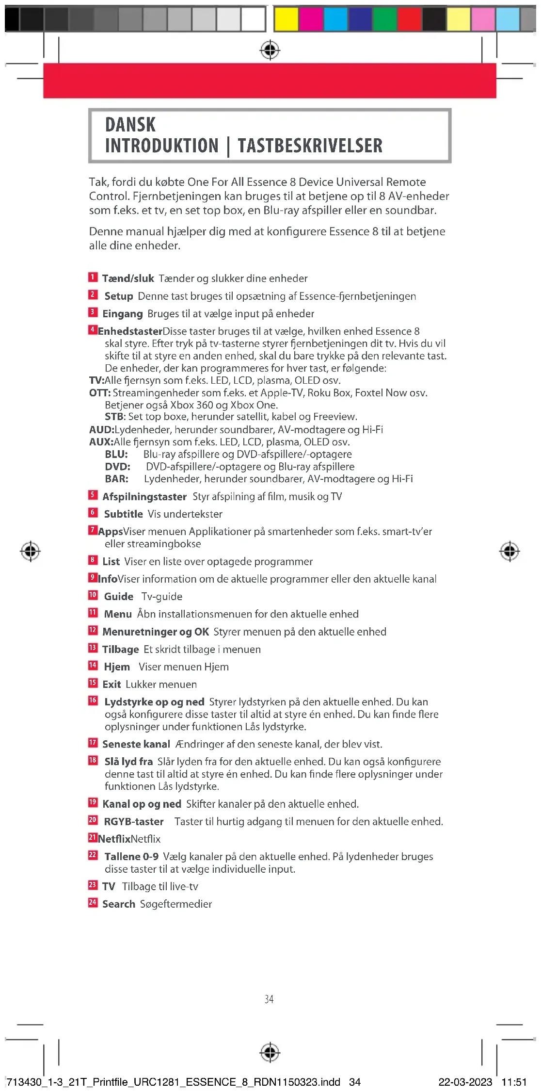 Enhedstaster Disse taster bruges til at vælge, hvilken enhed Essence 8 skal styre. Efter tryk på tv-tasterne styrer ernbetjeningen dit tv. Hvis du vil skifte til at styre en anden enhed, skal du bare trykke på den relevante tast. De enheder, der kan programmeres for hver tast, er følgende: TV: Alle ernsyn som f.eks. LED, LCD, plasma, OLED osv. OTT: Streamingenheder som f.eks. et Apple-TV, Roku Box, Foxtel Now osv. Betjener også Xbox 360 og Xbox One. STB: Set top boxe, herunder satellit, kabel og Freeview. AUD: Lydenheder, herunder soundbarer, AV-modtagere og Hi-Fi AUX: Alle ernsyn som f.eks. LED, LCD, plasma, OLED osv. BLU: Blu-ray afspillere og DVD-afspillere/-optagere DVD: DVD-afspillere/-optagere og Blu-ray afspillere BAR: Lydenheder, herunder soundbarer, AV-modtagere og Hi-Fi