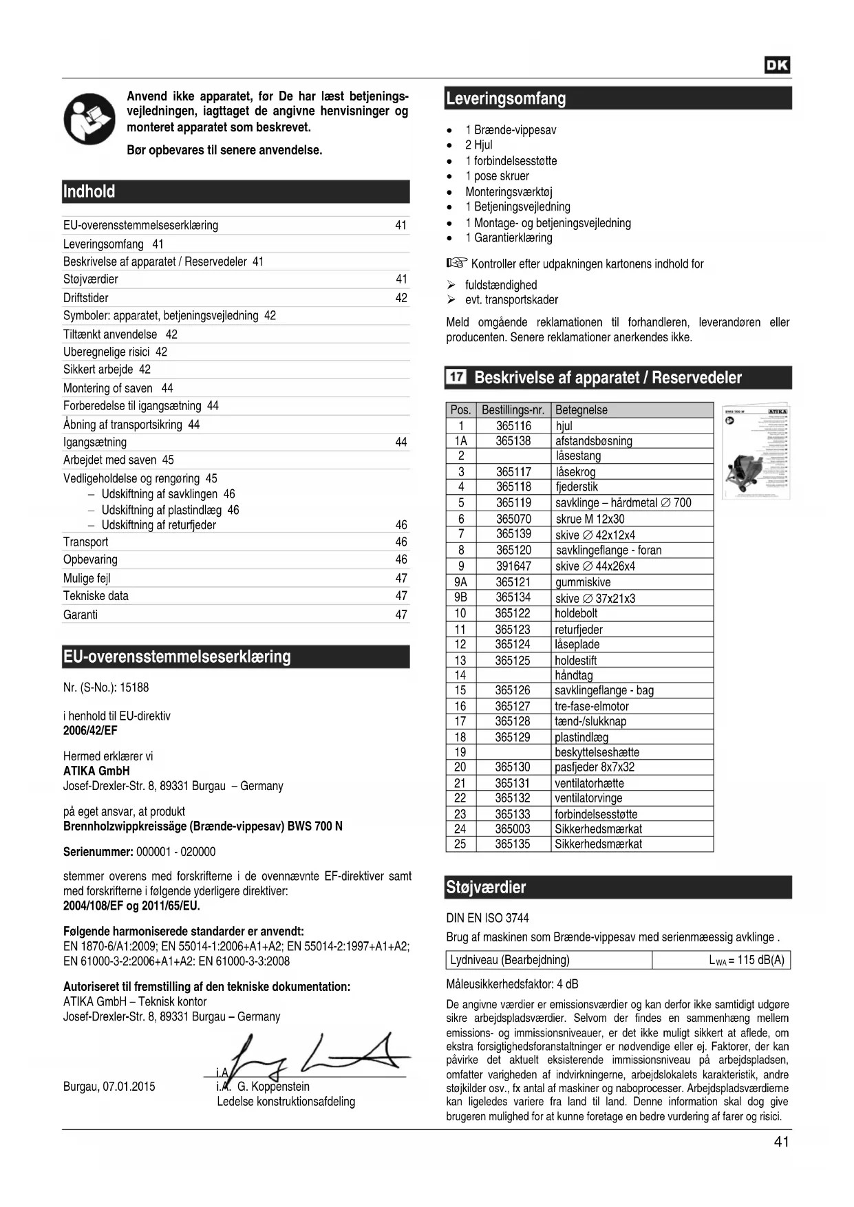 Indhold EU-overensstemmelseserklæring 41 Leveringsomfang 41 Beskrivelse af apparatet / Reservedeler 41 Støjværdier 41 Driftstider 42 Symboler: apparatet, betjeningsvejledning 42 Tiltænkt anvendelse 42 Uberegnelige risici 42 Sikkert arbejde 42 Montering of saven 44 Forberedelse til igangsætning 44 Åbning af transportsikring 44 Igangsætning 44 Arbejdet med saven 45 Vedligeholdelse og rengøring 45 − Udskiftning af savklingen 46 − Udskiftning af plastindlæg 46 − Udskiftning af returfjeder 46 Transport 46 Opbevaring 46 Mulige fejl 47 Tekniske data 47 Garanti 47