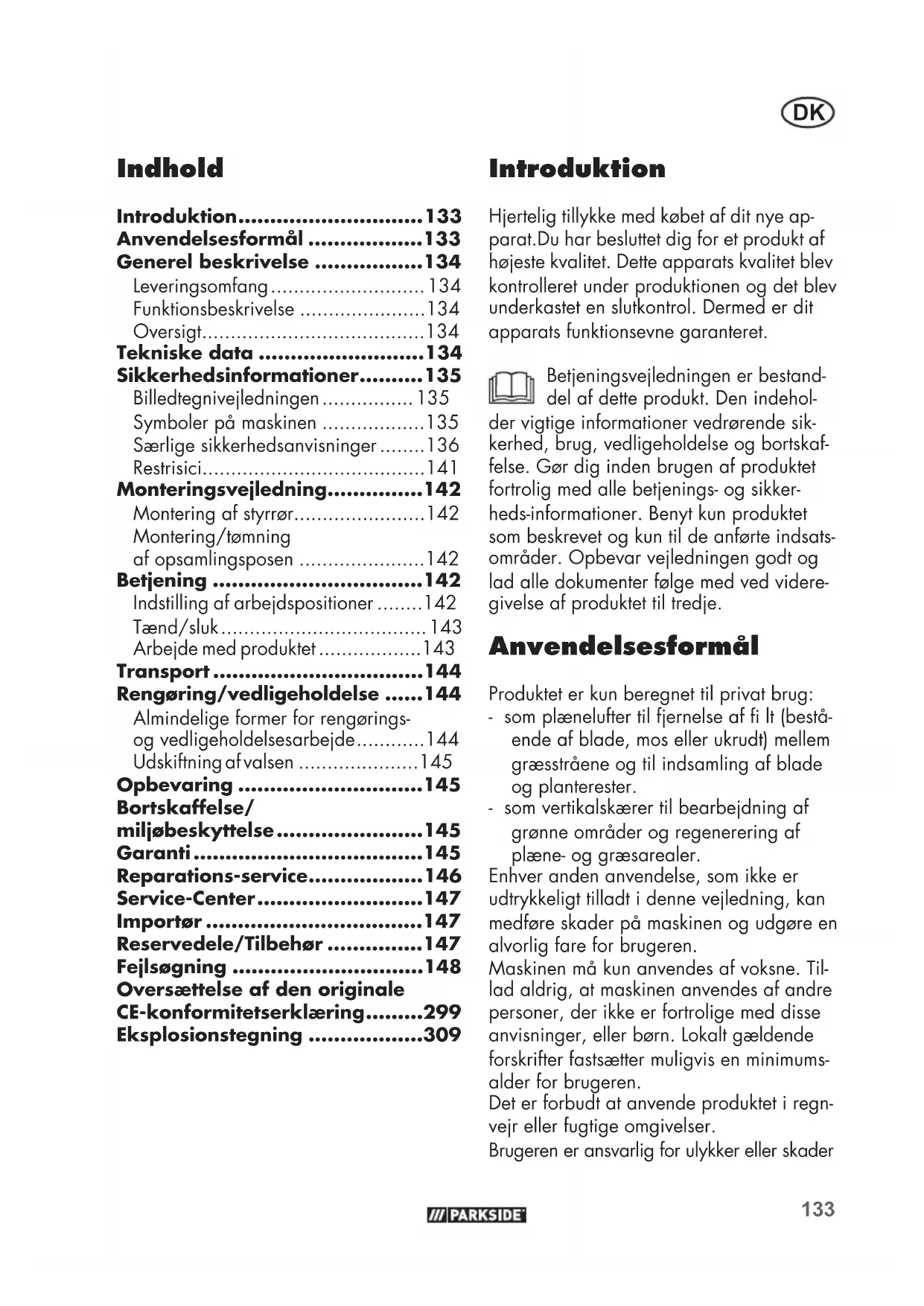 - Introduktion Hjertelig tillykke med købet af dit nye ap- parat.Du har besluttet dig for et produkt af højeste kvalitet. Dette apparats kvalitet blev kontrolleret under produktionen og det blev underkastet en slutkontrol. Dermed er dit apparats funktionsevne garanteret. Betjeningsvejledningen er bestand- del af dette produkt. Den indehol- der vigtige informationer vedrørende sik- kerhed, brug, vedligeholdelse og bortskaf- felse. Gør dig inden brugen af produktet fortrolig med alle betjenings- og sikker- heds-informationer. Benyt kun produktet som beskrevet og kun til de anførte indsats- områder. Opbevar vejledningen godt og lad alle dokumenter følge med ved videre- givelse af produktet til tredje. Anvendelsesformål Produktet er kun beregnet til privat brug: - som plænelufter til fjernelse af lt (bestå- ende af blade, mos eller ukrudt) mellem græsstråene og til indsamling af blade og planterester. - som vertikalskærer til bearbejdning af grønne områder og regenerering af plæne- og græsarealer. Enhver anden anvendelse, som ikke er udtrykkeligt tilladt i denne vejledning, kan medføre skader på maskinen og udgøre en alvorlig fare for brugeren. Maskinen må kun anvendes af voksne. Til- lad aldrig, at maskinen anvendes af andre personer, der ikke er fortrolige med disse anvisninger, eller børn. Lokalt gældende forskrifter fastsætter muligvis en minimums- alder for brugeren. Det er forbudt at anvende produktet i regn- vejr eller fugtige omgivelser. Brugeren er ansvarlig for ulykker eller skader Oversættelse af den originale CE-konformitetserklæring p. 299
