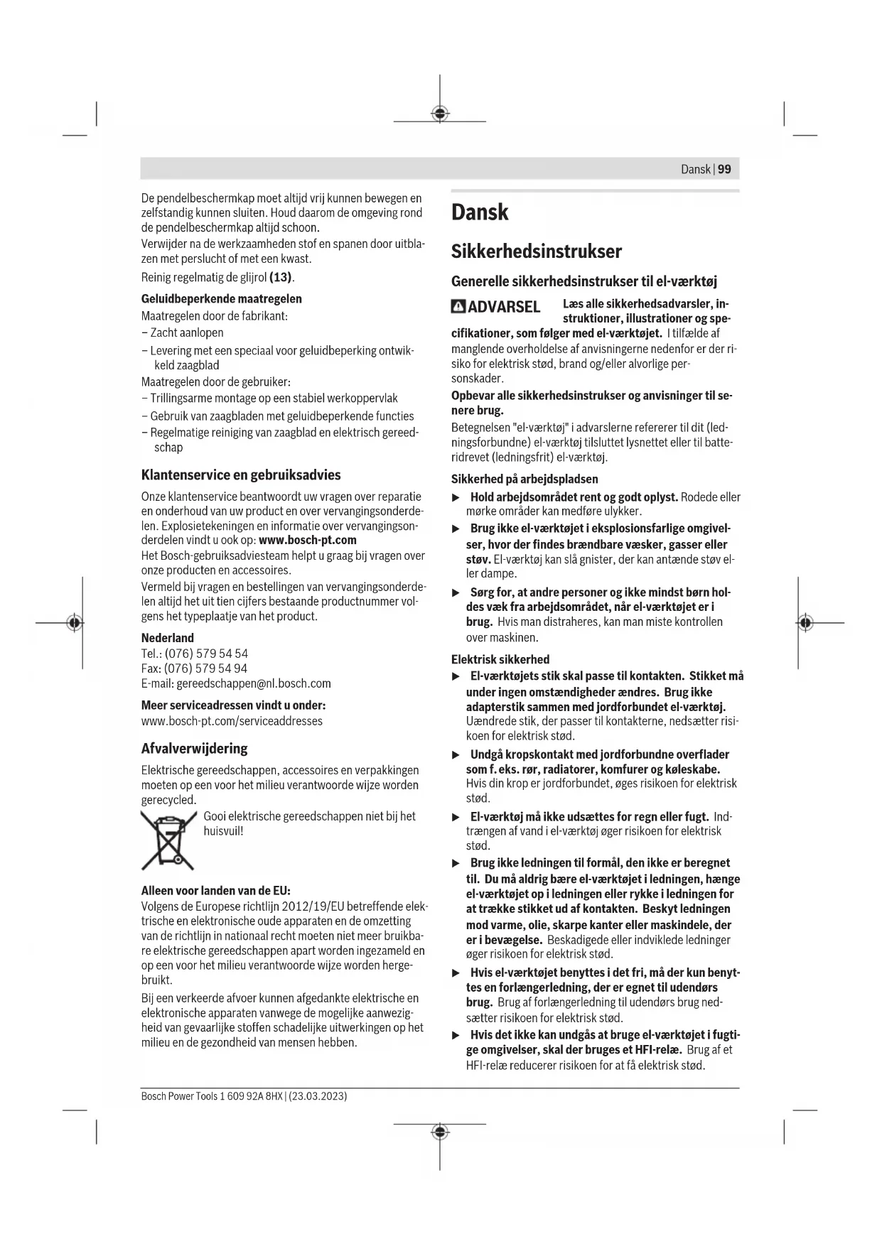 45°; 30°; 22,5°; 15° 15°; 22,5°; 30°; 45° – Draai de vastzetknop (18) los, als deze is vastgedraaid. – Trek aan de hendel (19) en draai de zaagtafel (14) tot aan de gewenste inkeping naar links of rechts. – Laat de hendel weer los. De hendel moet merkbaar in de inkeping vastklikken. – Draai de vastzetknop (18) weer vast. Willekeurige horizontale verstekhoeken instellen (zie afbeelding K) De horizontale verstekhoek kan in een bereik van 48° (linker- zijde) tot 48° (rechterzijde) worden ingesteld. – Draai de vastzetknop (18) los, als deze is vastgedraaid. – Trek aan de hendel (19) en duw tegelijkertijd op de ver- grendelklem (17) tot deze in de daarvoor bestemde groef vastklikt. Daardoor kan de zaagtafel vrij bewegen. – Draai de zaagtafel (14) met de vastzetknop naar links of rechts tot de hoekaanduiding (58) de gewenste horizon- tale verstekhoek aangeeft. – Draai de vastzetknop (18) weer vast. – Om de hendel (19) weer los te maken (voor het instellen van horizontale standaard verstekhoeken), trekt u de hendel omhoog. De vergrendelklem (17) springt in zijn oorspronkelijke positie terug en de hendel (19) kan weer in de inkepingen (22) vastklikken. Verticale verstekhoeken instellen De verticale verstekhoek kan in een bereik van 47° (linkerzij- de) tot 47° (rechterzijde) worden ingesteld. Voor het snel en nauwkeurig instellen van vaak gebruikte ver- ticale verstekhoeken zijn vaste posities voor de hoeken 0°, 22,5° en 45° aangebracht. – Zorg ervoor dat het klemwiel(45) gemonteerd is (zie „Klemwiel monteren (zie afbeeldingA2)“, Pagina93). Bosch Power Tools 1 609 92A 8HX | (23.03.2023)96 | Nederlands Verticale standaard verstekhoeken instellen (zie afbeeldingL) – Trek de verstelbare aanslagrails (28) helemaal naar bui- ten of verwijder ze helemaal. – Draai het klemwiel (45) los. – Trek de vastzethendel (46) naar buiten en laat deze in de vrijloopstand vastklikken. Daardoor kunt u het volledige verticale verstekhoekbereik (links en rechts) gebruiken. – Draai de gereedschaparm aan de handgreep (9) naar links of rechts tot de hoekaanduiding (30) de gewenste verticale standaard verstekhoek aangeeft. – Draai de vastzethendel (46). De vastzethendel moet voel- baar in de positie van de gewenste verticale standaard verstekhoek vastklikken. – Draai het klemwiel (45) weer vast. Willekeurige verticale verstekhoeken instellen – Trek de verstelbare aanslagrails (28) helemaal naar bui- ten of verwijder ze helemaal. – Draai het klemwiel (45) los. – Trek de vastzethendel (46) naar buiten en laat deze in de vrijloopstand vastklikken. Daardoor kunt u het volledige verticale verstekhoekbereik (links en rechts) gebruiken. – Draai de gereedschaparm aan de handgreep (9) naar links of rechts tot de hoekaanduiding (30) de gewenste verticale verstekhoek aangeeft. – Draai het klemwiel (45) weer vast. Ingebruikname u Let op de netspanning! De spanning van de stroombron moet overeenkomen met de gegevens op het typeplaatje van het elektrische gereedschap. u Draai de vastzetknop (18) en het klemwiel (45) vóór het zagen altijd stevig vast. Het zaagblad kan anders in het werkstuk schuin wegdraaien. Werklicht inschakelen Het werklicht verbetert het zicht in het directe werkbereik. U kunt zeer goede zaagresultaten verkrijgen door het werklicht samen met de markering van de zaaglijn door de laserstralen te gebruiken. – Schakel het werklicht met de schakelaar (6) in. u Kijk niet recht in het werklampje, het kan u verblin- den. Inschakelen (zieafbeeldingM) – Voor het inschakelen van het elektrische gereedschap schuift u eerst de inschakelblokkering (7) naar het mid- den en drukt u vervolgens op de aan/uit-schakelaar (8) en houdt u deze ingedrukt. Aanwijzing: Om veiligheidsredenen kan de aan/uit-schake- laar (8) niet vergrendeld worden, maar moet tijdens het ge- bruik voortdurend ingedrukt blijven. Uitschakelen – Voor het uitschakelen laat u de aan/uit-schakelaar (8) los. Soft Start De Soft Start begrenst het vermogen bij het inschakelen van het elektrische gereedschap en maakt het gebruik met een zekering van 16A mogelijk. Aanwijzing: Als het elektrische gereedschap direct na het inschakelen met vol toerental draait, dan is de Soft Start uit- gevallen. Het elektrische gereedschap moet zo spoedig mo- gelijk naar de klantenservice opgestuurd worden. Zagen Algemene aanwijzingen voor het zagen u Draai de vastzetknop (18) en het klemwiel (45) vóór het zagen altijd stevig vast. Het zaagblad kan anders in het werkstuk schuin wegdraaien. u Elke keer wanneer u zaagt, moet u eerst controleren dat het zaagblad op geen enkel moment de aansla- grail, lijmklemmen of andere onderdelen van het ge- reedschap kan raken. Verwijder eventueel gemon- teerde hulpgeleiders of pas deze op de juiste wijze aan. Bescherm het zaagblad tegen schokken en stoten. Oefen geen zijwaartse druk op het zaagblad uit. Zaag alleen materialen die volgens het beoogd gebruik toe- gestaan zijn. Bewerk geen kromgetrokken werkstukken. Het werkstuk moet altijd een rechte rand hebben om tegen de aanslagrail te leggen. Ondersteun lange en zware werkstukken door er iets onder te leggen. Zorg ervoor dat de pendelbeschermkap correct werkt en vrij kan bewegen. Als de gereedschaparm omlaag wordt bewo- gen, moet de pendelbeschermkap opengaan. Als de gereed- schaparm omhoog wordt bewogen, moet de pendelbe- schermkap boven het zaagblad weer sluiten en in de boven- ste positie van de gereedschaparm vergrendelen. Positie van de gebruiker (zie afbeelding N) u Ga niet op één lijn met het zaagblad vóór het elektri- sche gereedschap staan, maar altijd opzij van het zaagblad. Zo is uw lichaam beschermd tegen een moge- lijke terugslag. – Houd uw handen, vingers en armen uit de buurt van het ronddraaiende zaagblad. – Kruis uw handen niet vóór de gereedschaparm. Zagen met afkortbeweging – Voor zagen met behulp van de afkortvoorziening (2) (bre- de werkstukken) draait u de vastzetschroef (1) los, als deze is vastgedra
