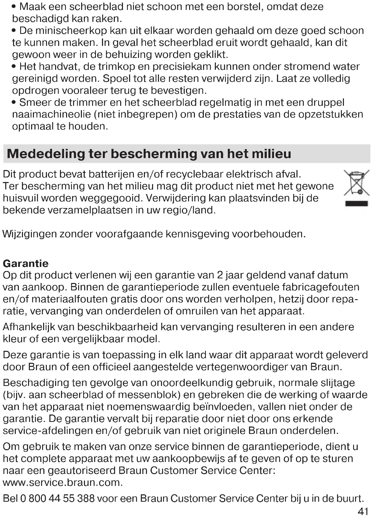 - Smør trimmeren og skærebladene med en dråbe maskinolie (medfølger ikke) regelmæssigt for at bevare optimal funktion for tilbehør. Miljømæssige oplysninger Produktet indeholder et batteri og/eller elektriske dele til genbrug. For at beskytte miljøet må apparatet ikke bortskaffes med hushold- ningsaffald, men skal afleveres til genbrug af elektriske produkter på en genbrugsstation i dit land. Der tages forbehold for ændringer uden forudgående varsel. Garanti Braun yder 2 års garanti på dette produkt gældende fra købsdatoen. Inden for garantiperioden vil Braun for egen regning afhjælpe fabrika- tions- og materialefejl efter vort skøn gennem reparation eller ombytning af apparatet. Ved udskiftning af dele til produktet kan nye dele have en anden farve eller være en tilsvarende model. Denne garanti gælder i alle lande, hvor Braun er repræsenteret. Denne garanti dækker ikke skader opstået ved fejlbetjening, normalt slid (f.eks. skæreblad og lamelkniv) samt fejl, som har ringe effekt på apparatets værdi eller funktionsdygtighed. Garantien bortfalder ved reparationer udført af andre end de af Braun anviste reparatører og hvor originale Braun reser- vedele ikke er anvendt. Ved service inden for garantiperioden afleveres eller indsendes hele apparatet sammen med købsbevis til et autoriseret Braun Service Center: www.service.braun.com. Ring 7015 0013 for oplysning om nærmeste Braun Service Center. 90012280_Type5542_BT_7350_7340_7330_7320_5365_5360_5342_5340_MN_ANZ.indd 4590012280_Type5542_BT_7350_7340_7330_7320_5365_5360_5342_5340_MN_ANZ.indd 45 13.09.21 09:1913.09.21 09:1946 Norsk Les hele denne bruksanvisningen. Den inneholder sikkerhets- informasjon. Oppbevar den for senere bruk. Advarsel Du kan rengjøre apparatet under rennende vann. Trekk ut strømledningen før du rengjør barbermaskinen med vann. Apparatet er utstyrt med et spesialledningssett med inte- grert lavspenningsadapter. Du må ikke bytte ut eller endre på noen deler av apparatet. Gjør du det, risikerer du å få elektrisk støt. Bruk kun spesialledningen som følger med barbermaski- nen. Hvis apparatet er merket med