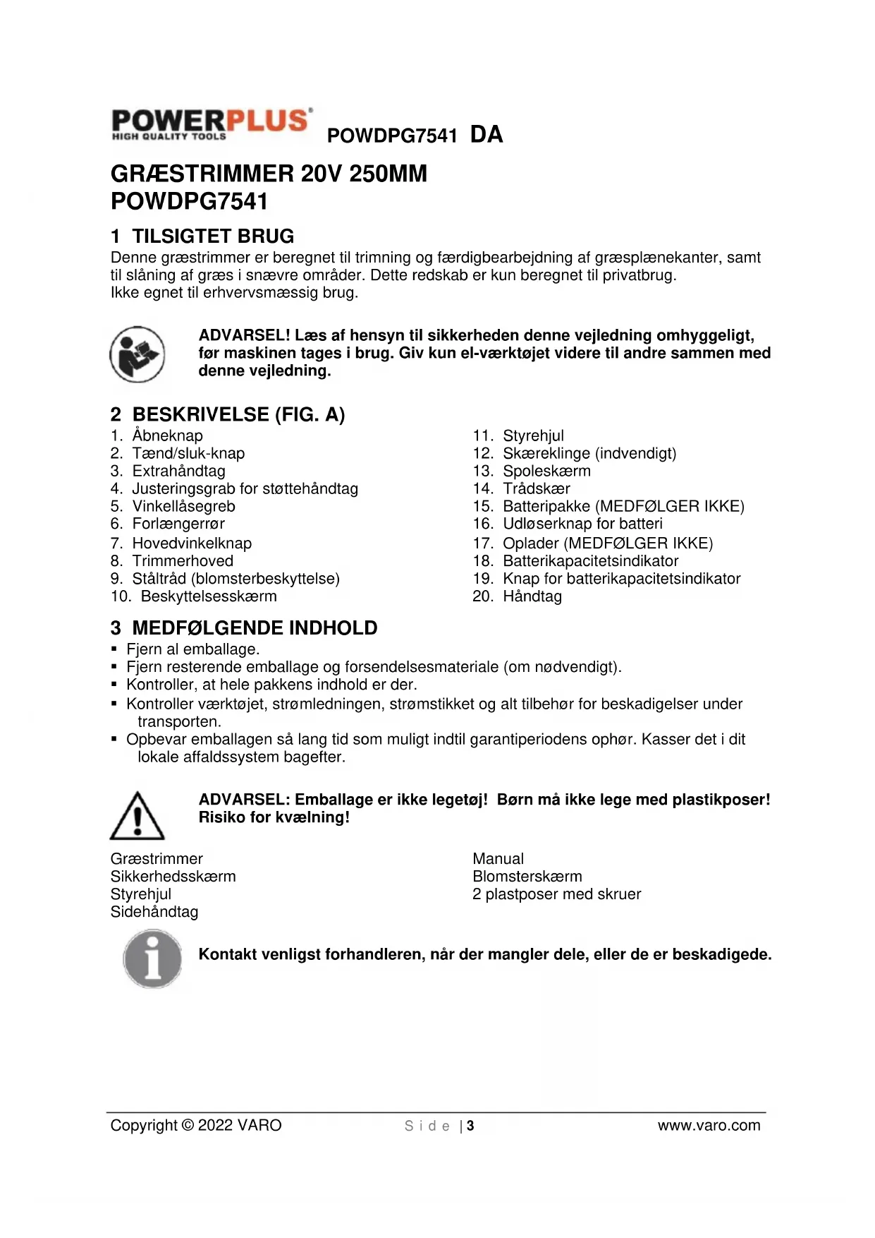POWDPG7541 1 TILSIGTET BRUG Denne græstrimmer er beregnet til trimning og færdigbearbejdning af græsplænekanter, samt til slåning af græs i snævre områder. Dette redskab er kun beregnet til privatbrug. Ikke egnet til erhvervsmæssig brug. ADVARSEL! Læs af hensyn til sikkerheden denne vejledning omhyggeligt, før maskinen tages i brug. Giv kun el-værktøjet videre til andre sammen med denne vejledning. 2 BESKRIVELSE (FIG. A)