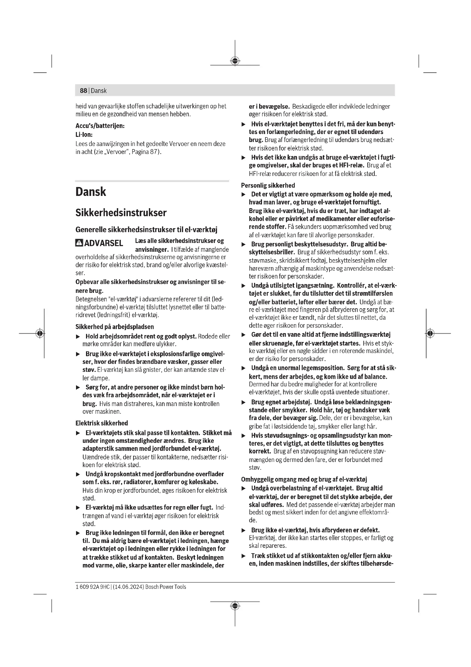 Ondergrond te hard Bij beton met harde ingesloten voorwerpen probeert u de be- vestiging op een andere plek. Anders gebruikt u alternatieve bevestigingsmethodes zoals bv. pluggen. Spijker houdt niet in staal. Stalen ondergrond te dun Gebruik alternatieve bevestigingsmethodes zoals bv. schroe- ven. Spijker komt niet uit contac- telement of contactelement blijft in ingedrukte positie. Blokkering in het contactele- ment (bv. door vreemde voor- werpen of vuil) Verwijder de blokkering (zie „Blokkeringen verwijderen/re- set“, Pagina84). Te hoog foutpercentage Ondergrond te hard Gebruik alternatieve bevestigingsmethodes zoals bv. pluggen. Slagstempel versleten Laat het elektrische gereedschap repareren door een erkende klantenservicewerkplaats voor gereedschappen van Bosch. Spijkers glijden niet in het ma- gazijn. Magazijn vuil Reinig het magazijn(12), bv. met een penseel. Klantenservice en gebruiksadvies Onze klantenservice beantwoordt uw vragen over reparatie en onderhoud van uw product en over vervangingsonderde- len. Explosietekeningen en informatie over vervangingson- derdelen vindt u ook op: www.bosch-pt.com Het Bosch-gebruiksadviesteam helpt u graag bij vragen over onze producten en accessoires. Vermeld bij vragen en bestellingen van vervangingsonderde- len altijd het uit tien cijfers bestaande productnummer vol- gens het typeplaatje van het product. Nederland Tel.: (076) 579 54 54 Fax: (076) 579 54 94 E-mail: gereedschappen@nl.bosch.com Meer serviceadressen vindt u onder: www.bosch-pt.com/serviceaddresses Vervoer Op de aanbevolen Li-Ion-accu’s zijn de eisen voor het ver- voer van gevaarlijke stoffen van toepassing. De accu’s kun- nen door de gebruiker zonder verdere voorwaarden over de weg vervoerd worden. Bij de verzending door derden (bijv. luchtvervoer of expedi- tiebedrijf) moeten bijzondere eisen ten aanzien van verpak- king en markering in acht genomen worden. In deze gevallen moet bij de voorbereiding van de verzending een deskundige voor gevaarlijke stoffen geraadpleegd worden. Verzend accu’s alleen, wanneer de behuizing onbeschadigd is. Plak blootliggende contacten af en verpak de accu zoda- nig dat deze niet in de verpakking beweegt. Neem ook even- tuele overige nationale voorschriften in acht. Afvalverwijdering Elektrische gereedschappen, accu’s, accessoi- res en verpakkingen moeten op een voor het milieu verantwoorde wijze gerecycled worden. Gooi elektrische gereedschappen, accu’s en batterijen niet bij het huisvuil. Alleen voor landen van de EU: Afgedankte elektrische gereedschappen en defecte of lege accu's/batterijen moeten apart worden verwijderd. Maak ge- bruik van de hiervoor bestemde inzamelingssystemen. Bij een verkeerde afvoer kunnen afgedankte elektrische en elektronische apparaten vanwege de mogelijke aanwezig- Bosch Power Tools 1 609 92A 9HC | (14.06.2024)88 | Dansk heid van gevaarlijke stoffen schadelijke uitwerkingen op het milieu en de gezondheid van mensen hebben. Accu's/batterijen: Li-Ion: Lees de aanwijzingen in het gedeelte Vervoer en neem deze in acht (zie „Vervoer“, Pagina87). Dansk Sikkerhedsinstrukser Generelle sikkerhedsinstrukser til el‑værktøj ADVARSEL Læs alle sikkerhedsinstrukser og anvisninger. I tilfælde af manglende overholdelse af sikkerhedsinstrukserne og anvisningerne er der risiko for elektrisk stød, brand og/eller alvorlige kvæstel- ser. Opbevar alle sikkerhedsinstrukser og anvisninger til se- nere brug. Betegnelsen "el-værktøj" i advarslerne refererer til dit (led- ningsforbundne) el-værktøj tilsluttet lysnettet eller til batte- ridrevet (ledningsfrit) el-værktøj. Sikkerhed på arbejdspladsen u Hold arbejdsområdet rent og godt oplyst. Rodede eller mørke områder kan medføre ulykker. u Brug ikke el‑værktøjet i eksplosionsfarlige omgivel- ser, hvor der findes brændbare væsker, gasser eller støv. El‑værktøj kan slå gnister, der kan antænde støv el- ler dampe. u Sørg for, at andre personer og ikke mindst børn hol- des væk fra arbejdsområdet, når el-værktøjet er i brug. Hvis man distraheres, kan man miste kontrollen over maskinen. Elektrisk sikkerhed u El‑værktøjets stik skal passe til kontakten. Stikket må under ingen omstændigheder ændres. Brug ikke adapterstik sammen med jordforbundet el‑værktøj. Uændrede stik, der passer til kontakterne, nedsætter risi- koen for elektrisk stød. u Undgå kropskontakt med jordforbundne overflader som f. eks. rør, radiatorer, komfurer og køleskabe. Hvis din krop er jordforbundet, øges risikoen for elektrisk stød. u El-værktøj må ikke udsættes for regn eller fugt. Ind- trængen af vand i el‑værktøj øger risikoen for elektrisk stød. u Brug ikke ledningen til formål, den ikke er beregnet til. Du må aldrig bære el‑værktøjet i ledningen, hænge el‑værktøjet op i ledningen eller rykke i ledningen for at trække stikket ud af kontakten. Beskyt ledningen mod varme, olie, skarpe kanter eller maskindele, der er i bevægelse. Beskadigede eller indviklede ledninger øger risikoen for elektrisk stød. u Hvis el‑værktøjet benyttes i det fri, må der kun benyt- tes en forlængerledning, der er egnet til udendørs brug. Brug af forlængerledning til udendørs brug nedsæt- ter risikoen for elektrisk stød. u Hvis det ikke kan undgås at bruge el‑værktøjet i fugti- ge omgivelser, skal der bruges et HFI‑relæ. Brug af et HFI‑relæ reducerer risikoen for at få elektrisk stød. Personlig sikkerhed u Det er vigtigt at være opmærksom og holde øje med, hvad man laver, og bruge el‑værktøjet fornuftigt. Brug ikke el‑værktøj, hvis du er træt, har indtaget al- kohol eller er påvirket af medikamenter eller euforise- rende stoffer. Få sekunders uopmærksomhed ved brug af el‑værktøjet kan føre til alvorlige personskader. u Brug personligt beskyttelsesudstyr. Brug altid be- skyttelsesbriller. Brug af sikkerhedsudstyr som f. eks. støvmaske, skridsikkert fodtøj, beskyttelseshjelm eller høreværn afhængig af maski
