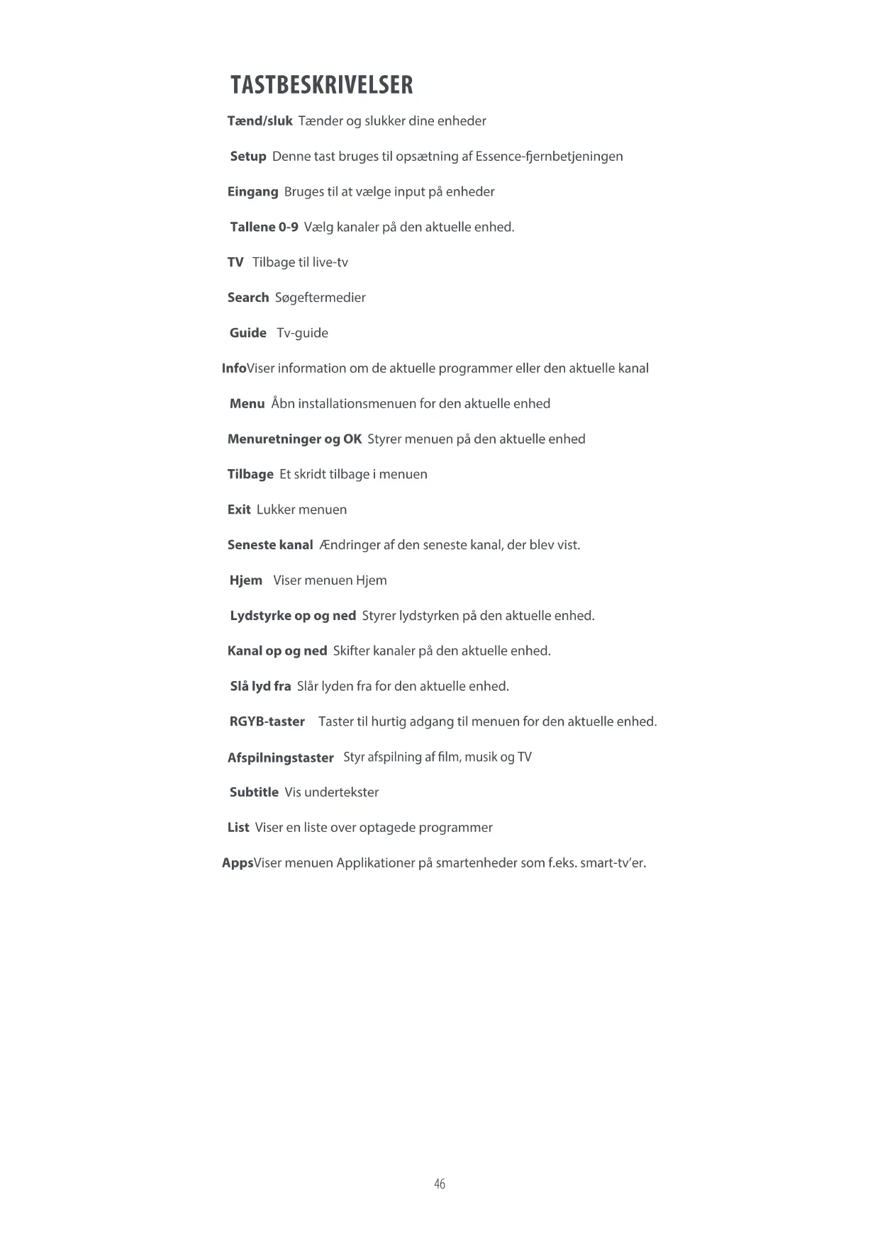 Setup Denne tast bruges til opsætning af Essence-ernbetjeningen