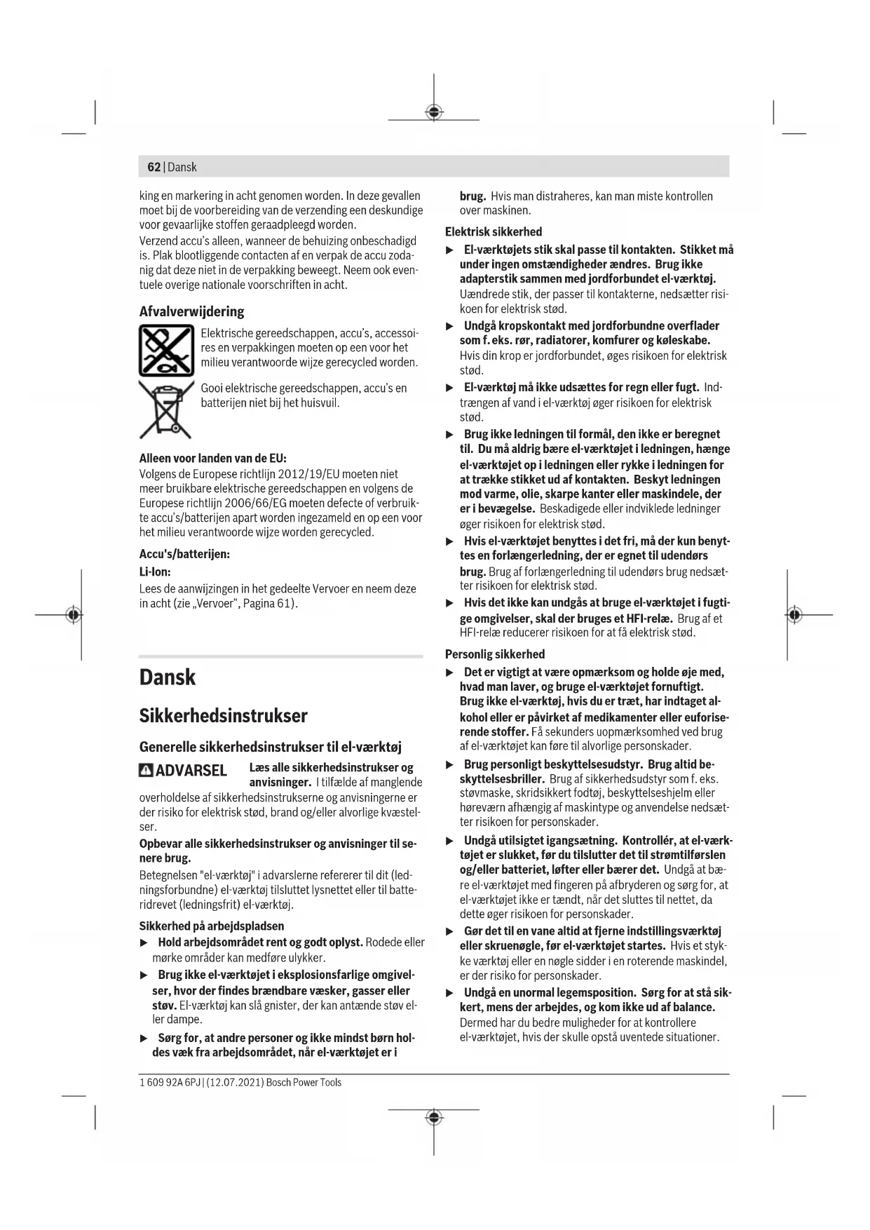 Det svingningsniveau, der er angivet i nærværende in- struktioner, er blevet målt iht. en standardiseret målepro- ces, og kan bruges til at sammenligne el‑værktøjer. Det er også egnet til en foreløbig vurdering af svingningsbelastnin- gen. Det angivne svingningsniveau repræsenterer de væsentlige anvendelser af el‑værktøjet. Hvis el‑værktøjet dog anvendes til andre formål, med afvigende indsatsværktøj eller util- strækkelig vedligeholdelse, kan svingningsniveauet afvige. Dette kan føre til en betydelig forøgelse af svingningsbelast- ningen over hele arbejdstidsrummet. Til en nøjagtig vurdering af svingningsbelastningen bør der også tages højde for de tider, i hvilke værktøjet er slukket el- ler godt nok kører, men rent faktisk ikke anvendes. Dette kan føre til en betydelig reduktion af svingningsbelastningen i he- le arbejdstidsrummet. Fastlæg ekstra sikkerhedsforanstaltninger til beskyttelse af brugeren mod svingningers virkning som f.eks.: Vedligehol- delse af el‑værktøj og indsatsværktøj, holde hænder varme, organisation af arbejdsforløb. Montering Opladning af akku u Brug kun de ladeaggregater, der fremgår af de tekni- ske data. Kun disse ladeaggregater er afstemt i forhold til den lithium-ion-akku, der bruges på dit el-værktøj. Bemærk: Akkuen leveres delvis opladet. For at sikre, at ak- kuen fungerer 100%, oplades akkuen helt før første ibrug- tagning. Li-ion-akkuen kan oplades til enhver tid, uden at levetiden forkortes. En afbrydelse af opladningen beskadiger ikke ak- kuen. Lithium-ion-batteriet er beskyttet mod dybafladning via "Electronic Cell Protection (ECP)" (elektronisk cellebeskyt- telse). Er akkuen afladet, slukkes el-værktøjet med en be- skyttelseskontakt: Indsatsværktøjet bevæger sig ikke mere. u Tryk ikke videre på start-stop-kontakten efter auto- matisk slukning af el‑værktøjet. Batteriet kan blive be- skadiget. Læs og overhold henvisningerne mht. bortskaffelse. Udtagning af akku (se billede A) Akkuen (4) tages ud ved at trykke på oplåsningsknappen (5) og trække akkuen ud af el-værktøjet. Undgå brug af vold. Akku-ladetilstandsindikator LED Kapacitet Konstant lys 3x grøn 60-100% Konstant lys 2x grøn 30-60% Konstant lys 1x grøn 10-30% Langsomt blinklys 1x grøn 0-10% Montering af beskyttelsesanordning u Tag altid akkuen ud af el‑værktøjet, før der arbejdes på el‑værktøjet (f.eks. vedligeholdelse, værktøjsskift osv.) samt før det transporteres og lægges til opbeva- ring. Utilsigtet aktivering af start-stop-kontakten er for- bundet med kvæstelsesfare. Bemærk: Efter brud på slibeskiven under arbejdet eller be- skadigelse af holdeanordningerne på beskyttelseskappen/ el-værktøjet skal el-værktøjet omgående sendes til et autori- seret værksted, adresser se afsnittet "Kundeservice og anvendelsesrådgivning". Beskyttelsesskærm til slibning u Brug altid beskyttelsesskærmen til slibning(7). Beskyttelsesskærm til skæring u Brug altid en beskyttelseskappe til skæring ved gen- nemskæring med bundne slibemidler (10). u Sørg for tilstrækkelig støvopsugning, når der skæres i sten. Montering af beskyttelsesskærm (se billede B) Sæt beskyttelsesskærmen til skæring (10) på beskyttelses- skærmen til slibning (7), indtil den går i indgreb. Indstilling af beskyttelsesskærm (se billede B) Drej beskyttelsesskærmen til den ønskede position, og lad den gå i indgreb. Det er ikke nødvendigt at bruge værktøj. Montering af slibeværktøj u Tag altid akkuen ud af el‑værktøjet, før der arbejdes på el‑værktøjet (f.eks. vedligeholdelse, værktøjsskift osv.) samt før det transporteres og lægges til opbeva- ring. Utilsigtet aktivering af start-stop-kontakten er for- bundet med kvæstelsesfare. u Rør ikke ved slibe- og skæreskiverne, før de er kølet af. Skiverne bliver meget varmt under arbejdet. Rengør slibespindlen (8) og alle dele, der skal monteres. 1 609 92A 6PJ | (12.07.2021) Bosch Power ToolsDansk | 67 For at spænde eller løsne slibeværktøjet skal du skubbe spindellåseknappen (2) fremad og samtidig dreje på slibe- værktøjet, så slibespindlen låses. u Aktivér kun spindellåsetasten, når slibespindlen står stille. Ellers kan el‑værktøjet blive beskadiget. Slibe-/skæreskive Vær opmærksom på slibeværktøjernes dimensioner. Huldia- meteren skal passe til holdeflangen. Brug hverken adaptere eller reduktionsstykker. Sørg ved anvendelse af diamantskæreskiver for, at retning- spilen på diamantskæreskiven og el-værktøjets omdrejnings- retning (se retningspil på huset) stemmer overens. Rækkefølgen ved montering kan ses på grafiksiden. For at løsne slibe-/skæreskiven skal du skubbe spindellå- seknappen (2) fremad og samtidig dreje slibe-/skæreskiven (12), så slibespindlen (8) låses (se billede C1). Brug unbrakonøglen (13) til at fjerne spændeskrue og skive (11), og tag slibe-/skæreskiven (12) af (se billede C2). For at fastgøre slibe-/skæreskiven skal du iskrue spænde- skrue og skive (11). Spænd skruen med unbrakonøglen (13), så skiven til skruen ligger helt an mod slibe-/skæreski- ven (12) (se billede C3). Skub derefter spindellåseknappen (2) tilbage igen (se bille- de C4). u Når slibeværktøjet er monteret, kontrolleres det for korrekt montering og at det kan bevæges frit, før el- værktøjet tændes. Sørg for, at slibeværktøjet ikke rager imod beskyttelseskappen eller andre dele. Tilladte slibeværktøjer Du kan bruge alle slibeværktøjer, der er nævnt i denne betje- ningsvejledning. Det tilladte omdrejningstal [o/min] eller periferihastigheden [m/s] for de benyttede slibeværktøjer skal som minimum modsvare angivelserne i den efterfølgende tabel. Overhold derfor det/den tilladte omdrejningstal/periferi- hastighed på slibeværktøjets etiket. maks. [mm] [mm] D b d [o/min] [m/s]