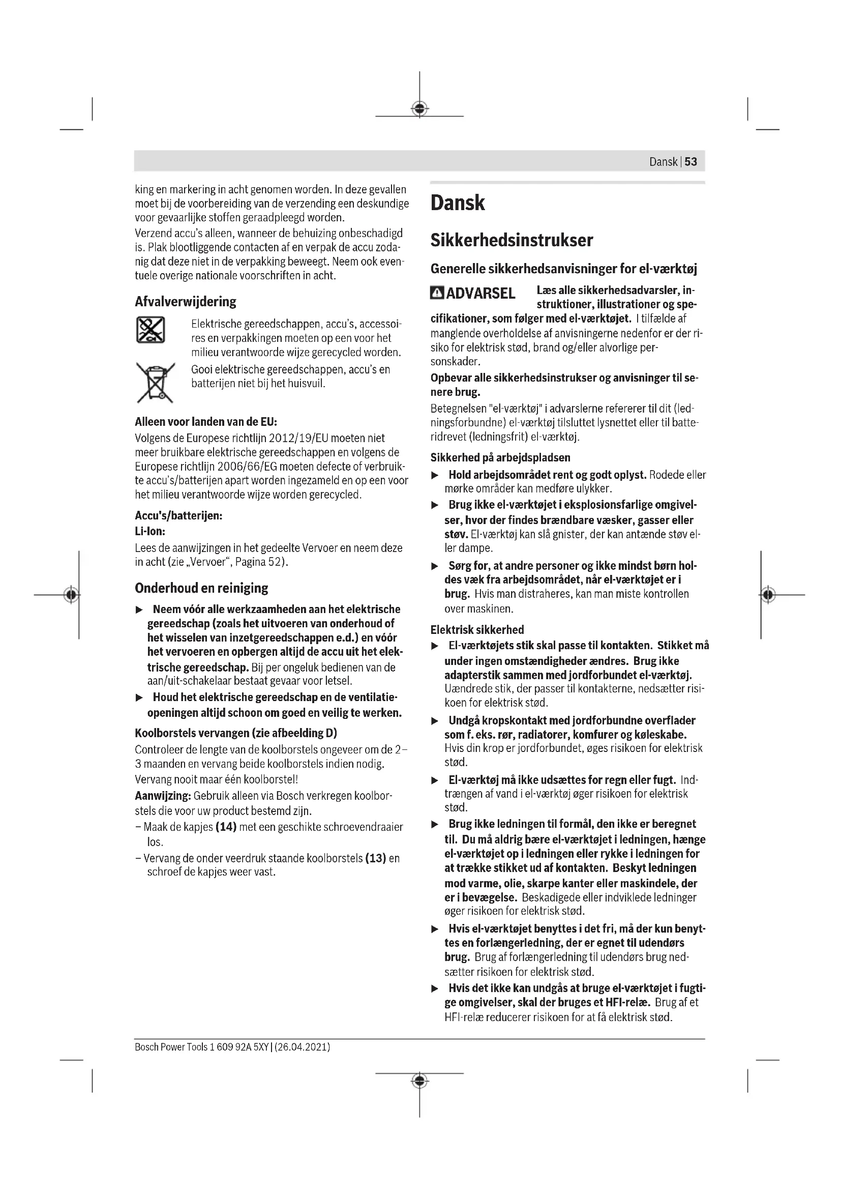M6 2.71 3.61 4.52 4.8 5.42 6.02 7.22 8.13 9.7 13.6 16.2 M8 6.57 8.7 11 11.6 13.1 14.6 17.5 19.7 23 33 39 M10 13 17.5 22 23 26 29 35 39 47 65 78 M12 22.6 30 37.6 40 45 50 60 67 80 113 135 M14 36 48 60 65 72 79 95 107 130 180 215 M16 55 73 92 98 110 122 147 165 196 275 330 Tips Vóór het indraaien van grotere, langere schroeven in harde materialen moet u met de kerndiameter van de schroefdraad ongeveer 2/3 van de schroeflengte voorboren. Aanwijzing: Let erop dat er geen kleine metaaldelen in het elektrische gereedschap binnendringen. Riemclip Met de riemclip kunt u het elektrische gereedschap bijv. aan een riem vastmaken. U heeft dan beide handen vrij en het gereedschap is altijd binnen handbereik. Aanwijzingen voor de optimale omgang met de accu Bescherm de accu tegen vocht en water. Bewaar de accu alleen bij een temperatuur tussen –20 °C en 50 °C. Laat de accu bijvoorbeeld in de zomer niet in de auto liggen. Reinig de ventilatieopeningen van de accu af en toe met een zachte, schone en droge doek. Een duidelijk kortere gebruiksduur na het opladen duidt erop dat de accu versleten is en moet worden vervangen. Neem de aanwijzingen met betrekking tot afvalverwijdering in acht. Onderhoud en service Onderhoud en reiniging u Neem vóór alle werkzaamheden aan het elektrische gereedschap (zoals het uitvoeren van onderhoud of het wisselen van inzetgereedschappen e.d.) en vóór het vervoeren en opbergen altijd de accu uit het elek- trische gereedschap. Bij per ongeluk bedienen van de aan/uit-schakelaar bestaat gevaar voor letsel. u Houd het elektrische gereedschap en de ventilatie- openingen altijd schoon om goed en veilig te werken. Koolborstels vervangen (zieafbeeldingD) Controleer de lengte van de koolborstels ongeveer om de 2– 3 maanden en vervang beide koolborstels indien nodig. Vervang nooit maar één koolborstel! Aanwijzing: Gebruik alleen via Bosch verkregen koolbor- stels die voor uw product bestemd zijn. – Maak de kapjes (14) met een geschikte schroevendraaier los. – Vervang de onder veerdruk staande koolborstels (13) en schroef de kapjes weer vast. Klantenservice en gebruiksadvies Onze klantenservice beantwoordt uw vragen over reparatie en onderhoud van uw product en over vervangingsonderde- len. Explosietekeningen en informatie over vervangingson- derdelen vindt u ook op: www.bosch-pt.com Het Bosch-gebruiksadviesteam helpt u graag bij vragen over onze producten en accessoires. Vermeld bij vragen en bestellingen van vervangingsonderde- len altijd het uit tien cijfers bestaande productnummer vol- gens het typeplaatje van het product. Nederland Tel.: (076) 579 54 54 Fax: (076) 579 54 94 E-mail: gereedschappen@nl.bosch.com Meer serviceadressen vindt u onder: www.bosch-pt.com/serviceaddresses Vervoer Op de meegeleverde Li-Ion-accu’s zijn de eisen voor het ver- voer van gevaarlijke stoffen van toepassing. De accu’s kun- nen door de gebruiker zonder verdere voorwaarden over de weg vervoerd worden. Bij de verzending door derden (bijv. luchtvervoer of expedi- tiebedrijf) moeten bijzondere eisen ten aanzien van verpak- 1 609 92A 5XY | (26.04.2021) Bosch Power ToolsDansk | 53 king en markering in acht genomen worden. In deze gevallen moet bij de voorbereiding van de verzending een deskundige voor gevaarlijke stoffen geraadpleegd worden. Verzend accu’s alleen, wanneer de behuizing onbeschadigd is. Plak blootliggende contacten af en verpak de accu zoda- nig dat deze niet in de verpakking beweegt. Neem ook even- tuele overige nationale voorschriften in acht. Afvalverwijdering Elektrische gereedschappen, accu’s, accessoi- res en verpakkingen moeten op een voor het milieu verantwoorde wijze gerecycled worden. Gooi elektrische gereedschappen, accu’s en batterijen niet bij het huisvuil. Alleen voor landen van de EU: Volgens de Europese richtlijn 2012/19/EU moeten niet meer bruikbare elektrische gereedschappen en volgens de Europese richtlijn 2006/66/EG moeten defecte of verbruik- te accu’s/batterijen apart worden ingezameld en op een voor het milieu verantwoorde wijze worden gerecycled. Accu's/batterijen: Li-Ion: Lees de aanwijzingen in het gedeelte Vervoer en neem deze in acht (zie „Vervoer“, Pagina52). Onderhoud en reiniging u Neem vóór alle werkzaamheden aan het elektrische gereedschap (zoals het uitvoeren van onderhoud of het wisselen van inzetgereedschappen e.d.) en vóór het vervoeren en opbergen altijd de accu uit het elek- trische gereedschap. Bij per ongeluk bedienen van de aan/uit-schakelaar bestaat gevaar voor letsel. u Houd het elektrische gereedschap en de ventilatie- openingen altijd schoon om goed en veilig te werken. Koolborstels vervangen (zieafbeeldingD) Controleer de lengte van de koolborstels ongeveer om de 2– 3 maanden en vervang beide koolborstels indien nodig. Vervang nooit maar één koolborstel! Aanwijzing: Gebruik alleen via Bosch verkregen koolbor- stels die voor uw product bestemd zijn. – Maak de kapjes (14) met een geschikte schroevendraaier los. – Vervang de onder veerdruk staande koolborstels (13) en schroef de kapjes weer vast. Dansk Sikkerhedsinstrukser Generelle sikkerhedsanvisninger for el-værktøj ADVARSEL Læs alle sikkerhedsadvarsler, in- struktioner, illustrationer og spe- cifikationer, som følger med el-værktøjet. I tilfælde af manglende overholdelse af anvisningerne nedenfor er der ri- siko for elektrisk stød, brand og/eller alvorlige per- sonskader. Opbevar alle sikkerhedsinstrukser og anvisninger til se- nere brug. Betegnelsen "el-værktøj" i advarslerne refererer til dit (led- ningsforbundne) el-værktøj tilsluttet lysnettet eller til batte- ridrevet (ledningsfrit) el-værktøj. Sikkerhed på arbejdspladsen u Hold arbejdsområdet rent og godt oplyst. Rodede eller mørke områder kan medføre ulykker. u Brug ikke el‑værktøjet i eksplosionsfarlige omgivel- ser, hvor der findes brændbare væsker, gasser eller støv. El‑værktøj kan slå gnister, der kan antænde støv el- ler dampe. u Sørg for, at andre person
