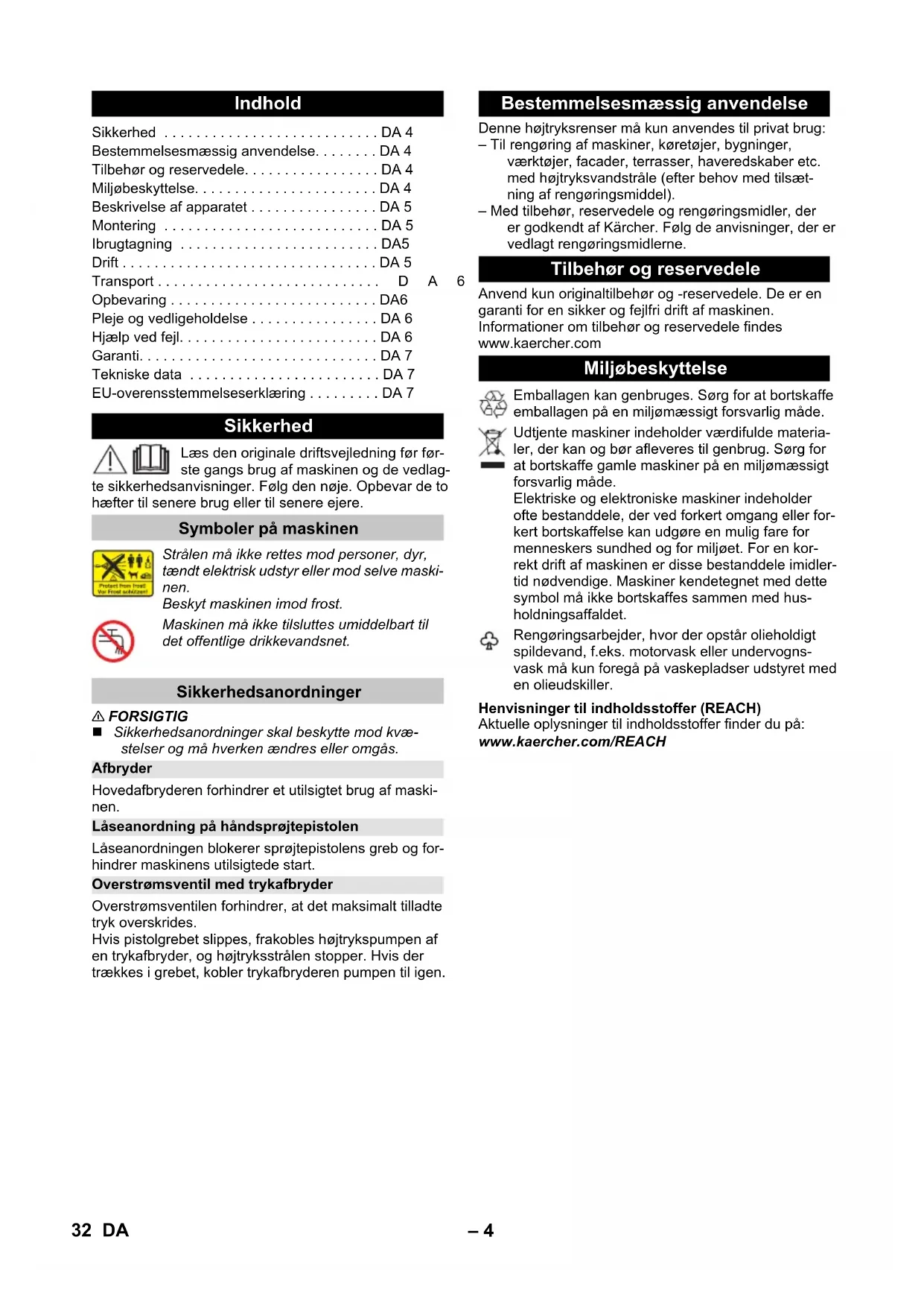 91 dB(A) Declaração UE de conformidade Produto: Lavadora de alta pressão Tipo: 1.600-xxx Respectivas Directrizes da UE 2006/42/CE (+2009/127/CE) 2014/30/UE 2011/65/UE 2000/14/CE Normas harmonizadas aplicadas EN 60335–1 EN 60335–2–79 EN 62233: 2008 EN 55014–1: 2017 EN 55014–2: 2015 EN 61000–3–2: 2014 EN 61000–3–3: 2013 EN IEC 63000: 2018 Processo aplicado de avaliação de conformidade 2000/14/CE: Anexo V Nível de potência acústica dB(A) Medido: 89 Garantido: 91 Winnenden, 2020/08/01 Chairman of the Board of Management Director Regulatory Affairs & Certification 31PT– 4 Læs den originale driftsvejledning før før- ste gangs brug af maskinen og de vedlag- te sikkerhedsanvisninger. Følg den nøje. Opbevar de to hæfter til senere brug eller til senere ejere. 몇 FORSIGTIG Sikkerhedsanordninger skal beskytte mod kvæ- stelser og må hverken ændres eller omgås. Hovedafbryderen forhindrer et utilsigtet brug af maski- nen. Låseanordningen blokerer sprøjtepistolens greb og for- hindrer maskinens utilsigtede start. Overstrømsventilen forhindrer, at det maksimalt tilladte tryk overskrides. Hvis pistolgrebet slippes, frakobles højtrykspumpen af en trykafbryder, og højtryksstrålen stopper. Hvis der trækkes i grebet, kobler trykafbryderen pumpen til igen. Denne højtryksrenser må kun anvendes til privat brug: – Til rengøring af maskiner, køretøjer, bygninger, værktøjer, facader, terrasser, haveredskaber etc. med højtryksvandstråle (efter behov med tilsæt- ning af rengøringsmiddel). – Med tilbehør, reservedele og rengøringsmidler, der er godkendt af Kärcher. Følg de anvisninger, der er vedlagt rengøringsmidlerne. Anvend kun originaltilbehør og -reservedele. De er en garanti for en sikker og fejlfri drift af maskinen. Informationer om tilbehør og reservedele findes www.kaercher.com Henvisninger til indholdsstoffer (REACH) Aktuelle oplysninger til indholdsstoffer finder du på: www.kaercher.com/REACH Indhold Sikkerhed . . . . . . . . . . . . . . . . . . . . . . . . . . . DA 4 Bestemmelsesmæssig anvendelse. . . . . . . . DA 4 Tilbehør og reservedele. . . . . . . . . . . . . . . . . DA 4 Miljøbeskyttelse. . . . . . . . . . . . . . . . . . . . . . . DA 4 Beskrivelse af apparatet . . . . . . . . . . . . . . . . DA 5 Montering . . . . . . . . . . . . . . . . . . . . . . . . . . . DA 5 Ibrugtagning . . . . . . . . . . . . . . . . . . . . . . . . . DA5 Drift . . . . . . . . . . . . . . . . . . . . . . . . . . . . . . . . DA 5 Transport . . . . . . . . . . . . . . . . . . . . . . . . . . . .DA6 Opbevaring . . . . . . . . . . . . . . . . . . . . . . . . . . DA6 Pleje og vedligeholdelse . . . . . . . . . . . . . . . . DA 6 Hjælp ved fejl. . . . . . . . . . . . . . . . . . . . . . . . . DA 6 Garanti. . . . . . . . . . . . . . . . . . . . . . . . . . . . . . DA 7 Tekniske data . . . . . . . . . . . . . . . . . . . . . . . . DA 7 EU-overensstemmelseserklæring . . . . . . . . . DA 7 Sikkerhed Symboler på maskinen Strålen må ikke rettes mod personer, dyr, tændt elektrisk udstyr eller mod selve maski- nen. Beskyt maskinen imod frost. Maskinen må ikke tilsluttes umiddelbart til det offentlige drikkevandsnet. Sikkerhedsanordninger Afbryder Låseanordning på håndsprøjtepistolen Overstrømsventil med trykafbryder Bestemmelsesmæssig anvendelse Tilbehør og reservedele Miljøbeskyttelse Emballagen kan genbruges. Sørg for at bortskaffe emballagen på en miljømæssigt forsvarlig måde. Udtjente maskiner indeholder værdifulde materia- ler, der kan og bør afleveres til genbrug. Sørg for at bortskaffe gamle maskiner på en miljømæssigt forsvarlig måde. Elektriske og elektroniske maskiner indeholder ofte bestanddele, der ved forkert omgang eller for- kert bortskaffelse kan udgøre en mulig fare for menneskers sundhed og for miljøet. For en kor- rekt drift af maskinen er disse bestanddele imidler- tid nødvendige. Maskiner kendetegnet med dette symbol må ikke bortskaffes sammen med hus- holdningsaffaldet. Rengøringsarbejder, hvor der opstår olieholdigt spildevand, f.eks. motorvask eller undervogns- vask må kun foregå på vaskepladser udstyret med en olieudskiller. 32 DA– 5 Maskinen, tilbehør m.m. vises på emballagen. Kontrol- ler ved udpakningen, om indholdet er komplet. Kontakt venligst forhandleren, hvis der mangler tilbehør eller ved transportskader. Se figurerne på side 2 1 Vandtilslutning med integreret si 2 Tilkoblingsdel til vandforsyning 3 Højtrykstilslutning 4 Rum til tilbehør 5 Bæregreb 6 Strømledning med netstik 7 Kalbelclips 8 Opbevaring til strømledningen 9 Hovedafbryder „0/OFF“ / „I/ON“ 10 Håndsprøjtepistol 11 Låseanordning på håndsprøjtepistolen 12 Klemme til højtryksslangen 13 Sikringsmuffe 14 Strålerørsforlængelse 15 Strålerør med trykregulering (Vario Power) Arbejdstrykket kan øges trinløst fra "SOFT" til "HARD". Giv slip på højtrykspistolens greb, og drej strålerøret til den ønskede stilling for at justere ar- bejdstrykket. 16 Højtryksslange 17 Vandtilførselsslange 18 Slangekobling 19 Slangekobling (Aqua Stop) 20 Hanetilslutning til indvendige armaturer Løse komponenter, som er vedlagt maskinen, skal før brugen monteres. Se figurerne på side 3 Figur Skru den medfølgende koblingsdel på højtryksren- serens vandtilslutning. Figur Træk clipsen til højtryksslangen ud af håndsprøjte- pistolen. Figur Stik højtryksslangen ind i håndsprøjtepistolen. Tryk klemmen ind indtil den går i hak. Kontroller om forbindelsen er sikker ved at trække i højtryksslan- gen. Stil apparatet på en plan flade. Figur Højtryksslangen kobles til maskinens højtrykstil- slutning. Kontroller om forbindelsen er sikker ved at trække i højtryksslangen. Sæt netstikket i en stikdåse. Se typeskilt/tekniske data for tilslutningsværdier Læg mærke til vandforsyningsselskabets reglementer. BEMÆRK Forureninger i vandet kan beskadige højtrykspumpen og tilbehøret. For at beskytte maskinen anbefales brug af 