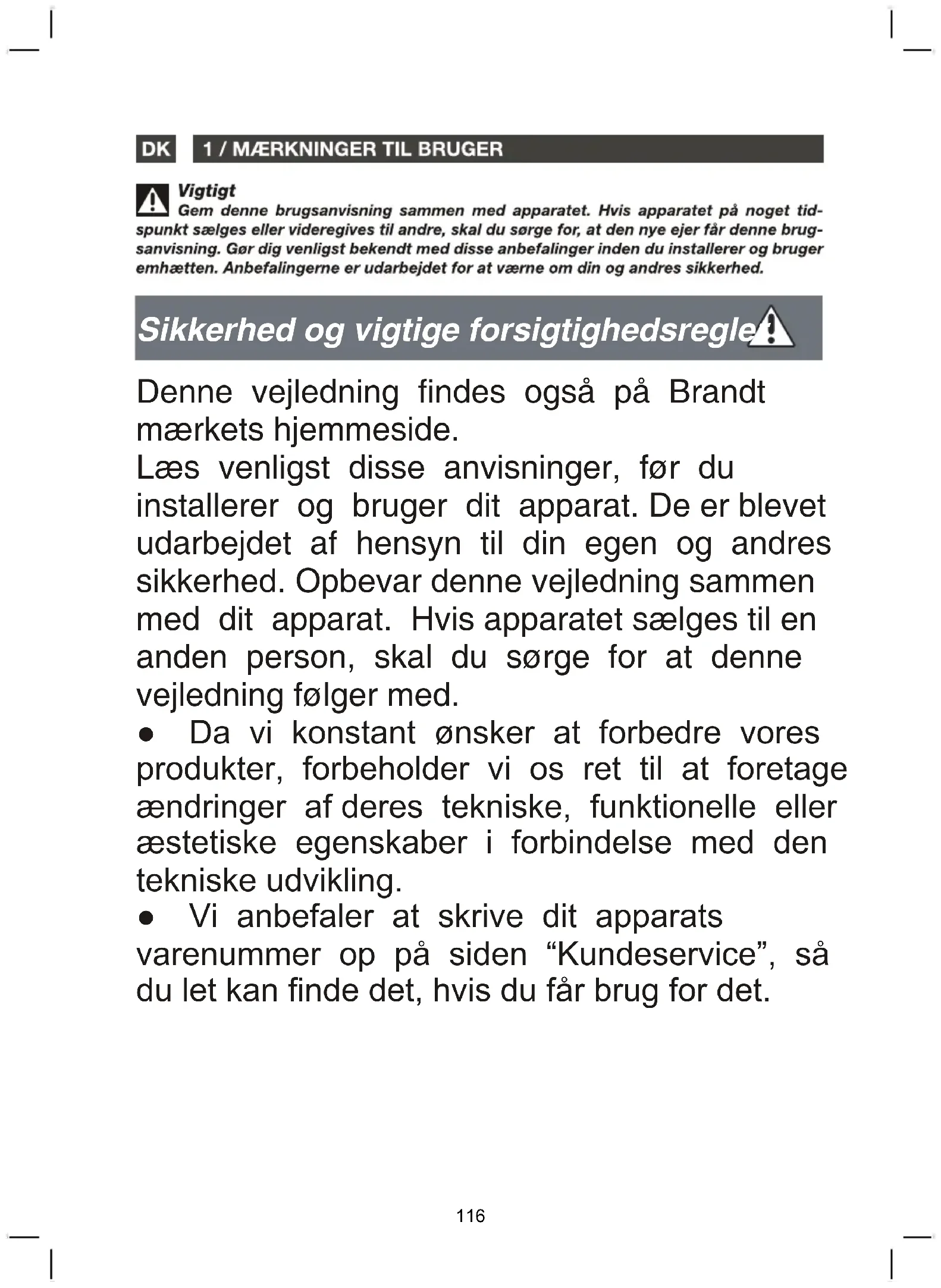 133Sikkerhed og vigtige forsigtighedsregler Denne vejledning findes også på Brandt mærkets hjemmeside. Læs venligst disse anvisninger, før du installerer og bruger dit apparat. De er blevet udarbejdet af hensyn til din egen og andres sikkerhed. Opbevar denne vejledning sammen med dit apparat. Hvis apparatet sælges til en anden person, skal du sørge for at denne vejledning følger med. ● Da vi konstant ønsker at forbedre vores produkter, forbeholder vi os ret til at foretage ændringer af deres tekniske, funktionelle eller æstetiske egenskaber i forbindelse med den tekniske udvikling. ● Vi anbefaler at skrive dit apparats varenummer op på siden “Kundeservice”, så du let kan finde det, hvis du får brug for det. 116Vigtige forsigtighedsregler Dette apparat er designet til at blive brugt i en almindelig husholdning. Det må ikke anvendes til en erhvervsmæssig eller industriel brug eller til andre formål end det, det er beregnet til. ● Når dette apparat modtages, skal det straks pakkes ud. Kontroller apparatets generelle fremtoning. Formuler eventuelle forbehold skriftligt på fragtsedlen og behold et eksemplar af den. ● Dette apparat kan bruges af børn på mindst 8 år og af personer med et fysisk, sensorisk eller mentalt handicap eller manglende kendskab, hvis de er under korrekt opsyn eller hvis de har modtaget instrukser om sikker brug af apparat og hvis der er taget højde for de risici, de udsætter sig for. Børn må ikke lege med apparatet. Brugerens rengøring og vedligeholdelse af apparatet må ikke udføres af børn uden opsyn. OBS: De dele, der er tilgængelige på denne emhætte, kan blive meget varme, når emhætten bruges over et komfur.