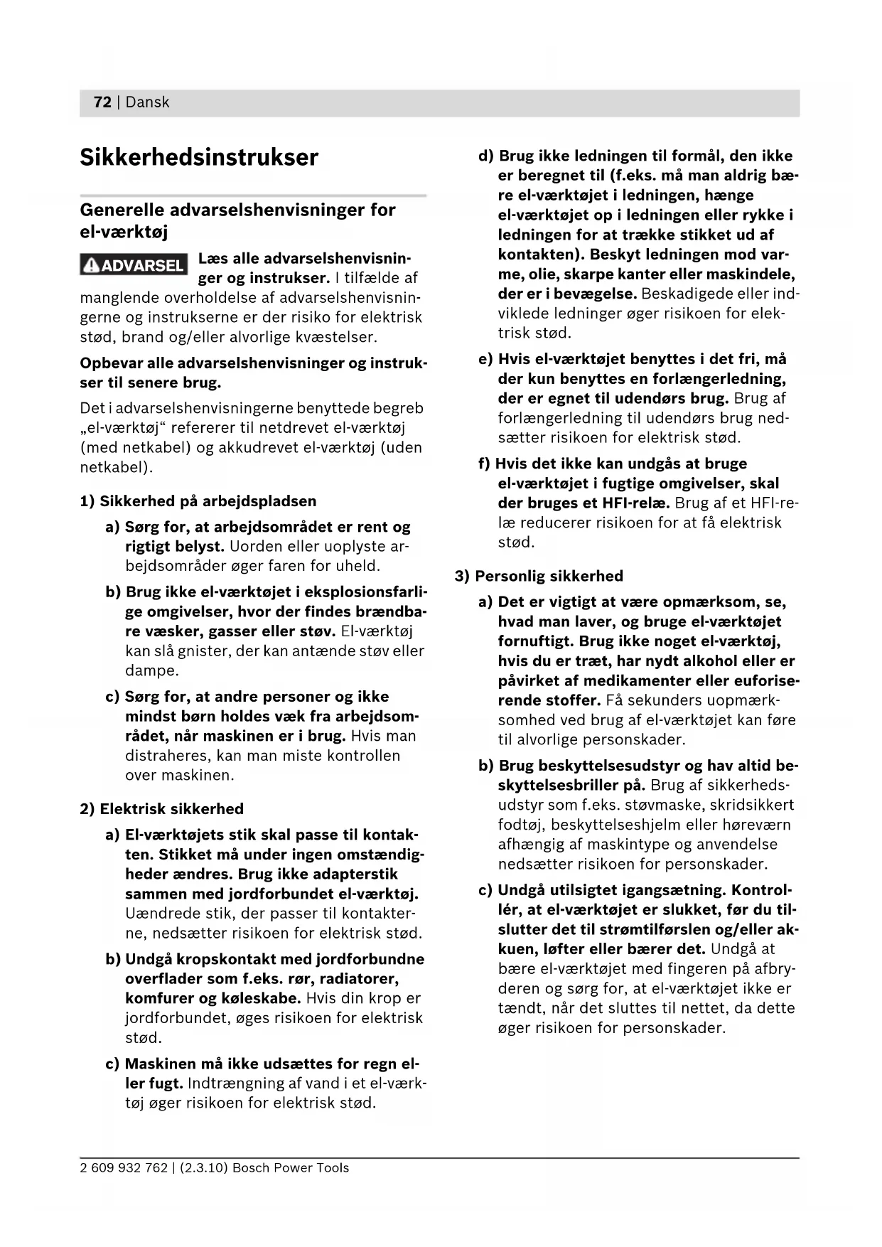 a) Det er vigtigt at være opmærksom, se, hvad man laver, og bruge el-værktøjet fornuftigt. Brug ikke noget el-værktøj, hvis du er træt, har nydt alkohol eller er påvirket af medikamenter eller euforise- rende stoffer. Få sekunders uopmærk- somhed ved brug af el-værktøjet kan føre til alvorlige personskader. b) Brug beskyttelsesudstyr og hav altid be- skyttelsesbriller på. Brug af sikkerheds- udstyr som f.eks. støvmaske, skridsikkert fodtøj, beskyttelseshjelm eller høreværn afhængig af maskintype og anvendelse nedsætter risikoen for personskader. c) Undgå utilsigtet igangsætning. Kontrol- lér, at el-værktøjet er slukket, før du til- slutter det til strømtilførslen og/eller ak- kuen, løfter eller bærer det. Undgå at bære el-værktøjet med fingeren på afbry- deren og sørg for, at el-værktøjet ikke er tændt, når det sluttes til nettet, da dette øger risikoen for personskader. ADVARSEL OBJ_BUCH-824-002.book Page 72 Tuesday, March 2, 2010 9:44 AMDansk | 73 Bosch Power Tools 2 609 932 762 | (2.3.10) d) Gør det til en vane altid at fjerne indstil- lingsværktøj eller skruenøgle, før el-værktøjet tændes. Hvis et stykke værk- tøj eller en nøgle sidder i en roterende maskindel, er der risiko for personskader. e) Undgå en anormal legemsposition. Sørg for at stå sikkert, mens der arbejdes, og kom ikke ud af balance. Dermed har du bedre muligheder for at kontrollere el-værktøjet, hvis der skulle opstå uvente- de situationer. f) Brug egnet arbejdstøj. Undgå løse be- klædningsgenstande eller smykker. Hold hår, tøj og handsker væk fra dele, der be- væger sig. Dele, der er i bevægelse, kan gribe fat i løstsiddende tøj, smykker eller langt hår. g) Hvis støvudsugnings- og opsamlingsud- styr kan monteres, er det vigtigt, at det- te tilsluttes og benyttes korrekt. Brug af en støvopsugning kan reducere støv- mængden og dermed den fare, der er for- bundet støv.