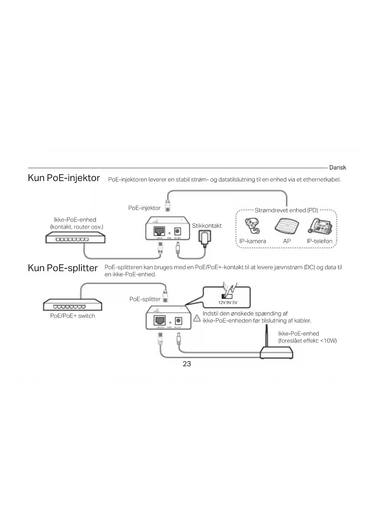 PWR DC OUT PoE Splitter 12V 9V 5V Strømdrevet enhed (PD)Stikkontakt Ikke-PoE-enhed (foreslået eekt: <10W) Dansk PoE-injektor PoE-splitter PoE-injektor og -splitter PoE-injektoren og PoE-splitteren kan bruges som et sæt til at levere strøm og sende data til en ikke-PoE-enhed. Ikke-PoE-enhed (kontakt, router osv.) Indstil den ønskede spænding af ikke-PoE-enheden før tilslutning af kabler. PoE InjectorLAN IN PWR