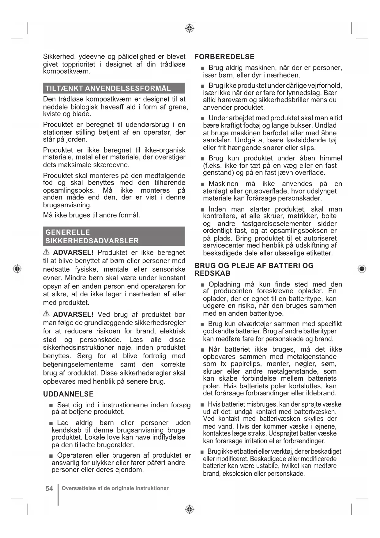 Læs og forstå alle anvisninger inden betjening af produktet. Overhold alle advarsler og sikkerhedsanvisninger. Pas på udslyngede eller fl yvende objekter. Sørg for, at tilskuere (især børn og dyr) har mindst 15 m afstand fra arbejdsområdet. Advarsel! Frakobl batteriet inden vedligeholdelse, justering og rengøring. Fare! Roterende klinger. Hold hænder og fødder på afstand af åbninger, mens produktet kører. Bær øjen- og høreværn. Må ikke bruges som trappetrin. Vent, indtil alle produktets dele er helt stoppet, før du berører dem.