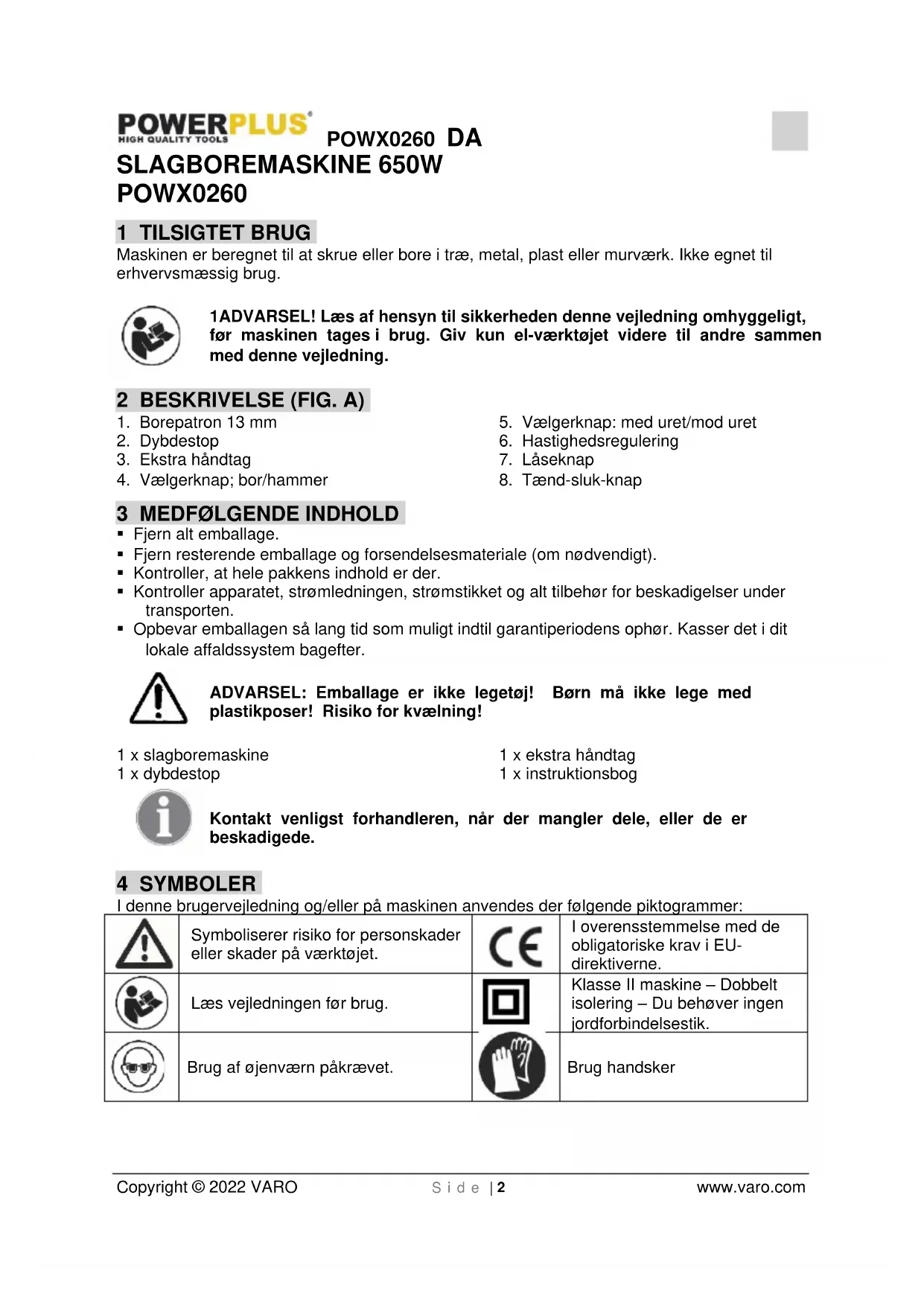 Copyright © 2022 VARO S i d e | 2 www.varo.com SLAGBOREMASKINE 650W POWX0260 1 TILSIGTET BRUG Maskinen er beregnet til at skrue eller bore i træ, metal, plast eller murværk. Ikke egnet til erhvervsmæssig brug. 1ADVARSEL! Læs af hensyn til sikkerheden denne vejledning omhyggeligt, før maskinen tages i brug. Giv kun el-værktøjet videre til andre sammen med denne vejledning. 2 BESKRIVELSE (FIG. A)
