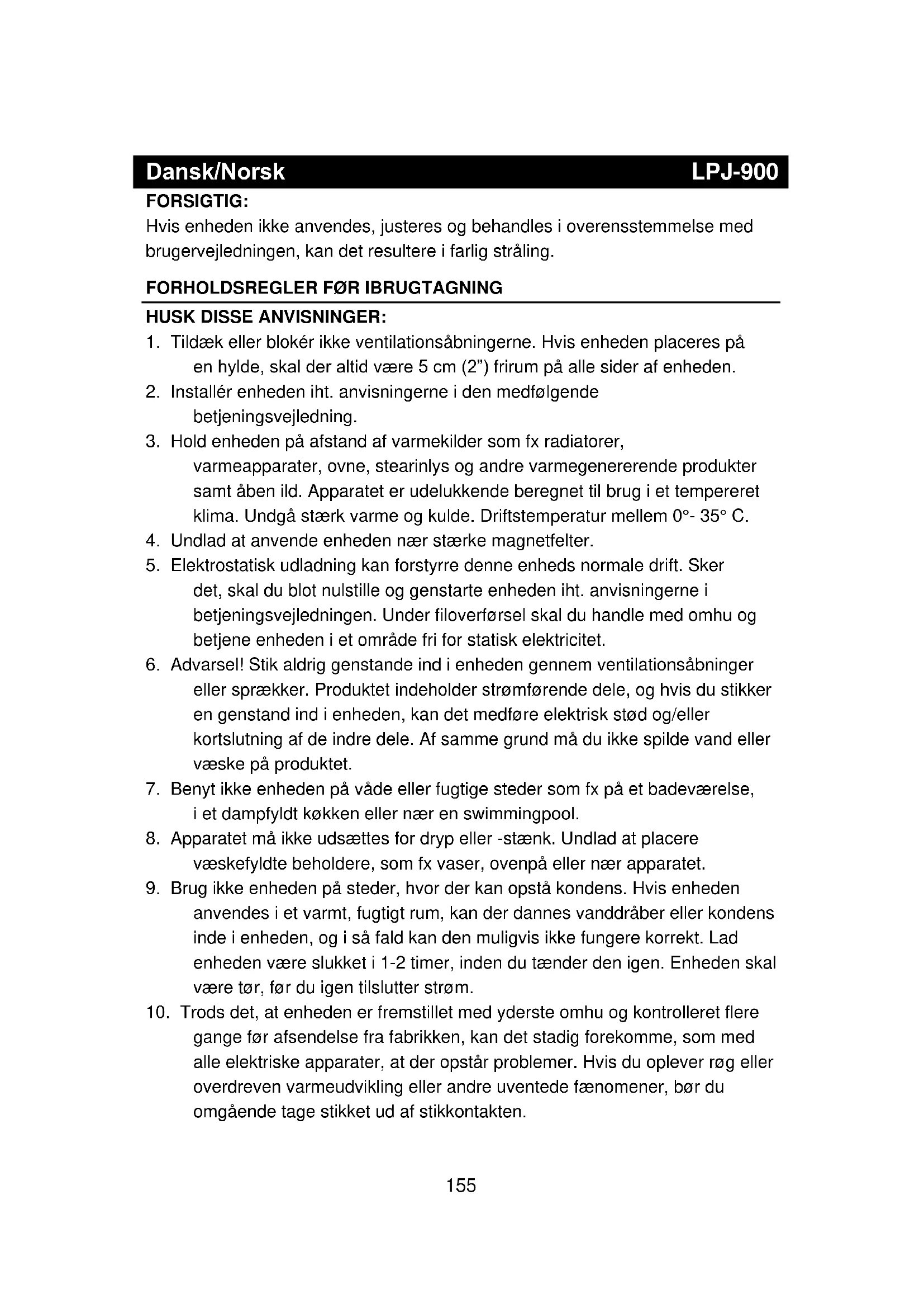 gange før afsendelse fra fabrikken, kan det stadig forekomme, som med alle elektriske apparater, at der opstår problemer. Hvis du oplever røg eller overdreven varmeudvikling eller andre uventede fænomener, bør du omgående tage stikket ud af stikkontakten.156