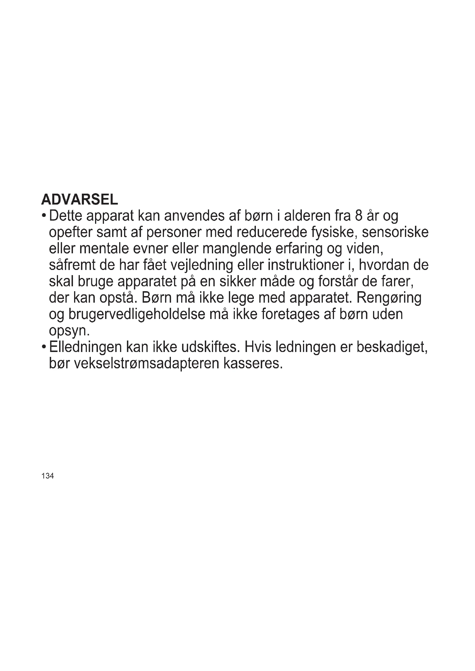 Dette apparat kan anvendes af børn i alderen fra 8 år og opefter samt af personer med reducerede fysiske, sensoriske eller mentale evner eller manglende erfaring og viden, såfremt de har fået vejledning eller instruktioner i, hvordan de skal bruge apparatet på en sikker måde og forstår de farer, der kan opstå. Børn må ikke lege med apparatet. Rengøring og brugervedligeholdelse må ikke foretages af børn uden opsyn.
