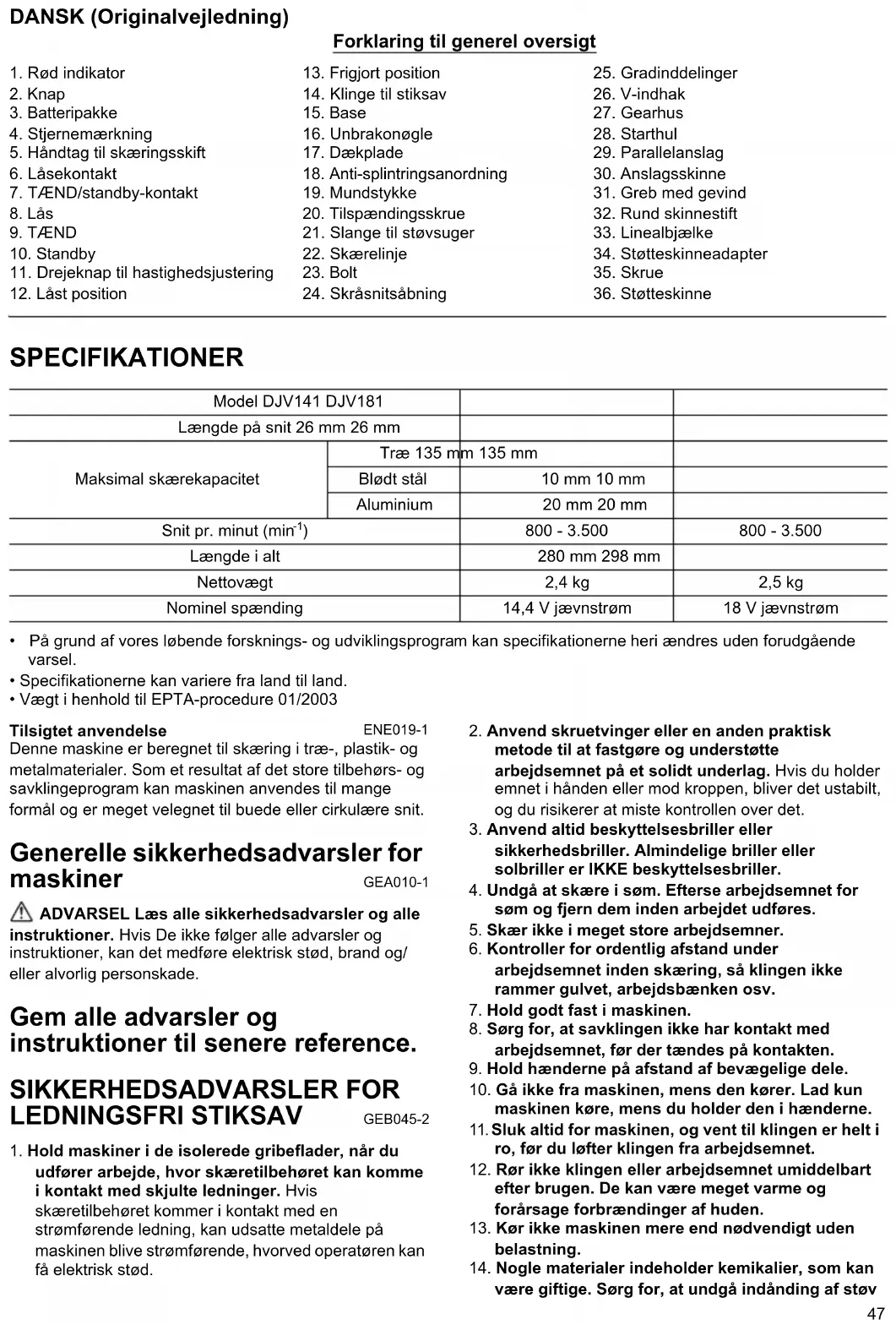 - Vægt i henhold til EPTA-procedure 01/2003 Tilsigtet anvendelse ENE019-1 Denne maskine er beregnet til skæring i træ-, plastik- og metalmaterialer. Som et resultat af det store tilbehørs- og savklingeprogram kan maskinen anvendes til mange formål og er meget velegnet til buede eller cirkulære snit. Generelle sikkerhedsadvarsler for maskiner GEA010-1 ADVARSEL Læs alle sikkerhedsadvarsler og alle instruktioner. Hvis De ikke følger alle advarsler og instruktioner, kan det medføre elektrisk stød, brand og/ eller alvorlig personskade. Gem alle advarsler og instruktioner til senere reference. SIKKERHEDSADVARSLER FOR LEDNINGSFRI STIKSAV GEB045-2