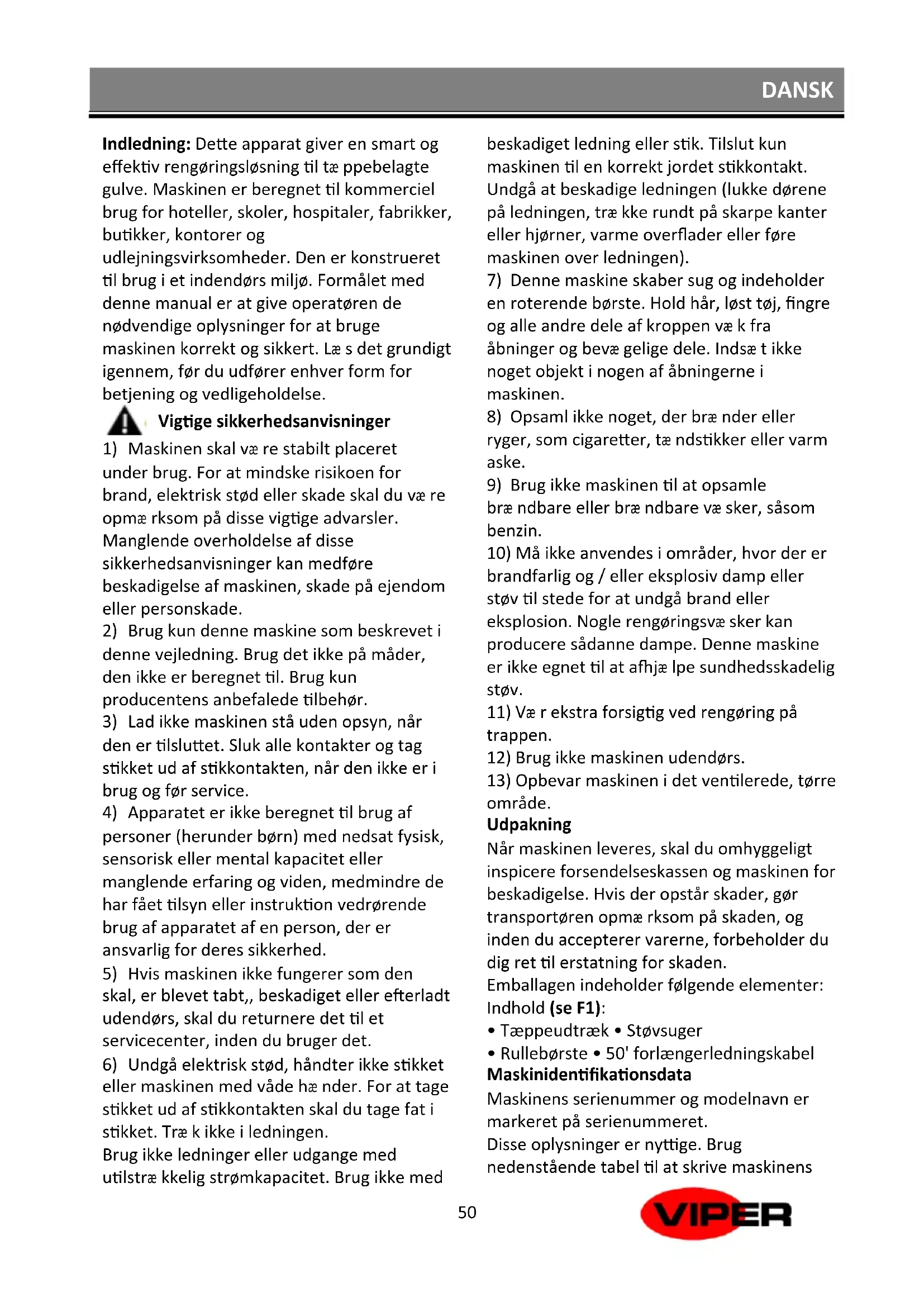 Indledning: Dette apparat giver en smart og effektiv rengøringsløsning til tæ ppebelagte gulve. Maskinen er beregnet til kommerciel brug for hoteller, skoler, hospitaler, fabrikker, butikker, kontorer og udlejningsvirksomheder. Den er konstrueret til brug i et indendørs miljø. Formålet med denne manual er at give operatøren de nødvendige oplysninger for at bruge maskinen korrekt og sikkert. Læ s det grundigt igennem, før du udfører enhver form for betjening og vedligeholdelse.