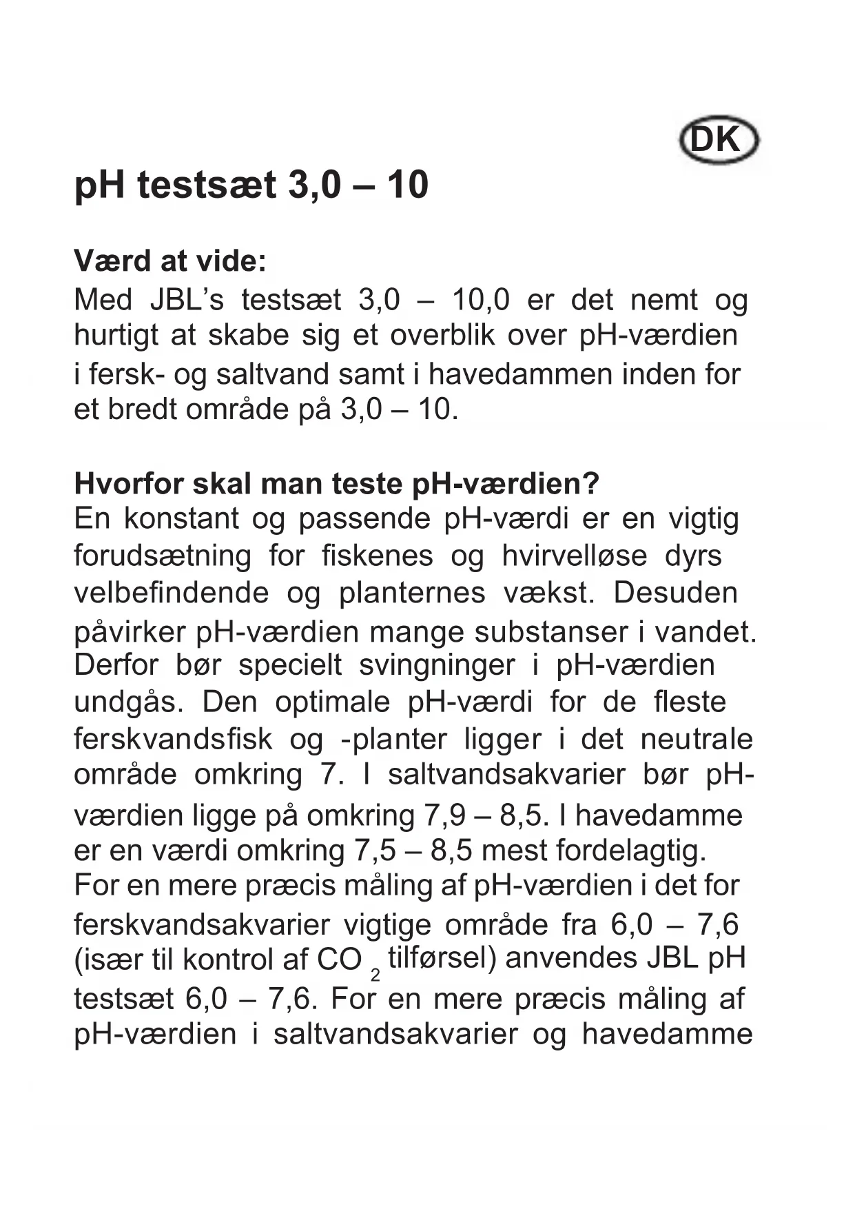 tilførsel) anvendes JBL pH testsæt 6,0 – 7,6. For en mere præcis måling af pH-værdien i saltvandsakvarier og havedammeDK anvendes JBL pH testsæt 7,4 – 9,0. Afhjælp ved afvigende pH-værdi: Ferskvandsakvariet: Sænk pH-værdien med JBL pH-Minus, endnu bedre er det dog at tilføre CO