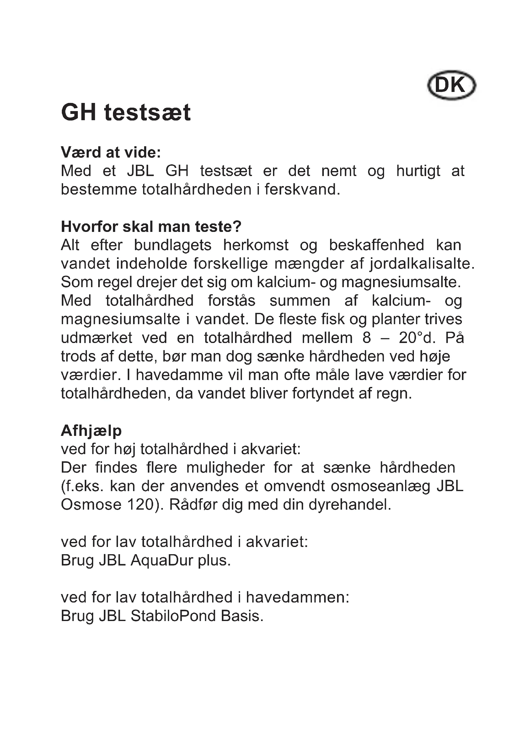 0,01 0,020 0,056 - 0,0702 0,10 Gradi inglesi °e 0,14 0,285 0,798 14,30 - 1,43 Gradi francesi °f 0,10 0,200 0,560 10,00 0,702 -DK GH testsæt Værd at vide: Med et JBL GH testsæt er det nemt og hurtigt at bestemme totalhårdheden i ferskvand. Hvorfor skal man teste? Alt efter bundlagets herkomst og beskaffenhed kan vandet indeholde forskellige mængder af jordalkalisalte. Som regel drejer det sig om kalcium- og magnesiumsalte. Med totalhårdhed forstås summen af kalcium- og magnesiumsalte i vandet. De este sk og planter trives udmærket ved en totalhårdhed mellem 8 – 20°d. På trods af dette, bør man dog sænke hårdheden ved høje værdier. I havedamme vil man ofte måle lave værdier for totalhårdheden, da vandet bliver fortyndet af regn. Afhjælp ved for høj totalhårdhed i akvariet: Der ndes ere muligheder for at sænke hårdheden (f.eks. kan der anvendes et omvendt osmoseanlæg JBL Osmose 120). Rådfør dig med din dyrehandel. ved for lav totalhårdhed i akvariet: Brug JBL AquaDur plus. ved for lav totalhårdhed i havedammen: Brug JBL StabiloPond Basis.DK Sådan gør du: