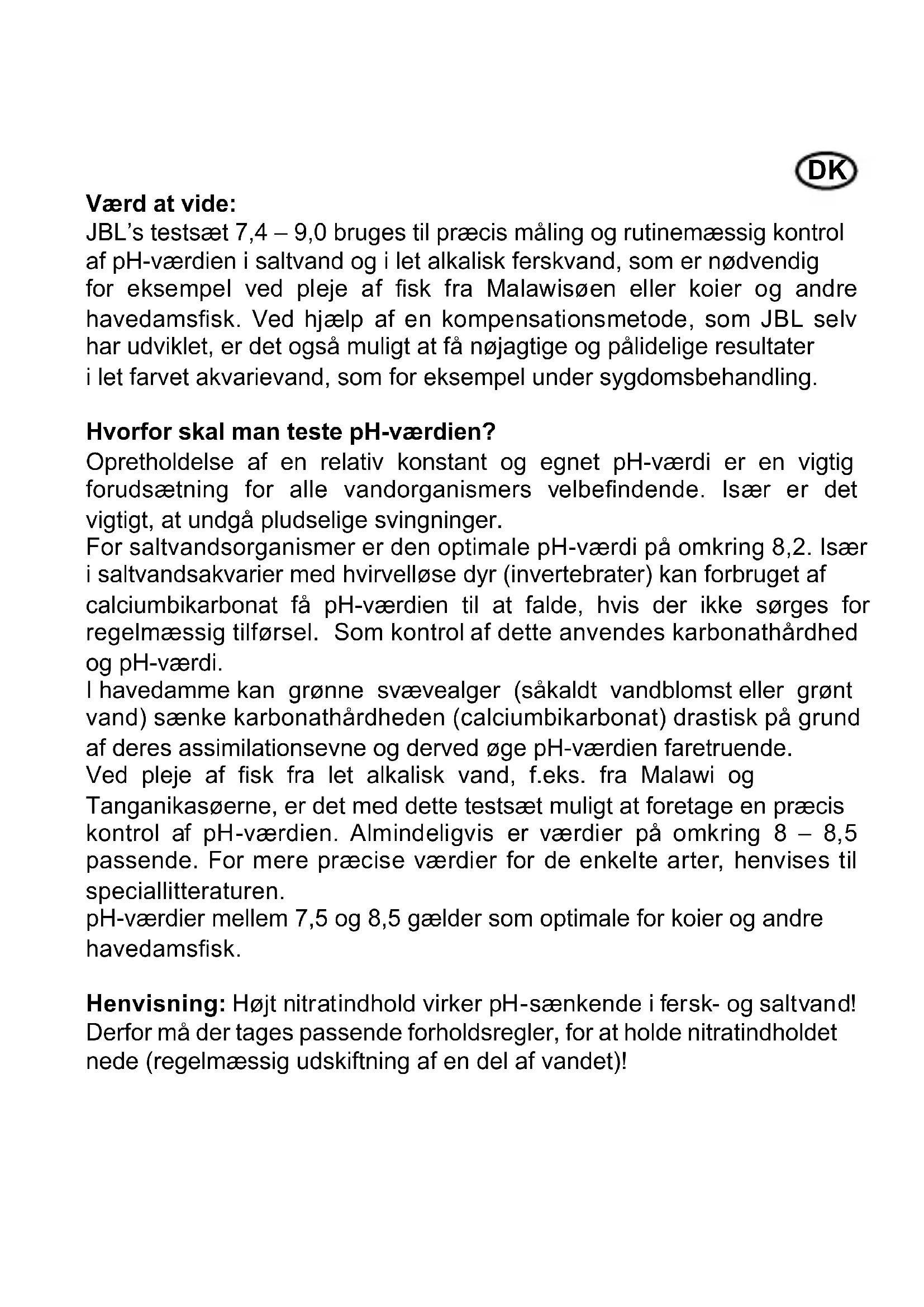 Il nostro suggerimento per acquarioli che rispettano l’ambiente: Tutti i reagenti per i kit JBL si trovano in commercio in economiche confezioni ricaricabili. Sul retro della scala colorimetrica si trova una spiegazione illustrata che facilita il procedimento. Avvertenze e consigli di prudenza Reagente del test kit pH 7,4 – 9,0 Attenzione H226 Liquido e vapori inammabili. P102 Tenere fuori dalla portata dei bambini. P210 Tenere lontano da fonti di calore/scintille/amme libere/ superci riscaldate. – Non fumare. P233 Tenere il recipiente ben chiuso. P280 Indossare guanti/indumenti protettivi/Proteggere gli occhi/il viso. P303+361+353 IN CASO DI CONTATTO CON LA PELLE (o con i capelli): togliersi di dosso immediatamente tutti gli indumenti contaminati. Sciacquare la pelle/fare una doccia. P403+235 Conservare in luogo fresco e ben ventilato. ITDK Værd at vide: JBL’s testsæt 7,4 – 9,0 bruges til præcis måling og rutinemæssig kontrol af pH-værdien i saltvand og i let alkalisk ferskvand, som er nødvendig for eksempel ved pleje af sk fra Malawisøen eller koier og andre havedamssk. Ved hjælp af en kompensationsmetode, som JBL selv har udviklet, er det også muligt at få nøjagtige og pålidelige resultater i let farvet akvarievand, som for eksempel under sygdomsbehandling. Hvorfor skal man teste pH-værdien? Opretholdelse af en relativ konstant og egnet pH-værdi er en vigtig forudsætning for alle vandorganismers velbendende. Især er det vigtigt, at undgå pludselige svingninger. For saltvandsorganismer er den optimale pH-værdi på omkring 8,2. Især i saltvandsakvarier med hvirvelløse dyr (invertebrater) kan forbruget af calciumbikarbonat få pH-værdien til at falde, hvis der ikke sørges for regelmæssig tilførsel. Som kontrol af dette anvendes karbonathårdhed og pH-værdi. I havedamme kan grønne svævealger (såkaldt vandblomst eller grønt vand) sænke karbonathårdheden (calciumbikarbonat) drastisk på grund af deres assimilationsevne og derved øge pH-værdien faretruende. Ved pleje af sk fra let alkalisk vand, f.eks. fra Malawi og Tanganikasøerne, er det med dette testsæt muligt at foretage en præcis kontrol af pH-værdien. Almindeligvis er værdier på omkring 8 – 8,5 passende. For mere præcise værdier for de enkelte arter, henvises til speciallitteraturen. pH-værdier mellem 7,5 og 8,5 gælder som optimale for koier og andre havedamssk. Henvisning: Højt nitratindhold virker pH-sænkende i fersk- og saltvand! Derfor må der tages passende forholdsregler, for at holde nitratindholdet nede (regelmæssig udskiftning af en del af vandet)!DK Afhjælp ved afvigende pH-værdi: Sænkning af pH-værdien: Ferskvandsakvarium: Ved behov ved at tilføre af CO