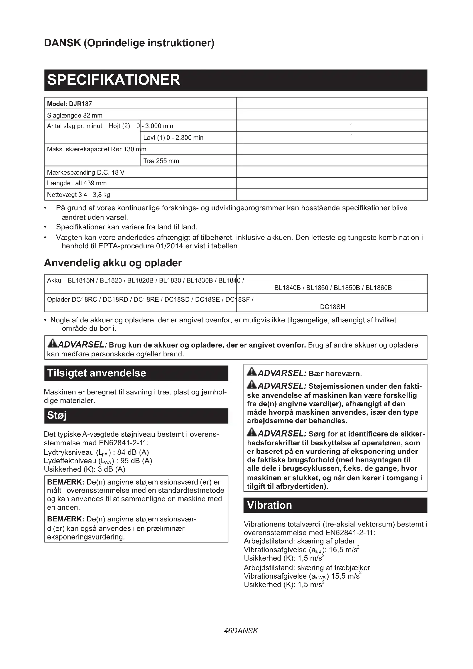 - Nogle af de akkuer og opladere, der er angivet ovenfor, er muligvis ikke tilgængelige, afhængigt af hvilket områdedubori. ADVARSEL: Brug kun de akkuer og opladere, der er angivet ovenfor. Brug af andre akkuer og opladere kanmedførepersonskadeog/ellerbrand. Tilsigtet anvendelse Maskinenerberegnettilsavningitræ,plastogjernhol- dige materialer. Støj DettypiskeA-vægtedestøjniveaubestemtioverens- stemmelsemedEN62841-2-11: Lydtryksniveau(L