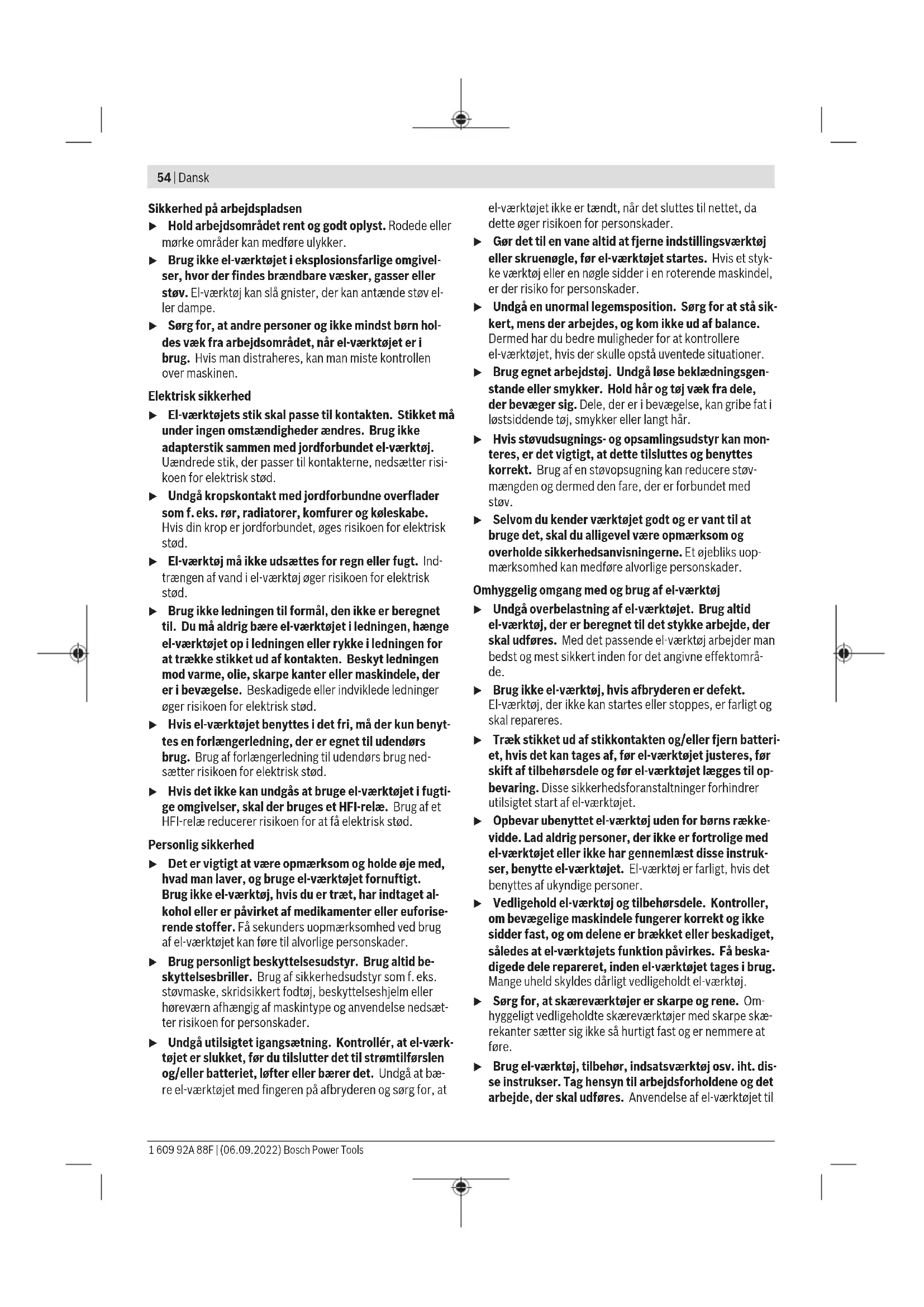 Haal het rechthoekige schuurplateau(12) eraf. Speciale schuurplateaus U kunt het meegeleverde schuurplateau (10) vervangen door een als accessoire verkrijgbaar speciaal schuurplateau. De montage van het speciale schuurplateau gebeurt op de- zelfde manier als het verwisselen van het meegeleverde schuurplateau. Het aanbrengen en verwijderen van het desbetreffende schuurblad gebeurt op dezelfde manier als het verwisselen van het originele schuurblad. Het gebruik van de speciale schuurplateaus is alleen met ge- monteerd achterste schuurplateau(11) toegestaan. Lamellenvoorzetstuk (zie afbeelding H) Met het lamellenvoorzetstuk (18) kunt u zeer moeilijk be- reikbare plaatsen, zoals bijv. lamellen bij ramen, kasten of deuren, bewerken. Schuurtong, plat (zie afbeelding I) Met de platte schuurtong (20) kunt u smalle sleuven en nau- we tussenruimten bewerken. Het schuurblad voor schuurtong(19) wordt zoals het voor- ste schuurblad(17) gemonteerd. Schuurtong, ovaal (zie afbeelding I) Met de ovale schuurtong (21) kunt u rondingen en holle ruimten bewerken, of naar binnen gebogen vlakken, bijvoor- beeld van meubels, leuningen of radiatoren. Het schuurblad voor schuurtong(19) wordt zoals het voor- ste schuurblad(17) gemonteerd. Gebruik Ingebruikname In- en uitschakelen u Zorg ervoor dat u de aan/uit-schakelaar kunt bedienen zonder de handgreep los te laten. Voor het inschakelen van het elektrische gereedschap kan- telt u de aan/uit-schakelaar (2) naar rechts in positie „I“. Voor het uitschakelen van het elektrische gereedschap kan- telt u de aan/uit-schakelaar (2) naar links in positie „O“. Temperatuurafhankelijke beveiliging tegen overbelasting Bij beoogd gebruik kan het elektrische gereedschap niet overbelast worden. Bij een te sterke belasting of het over- schrijden van de toegestane accutemperatuur schakelt de elektronica het elektrische gereedschap uit tot dit zich weer in het optimale werktemperatuurbereik bevindt. Aantal schuurbewegingen instellen Met het stelwiel voorselectie trilfrequentie (1) kunt u de be- nodigde trilfrequentie ook tijdens het bedrijf voorselecteren. De benodigde trilfrequentie is afhankelijk van het materiaal en de werkomstandigheden en kan proefsgewijs worden vastgesteld. Aanwijzingen voor de werkzaamheden u Neem vóór alle werkzaamheden aan het elektrische gereedschap (zoals het uitvoeren van onderhoud of het wisselen van inzetgereedschappen e.d.) en vóór het vervoeren en opbergen altijd de accu uit het elek- trische gereedschap. Bij per ongeluk bedienen van de aan/uit-schakelaar bestaat gevaar voor letsel. u Wacht tot het elektrische gereedschap tot stilstand is gekomen voordat u het neerlegt. Kies bij het polijsten een laag toerental om overmatige op- warming van het oppervlak te voorkomen. 1 609 92A 88F | (06.09.2022) Bosch Power ToolsDansk | 53 De afnamecapaciteit bij het schuren wordt in hoofdzaak be- paald door de keuze van het schuurblad en door het ingestel- de aantal schuurbewegingen (1). Alleen onbeschadigde schuurbladen zorgen voor een goede schuurcapaciteit en ontzien het elektrische gereedschap. Let op een gelijkmatige aandrukkracht om de levensduur van de schuurbladen te verlengen. Een overmatige verhoging van de aandrukkracht leidt niet tot een groter schuurvermogen, maar wel tot een sterkere slijtage van het elektrische gereedschap en het schuurblad. Voor zeer nauwkeurig schuren van hoeken, randen en moei- lijk bereikbare gebieden kunt u ook alleen met de punt of een rand van het schuurplateau werken. Gebruik een schuurblad waarmee metaal is bewerkt niet meer voor andere materialen. Gebruik uitsluitend originele Bosch-schuuraccessoires. Onderhoud en service Onderhoud en reiniging u Neem vóór alle werkzaamheden aan het elektrische gereedschap (zoals het uitvoeren van onderhoud of het wisselen van inzetgereedschappen e.d.) en vóór het vervoeren en opbergen altijd de accu uit het elek- trische gereedschap. Bij per ongeluk bedienen van de aan/uit-schakelaar bestaat gevaar voor letsel. u Houd het elektrische gereedschap en de ventilatie- openingen altijd schoon om goed en veilig te werken. Klantenservice en gebruiksadvies Onze klantenservice beantwoordt uw vragen over reparatie en onderhoud van uw product en over vervangingsonderde- len. Explosietekeningen en informatie over vervangingson- derdelen vindt u ook op: www.bosch-pt.com Het Bosch-gebruiksadviesteam helpt u graag bij vragen over onze producten en accessoires. Vermeld bij vragen en bestellingen van vervangingsonderde- len altijd het uit tien cijfers bestaande productnummer vol- gens het typeplaatje van het product. Nederland Tel.: (076) 579 54 54 Fax: (076) 579 54 94 E-mail: gereedschappen@nl.bosch.com Meer serviceadressen vindt u onder: www.bosch-pt.com/serviceaddresses Vervoer Op de aanbevolen Li-Ion-accu’s zijn de eisen voor het ver- voer van gevaarlijke stoffen van toepassing. De accu’s kun- nen door de gebruiker zonder verdere voorwaarden over de weg vervoerd worden. Bij de verzending door derden (bijv. luchtvervoer of expedi- tiebedrijf) moeten bijzondere eisen ten aanzien van verpak- king en markering in acht genomen worden. In deze gevallen moet bij de voorbereiding van de verzending een deskundige voor gevaarlijke stoffen geraadpleegd worden. Verzend accu’s alleen, wanneer de behuizing onbeschadigd is. Plak blootliggende contacten af en verpak de accu zoda- nig dat deze niet in de verpakking beweegt. Neem ook even- tuele overige nationale voorschriften in acht. Afvalverwijdering Elektrische gereedschappen, accu’s, accessoi- res en verpakkingen moeten op een voor het milieu verantwoorde wijze gerecycled worden. Gooi elektrische gereedschappen, accu’s en batterijen niet bij het huisvuil. Alleen voor landen van de EU: Volgens de Europese richtlijn 2012/19/EU inzake afgedank- te elektrische en elektronische apparatuur en de implemen- tatie in nationaal recht moeten niet meer bruikbare elektri- sche gereedschappen en volgens de Europese richtlijn 2006/66/EG moeten defecte of