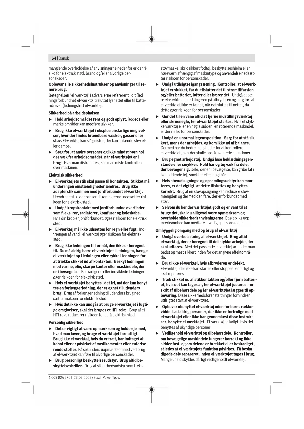 Det svingningsniveau og støjemissionsniveau, der fremgår af anvisningerne, er målt iht. en standardiseret måleværdi og kan anvendes til sammenligning af elværktøj med hinanden. De er også egnet til en foreløbig vurdering af svingnings- og støjemissionen. Det angivne svingnings- og støjemissionsniveau repræsente- rer de væsentlige anvendelser af el‑værktøjet. Hvis el‑værk- tøjet dog anvendes til andre formål, med afvigende indsats- værktøj eller utilstrækkelig vedligeholdelse, kan svingnings- og støjemissionsniveauet afvige. Dette kan føre til en betyde- lig forøgelse af svingnings- og støjemissionen i hele arbejds- tidsrummet. Til en nøjagtig vurdering af svingnings- og støjemissionen bør der også tages højde for de tider, i hvilke værktøjet er sluk- ket eller godt nok kører, men rent faktisk ikke anvendes. Det- te kan føre til en betydelig reduktion af svingnings- og støje- missionsniveauet i hele arbejdstidsrummet. Fastlæg ekstra sikkerhedsforanstaltninger til beskyttelse af brugeren mod svingningers virkning som f.eks.: Vedligehol- delse af el‑værktøj og indsatsværktøj, holde hænder varme, organisation af arbejdsforløb. Bosch Power Tools 1 609 92A 8PC | (23.03.2023)68 | Dansk Akku Bosch sælger også akku-værktøjer uden akku. Om der følger en akku med din leverance fremgår af emballagen. Opladning af akku u Brug kun de ladeaggregater, der fremgår af de tekni- ske data. Kun disse ladeaggregater er afstemt i forhold til den Li-ion-akku, der bruges på dit el-værktøj. Bemærk! Lithium-ion-akkuer udleveres delvis opladet på grund af internationale transportforskrifter. For at sikre at akkuen fungerer 100%, skal du oplade akkuen helt i op- laderen før første ibrugtagning. Isætning af akku Skub den opladede akkuind i akkuholderen, så den går hør- bart i indgreb. Udtagning af akku Akkuen tages ud ved at trykke på akku-oplåsningsknap- penog trække akkuen ud af el-værktøjet. Undgå brug af vold. Akku-ladetilstandsindikator LED Kapacitet Konstant lys 3×grøn 75–100% Konstant lys 2×grøn 40–75% Konstant lys 1×grøn 15–40% Langsomt blinkende lys 1×grøn 0–15% De 3 lysdioder i ladetilstandsindikatoren blinker hurtigt, når akkuens temperatur er uden for driftstemperaturområdet, og/eller overbelastningssikringen er aktiveret. Henvisninger til optimal håndtering af akkuen Beskyt akkuen mod fugtighed og vand. Opbevar kun akkuen i et temperaturområde fra −20°C til 50°C. Opbevar ikke akkuen i bilen f.eks. om sommeren. Når driftstiden pr. opladning forkortes væsentligt, er det tegn på, at akkuerne er slidt op og skal udskiftes. Læs og overhold henvisningerne mht. bortskaffelse. Montering u Anvend kun savklinger, hvis max. tilladte hastighed er højere end dit el‑værktøjs omdrejningstal i ubelastet tilstand. Støv-/spånudsugning (sebilledeB) Støv fra materialer som f.eks. blyholdig maling, nogle træ- sorter, mineraler og metal kan være sundhedsfarlige. Berø- ring eller indånding af støv kan føre til allergiske reaktioner og/eller åndedrætssygdomme hos brugeren eller personer, der opholder sig i nærheden af arbejdspladsen. Bestemt støv som f.eks. ege- eller bøgestøv gælder som kræftfremkaldende, især i forbindelse med ekstra stoffer til træbehandling (chromat, træbeskyttelsesmiddel). Asbest- holdigt materiale må kun bearbejdes af fagfolk. – Brug helst en støvopsugning, der egner sig til materialet. – Sørg for god udluftning af arbejdspladsen. – Det anbefales at bære åndeværn med filterklasse P2. Overhold forskrifterne, der gælder i dit land vedr. de materi- aler, der skal bearbejdes. u Undgå at der samler sig støv på arbejdspladsen. Støv kan let antænde sig selv. Bemærk! Brug altid styrerøret(21) ved savning, så du ikke bliver ramt af spånerne. Styrerøret (21) kan anvendes med eller uden tilsluttet støv-/ spånudsugning. Drej styrerøret afhængigt af anvendelse, så du ikke bliver ramt af spåner, og sæt det fast i spånudkastet (16). Ekstern udsugning (se billede B) Sæt en udsugningsslange (20) (tilbehør) på spånudkastet (16). Forbind udsugningsslangen (20) med en støvsuger (tilbehør). Du finder en oversigt over tilslutning til forskellige støvsugere i slutningen af denne vejledning. Støvsugeren skal være egnet til det materiale, som skal op- suges. Anvend en specialstøvsuger til opsugning af særligt sund- hedsfarligt, kræftfremkaldende eller tørt støv. Isætning/skift af rundsavklinge u Tag altid akkuen ud af el‑værktøjet, før der arbejdes på el‑værktøjet (f.eks. vedligeholdelse, værktøjsskift osv.) samt før det transporteres og lægges til opbeva- ring. Utilsigtet aktivering af start-stop-kontakten er for- bundet med kvæstelsesfare. u Brug beskyttelseshandsker, når savklingen monteres. Berøring med savklingen er forbundet med kvæstelsesfa- re. u Brug aldrig slibeskiver som indsatsværktøj. u Brug kun savklinger, der svarer til de tekniske data, der er angivet i denne vejledning og på elværktøjets typeskilt, og som er kontrolleret og mærket tilsvaren- de iht. EN847‑1. Valg af savklinge Du finder en oversigt over anbefalede savklinger i slutningen af denne vejledning. Afmontering af savklinge (se billede C) Ved skift af værktøj anbefales det at lægge el-værktøjet på forsiden af motorhuset. – Tryk på spindelåseknappen (22), og hold den inde. u Aktivér kun spindellåseknappen (22), når savspindlen står stille. Ellers kan el‑værktøjet blive beskadiget. – Skru med unbrakonøglen (23) spændeskruen (24) ud i drejeretning ➊. – Sving pendulbeskyttelsesskærmen (11) tilbage, og hold den fast. – Tag spændeflangen (25) og savklingen (12) af savspind- len (27). 1 609 92A 8PC | (23.03.2023) Bosch Power ToolsDansk | 69 Montering af savklinge (se billede C) Ved skift af værktøj anbefales det at lægge el-værktøjet på forsiden af motorhuset. – Rengør savklingen (12) og alle spændedele, der skal monteres. – Sv