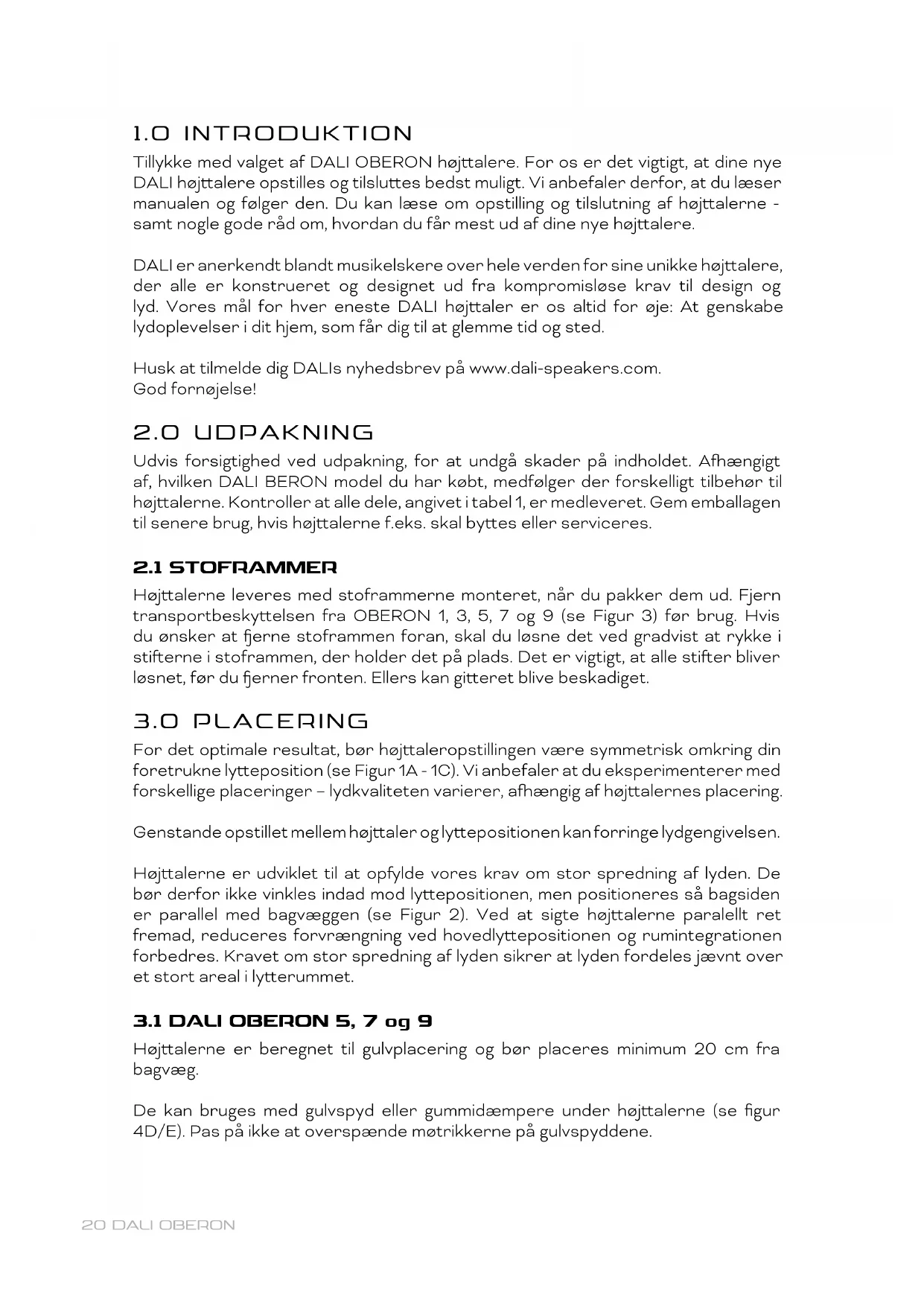 Tillykke med valget af DALI OBERON højalere. For os er det vigtigt, at dine nye DALI højalere opstilles og tilslues bedst muligt. Vi anbefaler derfor, at du læser manualen og følger den. Du kan læse om opstilling og tilslutning af højalerne - samt nogle gode råd om, hvordan du får mest ud af dine nye højalere. DALI er anerkendt blandt musikelskere over hele verden for sine unikke højalere, der alle er konstrueret og designet ud fra kompromisløse krav til design og lyd. Vores mål for hver eneste DALI højaler er os altid for øje: At genskabe lydoplevelser i dit hjem, som får dig til at glemme tid og sted. Husk at tilmelde dig DALIs nyhedsbrev på www.dali-speakers.com. God fornøjelse!