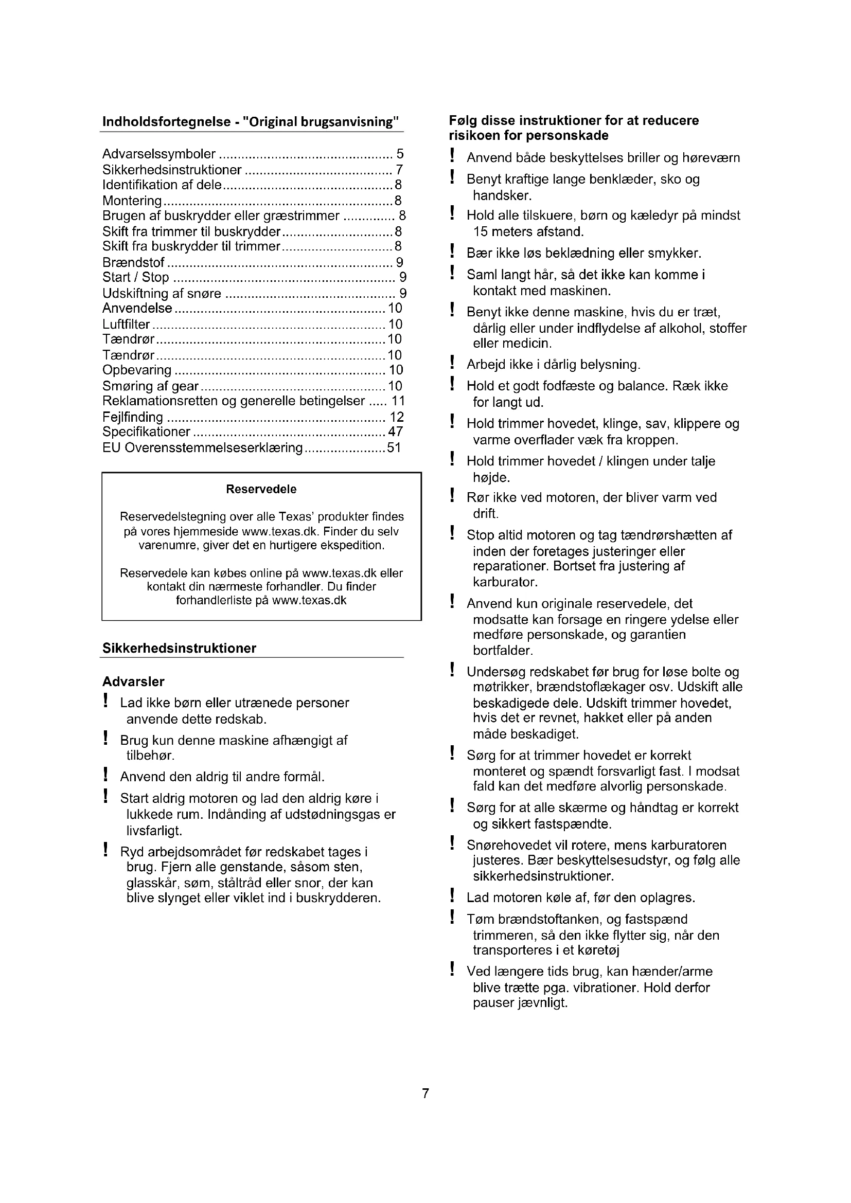Følg disse instruktioner for at reducere risikoen for personskade ! Anvend både beskyttelses briller og høreværn ! Benyt kraftige lange benklæder, sko og handsker. ! Hold alle tilskuere, børn og kæledyr på mindst 15 meters afstand. ! Bær ikke løs beklædning eller smykker. ! Saml langt hår, så det ikke kan komme i kontakt med maskinen. ! Benyt ikke denne maskine, hvis du er træt, dårlig eller under indflydelse af alkohol, stoffer eller medicin. ! Arbejd ikke i dårlig belysning. ! Hold et godt fodfæste og balance. Ræk ikke for langt ud. ! Hold trimmer hovedet, klinge, sav, klippere og varme overflader væk fra kroppen. ! Hold trimmer hovedet / klingen under talje højde. ! Rør ikke ved motoren, der bliver varm ved drift. ! Stop altid motoren og tag tændrørshætten af inden der foretages justeringer eller reparationer. Bortset fra justering af karburator. ! Anvend kun originale reservedele, det modsatte kan forsage en ringere ydelse eller medføre personskade, og garantien bortfalder. ! Undersøg redskabet før brug for løse bolte og møtrikker, brændstoflækager osv. Udskift alle beskadigede dele. Udskift trimmer hovedet, hvis det er revnet, hakket eller på anden måde beskadiget. ! Sørg for at trimmer hovedet er korrekt monteret og spændt forsvarligt fast. I modsat fald kan det medføre alvorlig personskade. ! Sørg for at alle skærme og håndtag er korrekt og sikkert fastspændte. ! Snørehovedet vil rotere, mens karburatoren justeres. Bær beskyttelsesudstyr, og følg alle sikkerhedsinstruktioner. ! Lad motoren køle af, før den oplagres. ! Tøm brændstoftanken, og fastspænd trimmeren, så den ikke flytter sig, når den transporteres i et køretøj ! Ved længere tids brug, kan hænder/arme blive trætte pga. vibrationer. Hold derfor pauser jævnligt.