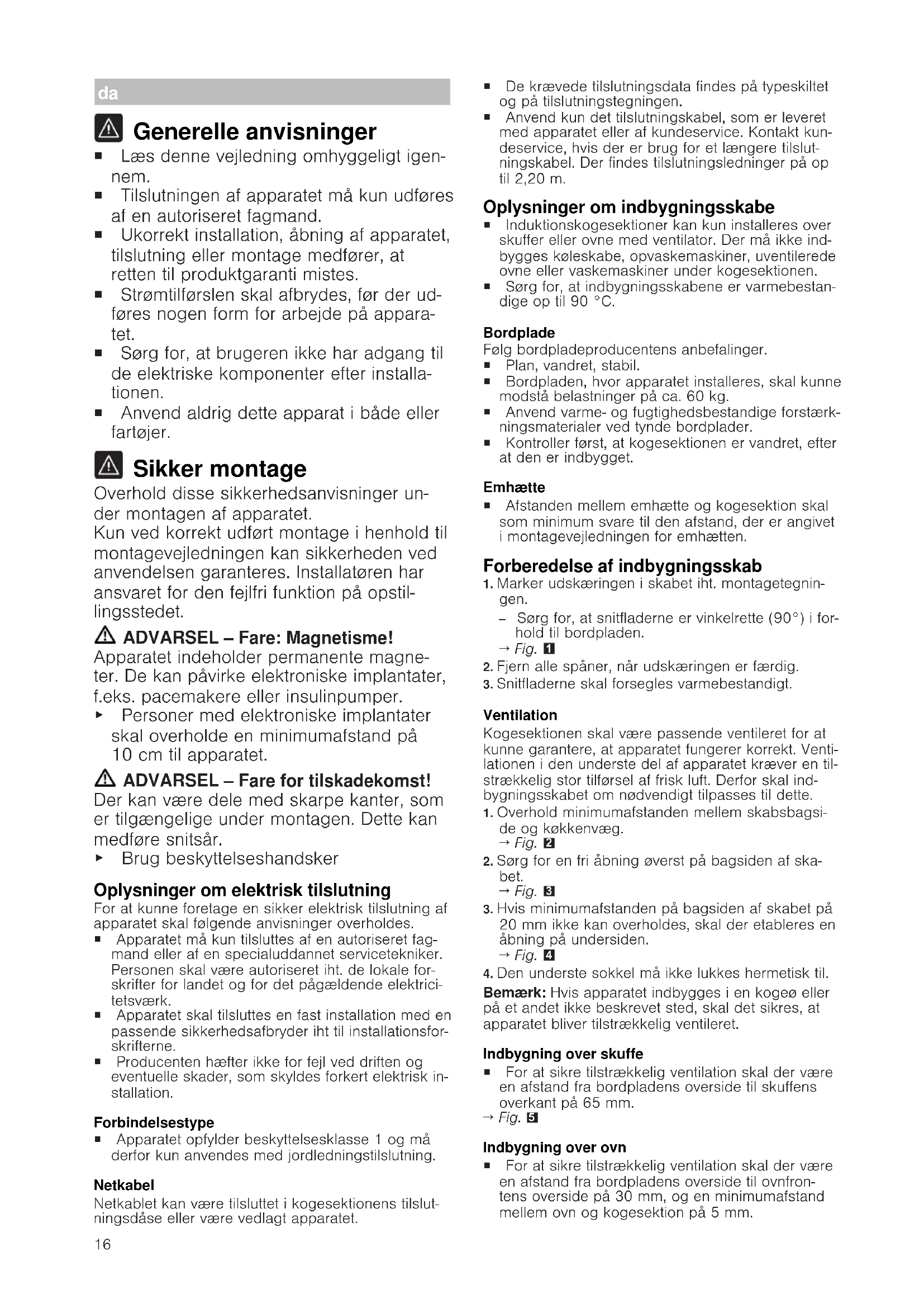 Generelle anvisninger ¡ Læs denne vejledning omhyggeligt igen- nem. ¡ Tilslutningen af apparatet må kun udføres af en autoriseret fagmand. ¡ Ukorrekt installation, åbning af apparatet, tilslutning eller montage medfører, at retten til produktgaranti mistes. ¡ Strømtilførslen skal afbrydes, før der ud- føres nogen form for arbejde på appara- tet. ¡ Sørg for, at brugeren ikke har adgang til de elektriske komponenter efter installa- tionen. ¡ Anvend aldrig dette apparat i både eller fartøjer. Sikker montage Overhold disse sikkerhedsanvisninger un- der montagen af apparatet. Kun ved korrekt udført montage i henhold til montagevejledningen kan sikkerheden ved anvendelsen garanteres. Installatøren har ansvaret for den fejlfri funktion på opstil- lingsstedet. ADVARSEL‒Fare: Magnetisme! Apparatet indeholder permanente magne- ter. De kan påvirke elektroniske implantater, f.eks. pacemakere eller insulinpumper. ▶ Personer med elektroniske implantater skal overholde en minimumafstand på 10cm til apparatet. ADVARSEL‒Fare for tilskadekomst! Der kan være dele med skarpe kanter, som er tilgængelige under montagen. Dette kan medføre snitsår. ▶ Brug beskyttelseshandsker Oplysninger om elektrisk tilslutning For at kunne foretage en sikker elektrisk tilslutning af apparatet skal følgende anvisninger overholdes. ¡ Apparatet må kun tilsluttes af en autoriseret fag- mand eller af en specialuddannet servicetekniker. Personen skal være autoriseret iht. de lokale for- skrifter for landet og for det pågældende elektrici- tetsværk. ¡ Apparatet skal tilsluttes en fast installation med en passende sikkerhedsafbryder iht til installationsfor- skrifterne. ¡ Producenten hæfter ikke for fejl ved driften og eventuelle skader, som skyldes forkert elektrisk in- stallation. Forbindelsestype ¡ Apparatet opfylder beskyttelsesklasse 1 og må derfor kun anvendes med jordledningstilslutning. Netkabel Netkablet kan være tilsluttet i kogesektionens tilslut- ningsdåse eller være vedlagt apparatet. ¡ De krævede tilslutningsdata findes på typeskiltet og på tilslutningstegningen. ¡ Anvend kun det tilslutningskabel, som er leveret med apparatet eller af kundeservice. Kontakt kun- deservice, hvis der er brug for et længere tilslut- ningskabel. Der findes tilslutningsledninger på op til 2,20m. Oplysninger om indbygningsskabe ¡ Induktionskogesektioner kan kun installeres over skuffer eller ovne med ventilator. Der må ikke ind- bygges køleskabe, opvaskemaskiner, uventilerede ovne eller vaskemaskiner under kogesektionen. ¡ Sørg for, at indbygningsskabene er varmebestan- dige op til 90°C. Bordplade Følg bordpladeproducentens anbefalinger. ¡ Plan, vandret, stabil. ¡ Bordpladen, hvor apparatet installeres, skal kunne modstå belastninger på ca. 60kg. ¡ Anvend varme- og fugtighedsbestandige forstærk- ningsmaterialer ved tynde bordplader. ¡ Kontroller først, at kogesektionen er vandret, efter at den er indbygget. Emhætte ¡ Afstanden mellem emhætte og kogesektion skal som minimum svare til den afstand, der er angivet i montagevejledningen for emhætten. Forberedelse af indbygningsskab