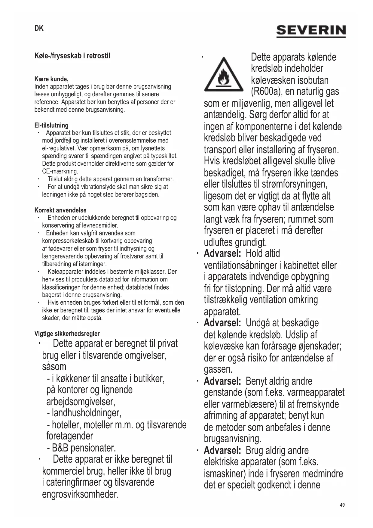 Dette apparats kølende kredsløb indeholder kølevæsken isobutan (R600a), en naturlig gas som er miljøvenlig, men alligevel let antændelig. Sørg derfor altid for at ingen af komponenterne i det kølende kredsløb bliver beskadigede ved transport eller installering af fryseren. Hvis kredsløbet alligevel skulle blive beskadiget, må fryseren ikke tændes eller tilsluttes til strømforsyningen, ligesom det er vigtigt da at ytte alt som kan være ophav til antændelse langt væk fra fryseren; rummet som fryseren er placeret i må derefter udluftes grundigt. ∙ Advarsel: Hold altid ventilationsåbninger i kabinettet eller i apparatets indvendige opbygning fri for tilstopning. Der må altid være tilstrækkelig ventilation omkring apparatet. ∙ Advarsel: Undgå at beskadige det kølende kredsløb. Udslip af kølevæske kan forårsage øjenskader; der er også risiko for antændelse af gassen. ∙ Advarsel: Benyt aldrig andre genstande (som f.eks. varmeapparatet eller varmeblæsere) til at fremskynde afrimning af apparatet; benyt kun de metoder som anbefales i denne brugsanvisning. ∙ Advarsel: Brug aldrig andre elektriske apparater (som f.eks. ismaskiner) inde i fryseren medmindre det er specielt godkendt i denne50 142 x 208 mm brugsanvisning. ∙ Inden tilslutning til strømforsyningen må fryseren og ledningen altid efterses grundigt for mulige transportskader. Hvis den form for beskadigelse bliver forefundet, må apparatet ikke tilsluttes til strømforsyningen. ∙ Når enheden installeres er det vigtigt, at ledningen ikke er fastklemt, eller på anden måde bliver beskadiget. ∙ Variable multistikdåser eller strømforsyninger må ikke anbringes på enhedens bagside. ∙ Dette apparat er ikke beregnet til opbevaring af eksplosive substanser såsom spraydåser med brændbar drivgas. ∙ Ved købet samt ved videregivelse eller aevering til genanvendelse skal der gøres opmærksom på, at enheden indeholder drivmidlet cyclopentan