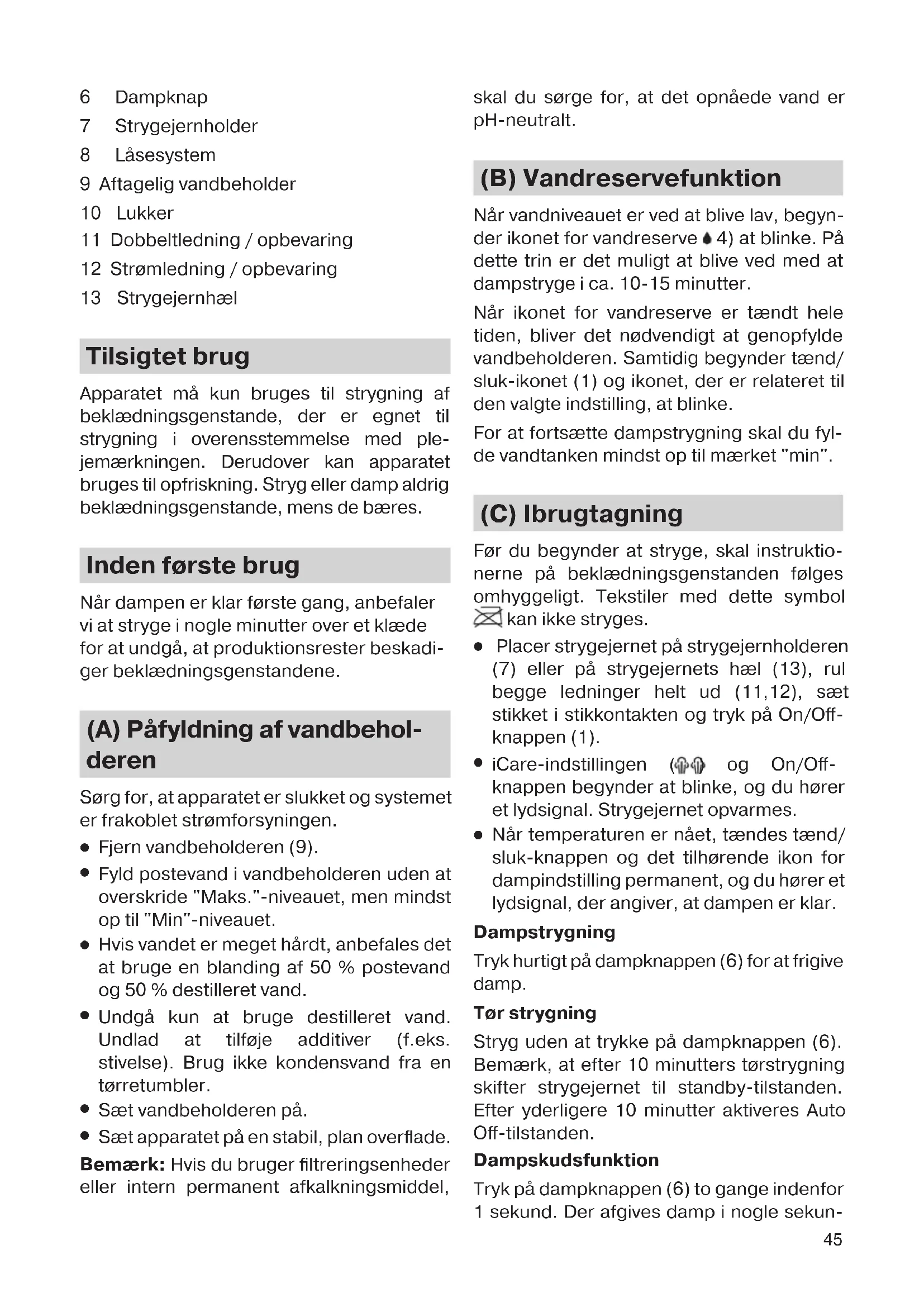 dette trin er det muligt at blive ved med at dampstryge i ca. 10-15 minutter. Når ikonet for vandreserve er tændt hele tiden, bliver det nødvendigt at genopfylde vandbeholderen. Samtidig begynder tænd/ sluk-ikonet (1) og ikonet, der er relateret til den valgte indstilling, at blinke. For at fortsætte dampstrygning skal du fyl- de vandtanken mindst op til mærket "min". (C) Ibrugtagning Før du begynder at stryge, skal instruktio- nerne på beklædningsgenstanden følges omhyggeligt. Tekstiler med dette symbol kan ikke stryges.