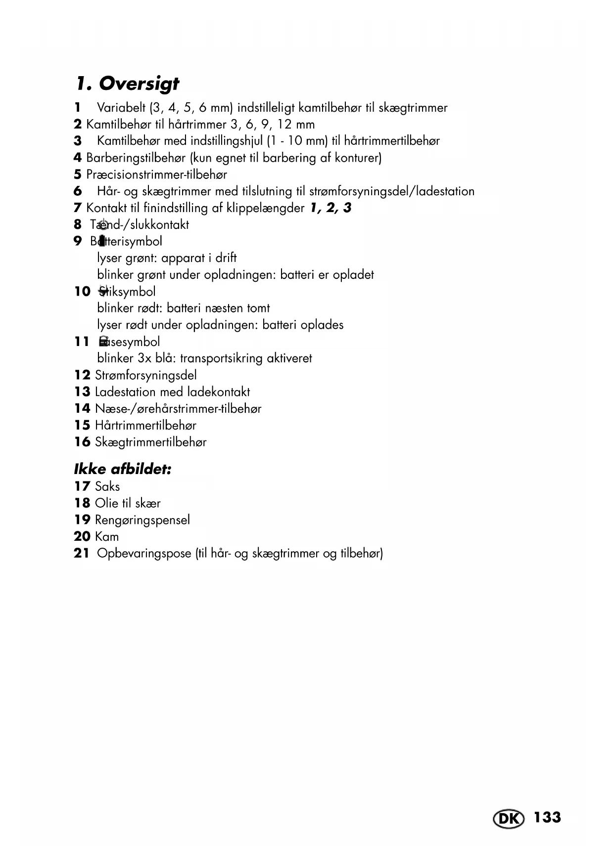 Kamtilbehør med indstillingshjul (1 - 10 mm) til hårtrimmertilbehør 4 Barberingstilbehør (kun egnet til barbering af konturer) 5 Præcisionstrimmer-tilbehør 6 Hår- og skægtrimmer med tilslutning til strømforsyningsdel/ladestation 7 Kontakt til finindstilling af klippelængder 1, 2, 3 8 Tænd-/slukkontakt 9 Batterisymbol lyser grønt: apparat i drift blinker grønt under opladningen: batteri er opladet 10 Stiksymbol blinker rødt: batteri næsten tomt lyser rødt under opladningen: batteri oplades 11 Låsesymbol blinker 3x blå: transportsikring aktiveret 12 Strømforsyningsdel 13 Ladestation med ladekontakt 14 Næse-/ørehårstrimmer-tilbehør 15 Hårtrimmertilbehør 16 Skægtrimmertilbehør Ikke afbildet: 17 Saks 18 Olie til skær 19 Rengøringspensel 20 Kam