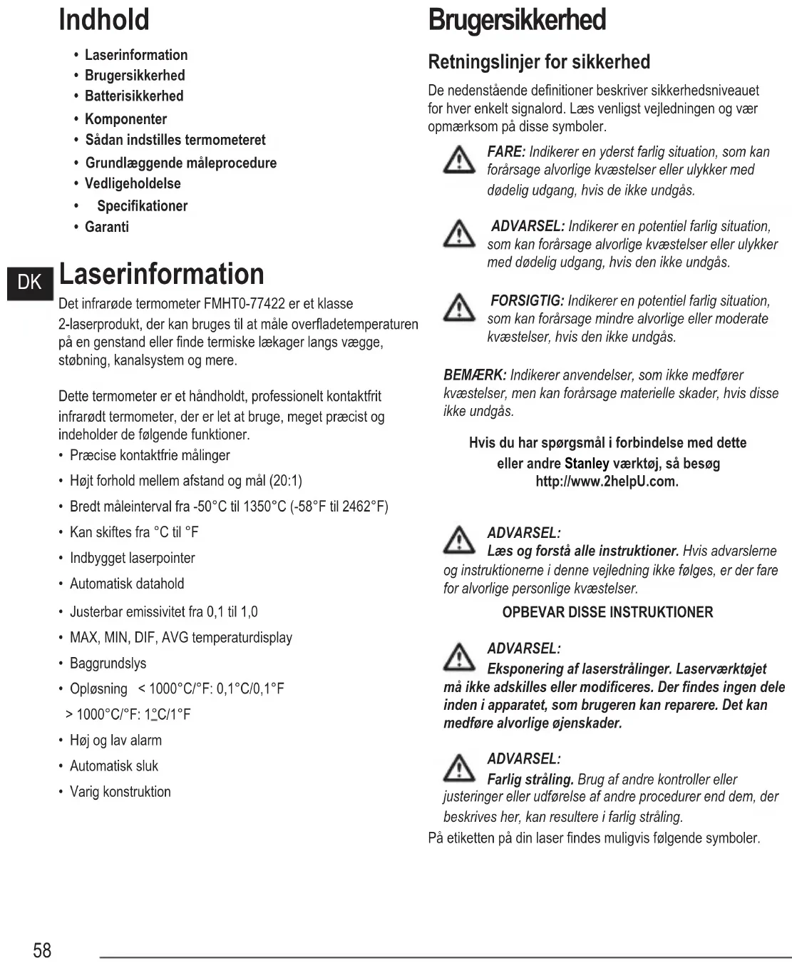 Denne garanti dækker ikke mangler, der skyldes utilsigtet skade, slitage, brug der ikke er i overensstemmelse med producentens anvisninger eller reparation eller ændring af dette produkt, der ikke er autoriseret af Stanley. Reparation eller udskiftning i henhold til denne garanti påvirker ikke udløbsdatoen for garantien. I det omfang loven tillader det, vil Stanley ikke være ansvarlige under denne garanti for indirekte skader eller følgeskader som følge af fejl og mangler i dette produkt. Denne garanti kan ikke ændres uden tilladelse fra Stanley. Denne garanti påvirker ikke forbrugernes lovmæssige rettigheder ved køb af dette produkt. Denne garanti er underlagt og fortolkes i overensstemmelse med lovgivningen i det land, produktet blev solgt og Stanley og køberen accepterer uigenkaldeligt at underkaste sig den eksklusive kompetence fra domstolene i dette land mod ethvert krav eller spørgsmål, der opstår under eller i forbindelse med denne garanti. Kalibrering og pleje er ikke dækket af garantien. BEMÆRK: Kunden er ansvarlig for korrekt brug og pleje af enheden. Desuden er kunden ansvarlig for regelmæssig kontrol af laserenhedens nøjagtighed og også for kalibrering af enheden. Denne vejledning er genstand for ændringer under varsel.