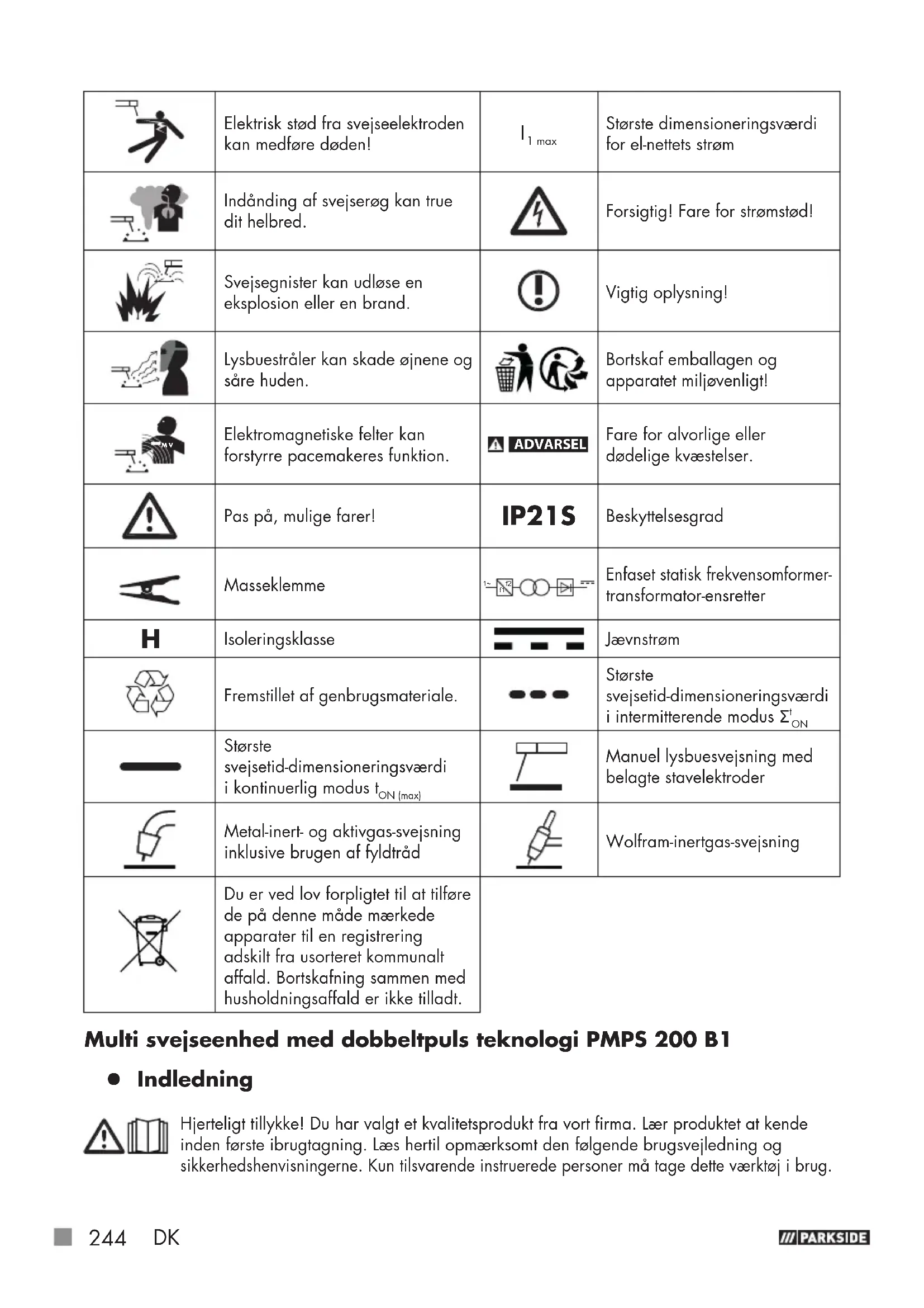 Største svejsetid-dimensioneringsværdi i kontinuerlig modus t ON (max) Manuel lysbuesvejsning med belagte stavelektroder Metal-inert- og aktivgas-svejsning inklusive brugen af fyldtråd Wolfram-inertgas-svejsning Du er ved lov forpligtet til at tilføre de på denne måde mærkede apparater til en registrering adskilt fra usorteret kommunalt affald. Bortskafning sammen med husholdningsaffald er ikke tilladt. Multi svejseenhed med dobbeltpuls teknologi PMPS 200 B1 z Indledning Hjerteligt tillykke! Du har valgt et kvalitetsprodukt fra vort firma. Lær produktet at kende inden første ibrugtagning. Læs hertil opmærksomt den følgende brugsvejledning og sikkerhedshenvisningerne. Kun tilsvarende instruerede personer må tage dette værktøj i brug.DK